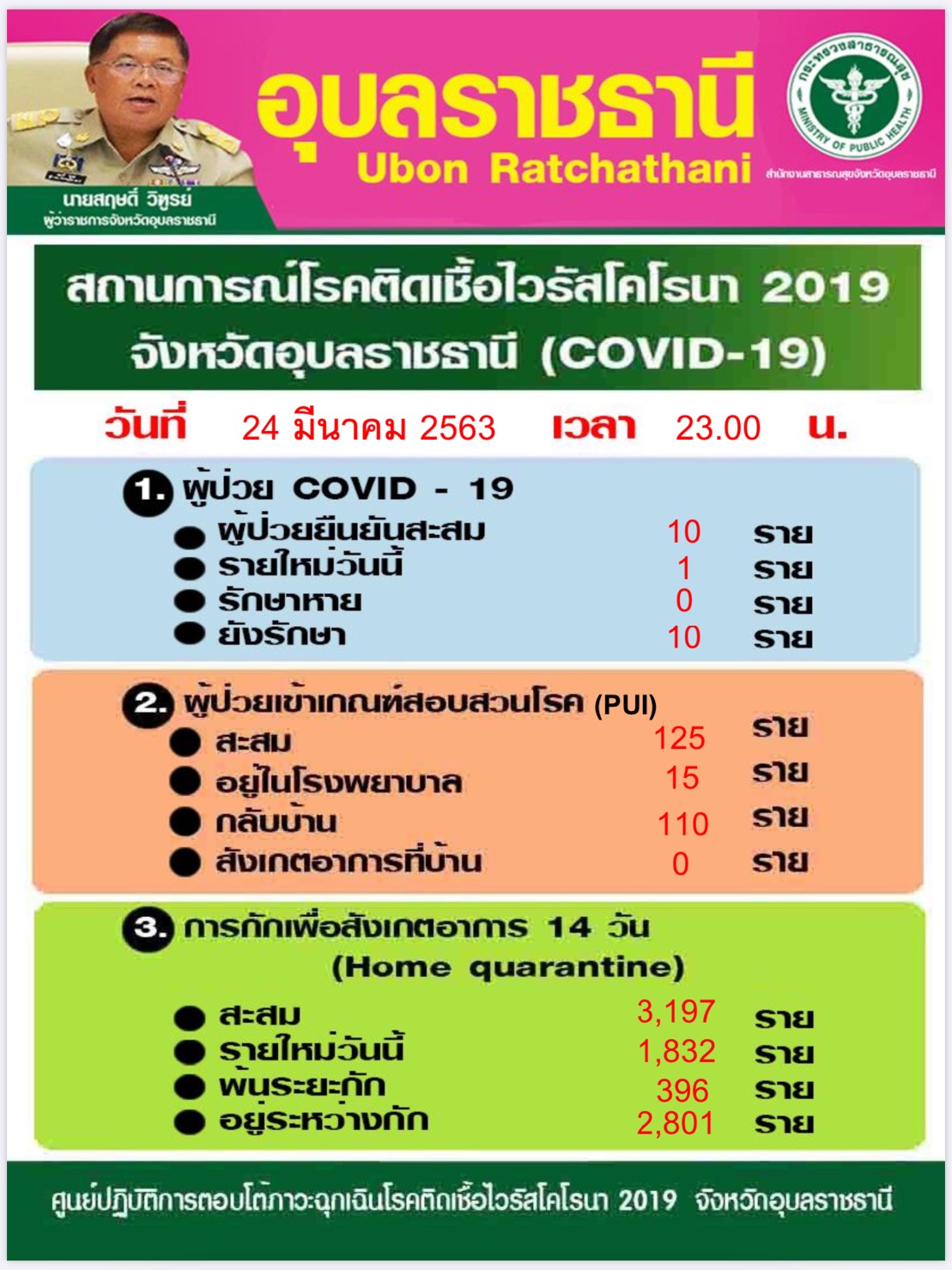 นายสฤษดิ์ วิฑูรย์ ผู้ว่าราชการจังหวัดอุบลราชธานี กล่าว ในที่ประชุม คณะกรรมการจังหวัดหัวหน้าส่วนราชการ หัวหน้าหน่วยงานรัฐวิสาหกิจ จังหวัดอุบลราชธานี ในเดือนมีนาคม 2563 ว่า ศูนย์ปฏิบัติการโต้ตอบภาวะฉุกเฉิน สำนักงานสาธารณสุขจังหวัดอุบลราชธานี รายงานสถานการณ์โรคติดเชื้อไวรัสโคโรนา 2019 ในจังหวัดอุบลราชธานี ณ วันที่ 24 มีนาคม 2563 มีผู้ติดเชื้อทั้งสิ้น 10 ราย โดยเป็นผู้ติดเชื้อรายใหม่ 1 ราย แบ่งเป็นกลุ่มเซียนมวยที่ไปชมมวยที่สนามมวยลุมพินี 4 ราย และแพร่เชื้อให้ภรรยา 2 ราย รวมเป็น 6 ราย กลุ่มพนักงานบริการจากตลาดปอยเปต จังหวัดสระแก้ว 1 ราย พนักงานผับจากกรุงเทพ 1 ราย คนขับแท็กซี่ในจังหวัดอุบลราชธานี 1 ราย และผู้เดินทางกลับจากประเทศอังกฤษ 1 ราย ผู้ป่วยเข้าเกณฑ์สอบสวนโรค 125 ราย ตรวจไม่พบเชื้อ 110 ราย ซึ่งทั้งหมดได้กลับบ้านแล้ว ตรวจพบเชื้อ 10 ราย และรอผลตรวจ 5 ราย ทั้ง 15 ราย