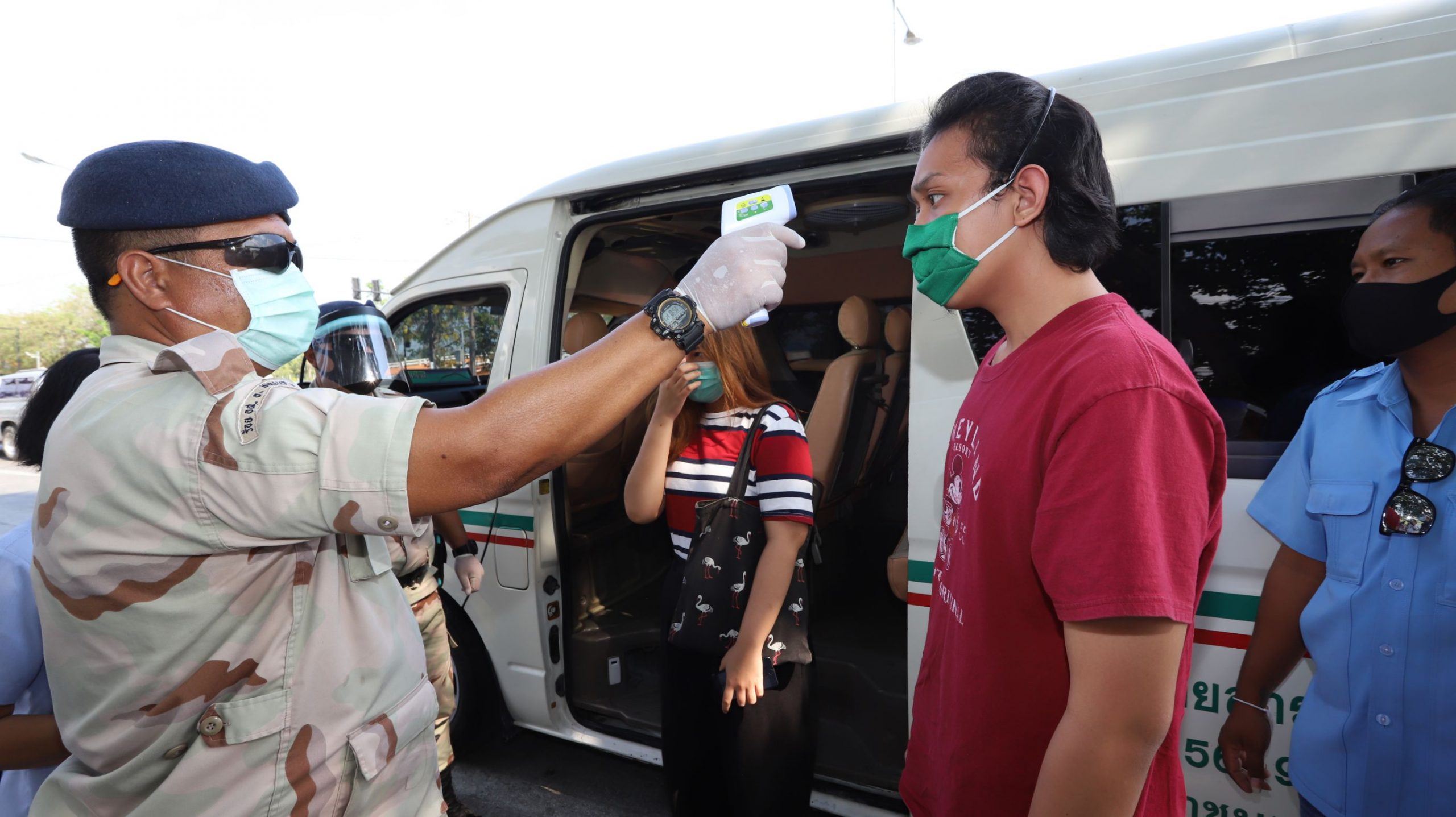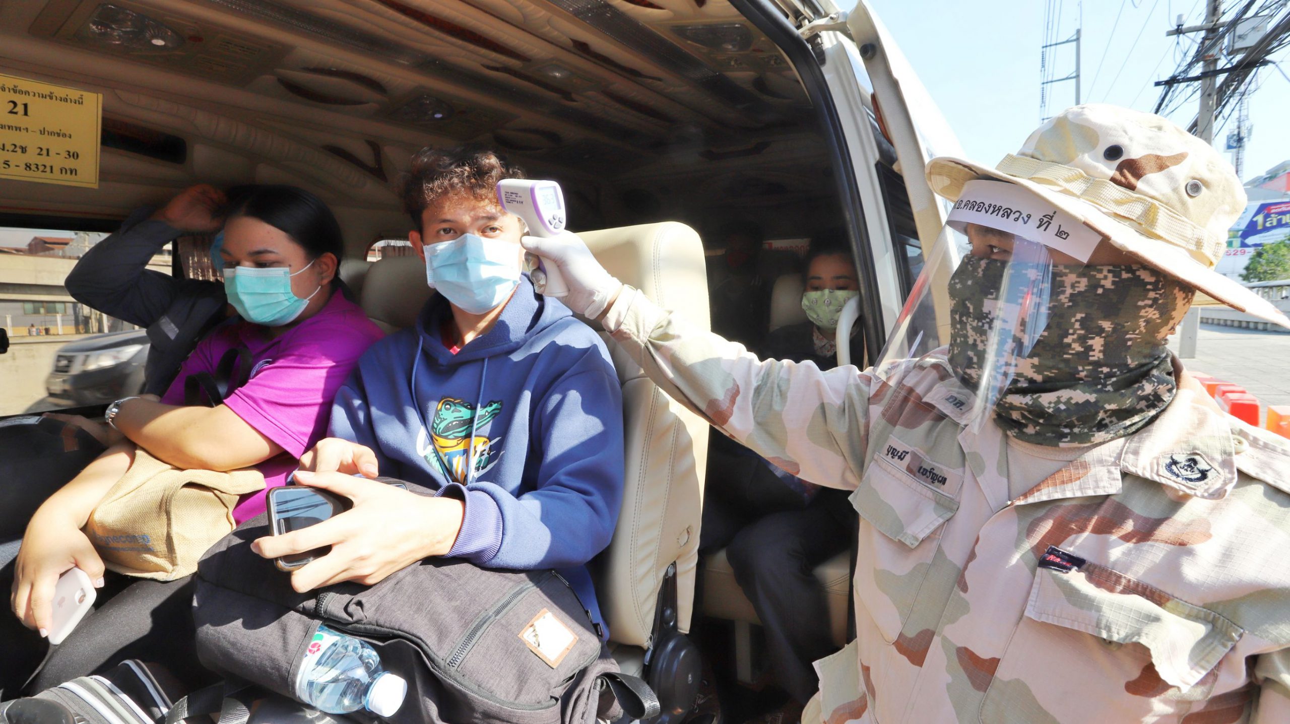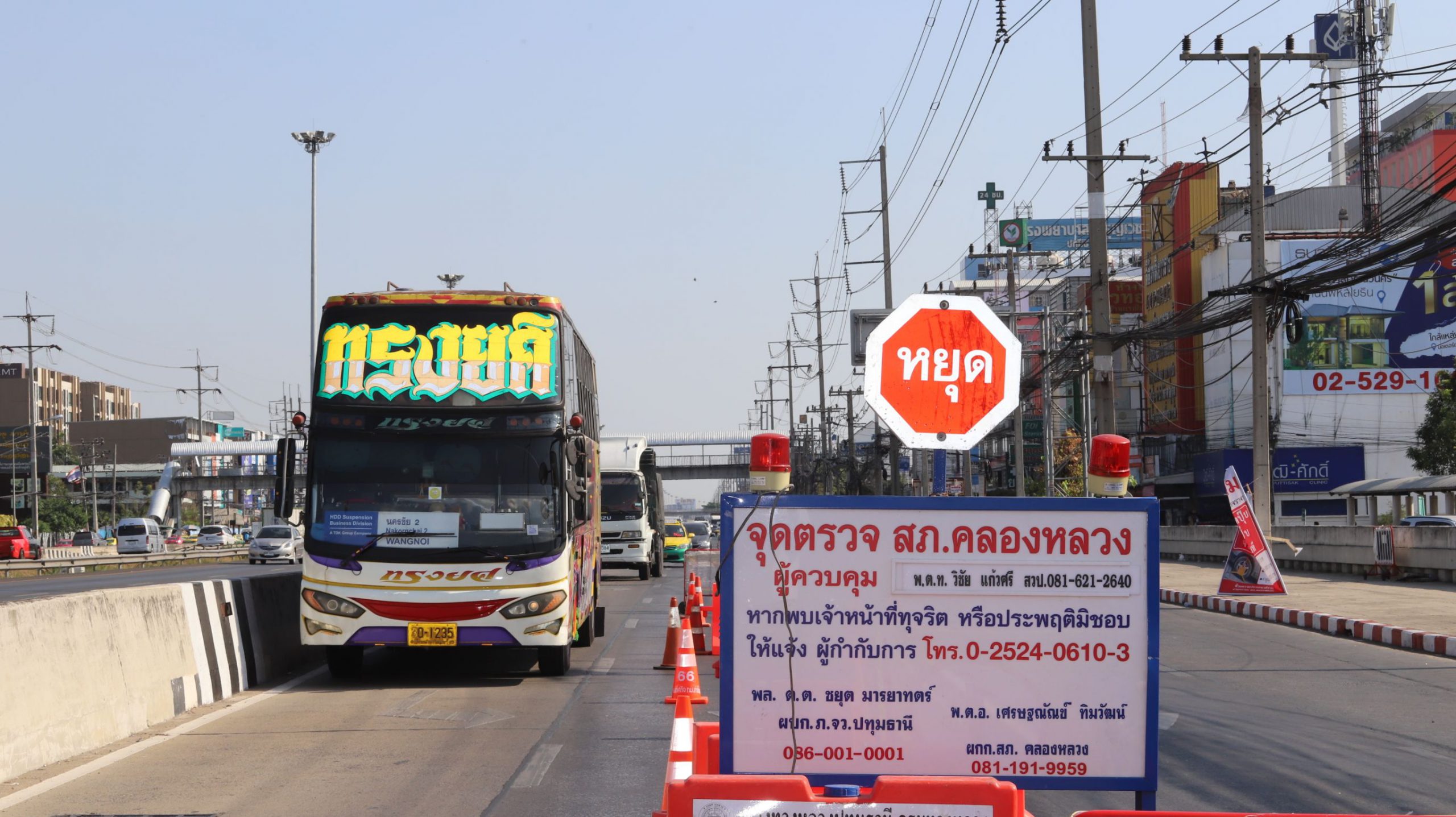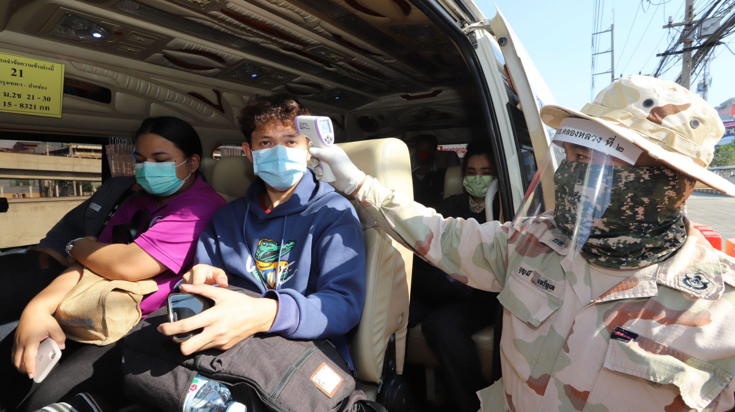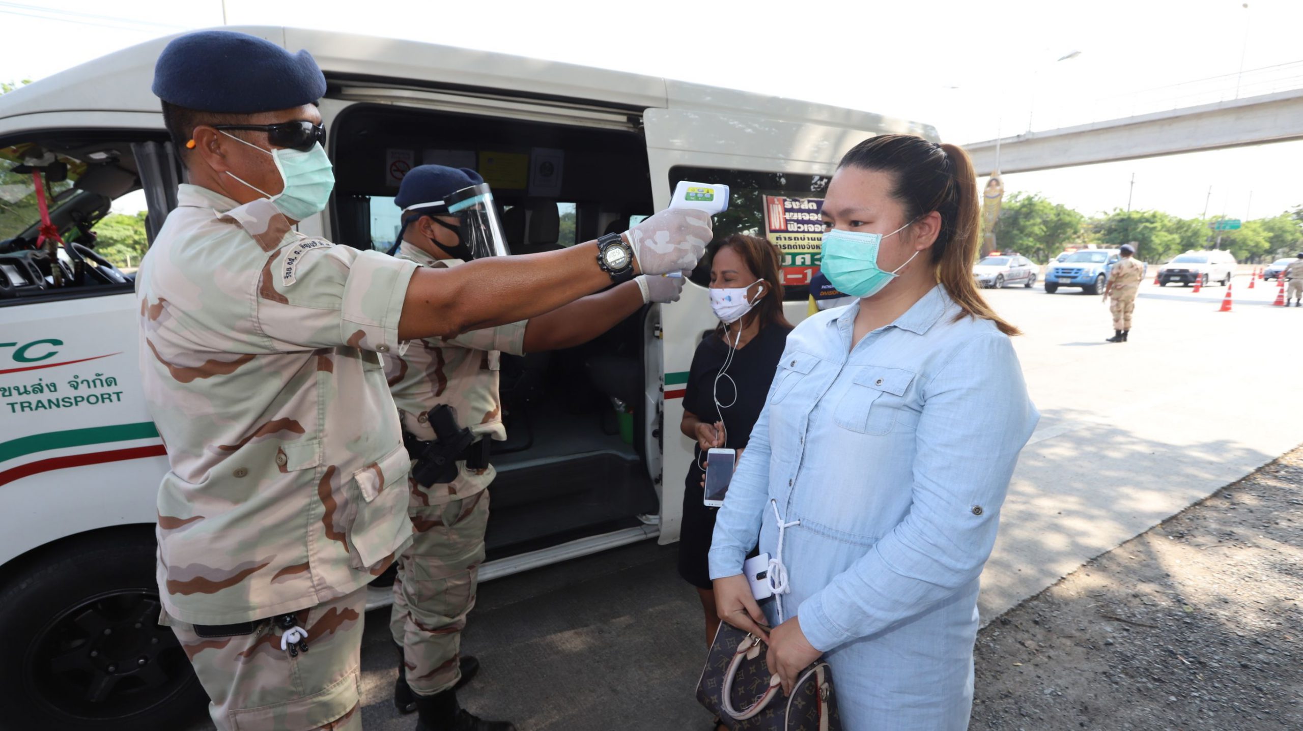 และที่จุดสกัดบริเวณถนนพหลโยธิน ขาออก กม.46+400 หน้าห้างเทสโก้โลตัส ต.คลองหนึ่ง อ.คลองหลวง จ.ปทุมธานี เมื่อรถมาถึงจุดตรวจ เจ้าหน้าที่ฯก็จะทำการซักประวัติการเดินทาง ตรวจวัดไข้ และให้คำให้แนะนำผู้โดยสารที่นั่งในรถ โดยควรเว้นระยะห่างจากกัน และหากตรวจพบว่ามีประชาชนเป็นไข้สูงเกิน 37.5 องศา ก็จะส่งให้ทีมเจ้าหน้าที่สาธารณสุขทำการคัดกรอง สอบถามประวัติว่าอยู่ในกลุ่มเสี่ยงหรือไม่ หากพบว่าอยู่ในกลุ่มเสี่ยงก็จะนำตัวส่งโรงพยาบาลทันที อย่างไรก็ตามจุดตรวจดังกล่าวจะผลัดเปลี่ยนหมุนเวียนกันมาประจำตลอด 24 ชั่วโมง