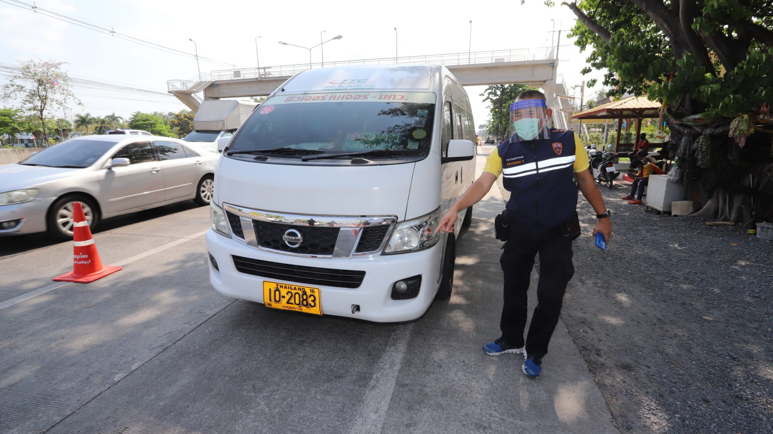 จากนั้นผู้สื่อข่าวพร้อมนายแพทย์สุรินทร์ สืบซึ้ง นายแพทย์สาธารณสุขจังหวัดปทุมธานีได้ลงพื้นที่มาติดตามการตั้งจุดตรวจตามถนน บริเวณหน้าโรงพยาบาลธัญบุรี คลอง6 ถนน รังสิต นครนายก อำเภอธัญบุรี เพื่อป้องกันอุบัติเหตุ และลดความเสี่ยงต่อการแพร่เชื้อไวรัสโควิด-19 นายแพทย์สุรินทร์ สืบซึ้ง นายแพทย์สาธารณสุขจังหวัดปทุมธานีกล่าว่า การตรวจของเจ้าหน้าที่จะเน้นตรวจคัดกรองรถที่เดินทางเข้ามาในพื้นที่ โดยเฉพาะรถตู้โดยสาร รถเมล์โดยสาร รถที่มีผู้สูงอายุเกินกว่า 70 ปี และเด็กที่อายุต่ำกว่า 5 ขวบ เมื่อรถมาถึงจุดตรวจก็มีการซักประวัติการเดินทาง มีการตรวจวัดอุณหภูมิ และให้คำแนะนำเกี่ยวกับการป้องกันไวรัสโควิด-19 และหากผลตรวจพบว่าประชาชนมีอาการเป็นไข้สูง เจ้าหน้าที่สาธารณสุขจะซักประวัติว่าอยู่ในกลุ่มเสี่ยงหรือไม่ หากพบว่าอยู่ในกลุ่มเสี่ยงจะส่งไปโรงพยาบาลทันที ซึ่งทางโรงพยาบาลจะมีจุดสังเกตอาการ ถ้าพบผู้ป่วยมีไข้สูงกว่า 37.5 องศาซึ่งมีความเสี่ยงจะแยกผู้ป่วยมาที่จุดสังเกตุอาการ เพื่อรอผลตรวจของแลป