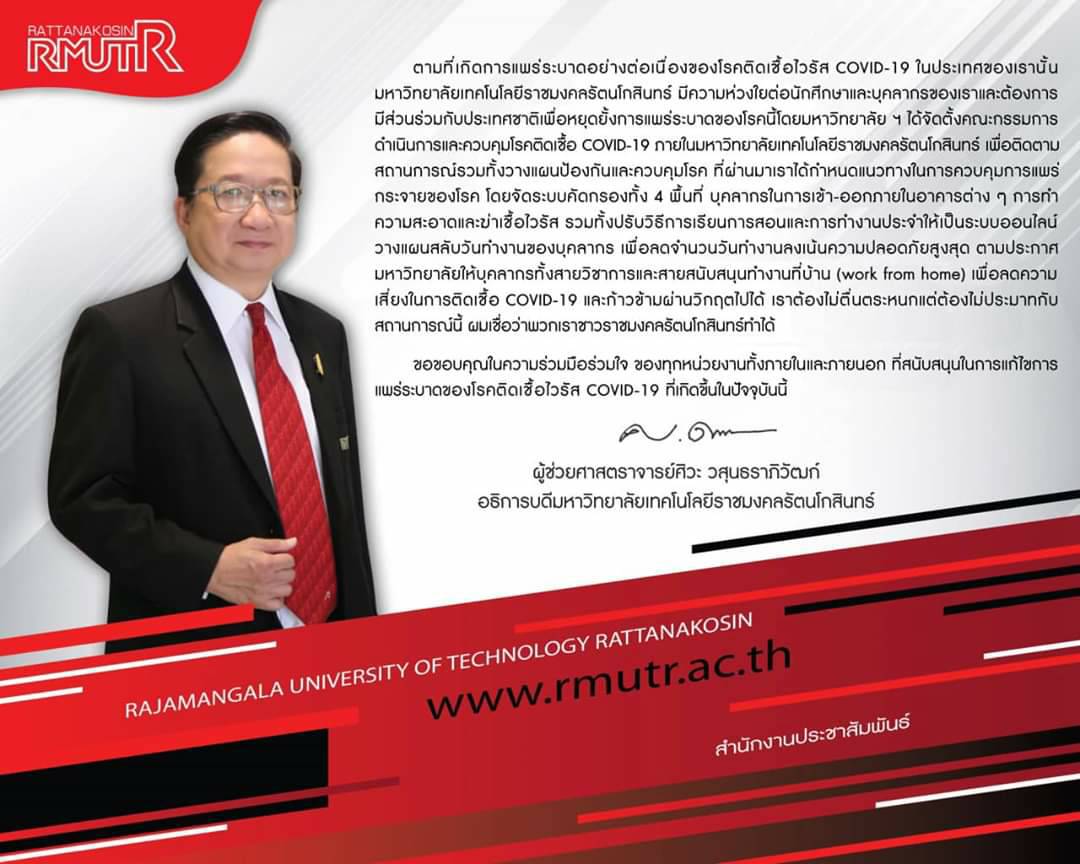 ตามที่เกิดการแพร่ระบาดอย่างต่อเนื่องของโรคติดเชื้อไวรัส COVID-19 ในประเทศของเรานั้น มหาวิทยาลัยเทคโนโลยีราชมงคลรัตนโกสินทร์ มีความห่วงใยต่อนักศึกษาและบุคลากรของเราและต้องการมีส่วนร่วมกับประเทศชาติเพื่อหยุดยั้งการแพร่ระบาดของโรคนี้โดยมหาวิทยาลัย ฯ ได้จัดตั้งคณะกรรมการดำเนินการและควบคุมโรคติดเชื้อ COVID-19 ภายในมหาวิทยาลัยเทคโนโลยีราชมงคลรัตนโกสินทร์ เพื่อติดตาม สถานการณ์รวมทั้งวางแผนป้องกันและควบคุมโรคที่ผ่านมาเราได้กำหนดแนวทางในการควบคุมการแพร่กระจายของโรค โดยจัดระบบคัดกรองทั้ง 4 พื้นที่ บุคลากรในการเข้า-ออกภายในอาคารต่าง ๆ การทำความสะอาดและฆ่าเชื้อไวรัส รวมทั้งปรับวิธีการเรียนการสอนและการทำงานประจำให้เป็นระบบออนไลน์ วางแผนสลับวันทำงานของบุคลากร เพื่อลดจำนวนวันทำงานลงเน้นความปลอดภัยสูงสุด ตามประกาศมหาวิทยาลัยให้บุคลากรทั้งสายวิชาการและสายสนับสนุนทำงานที่บ้าน (work from home) เพื่อลดความ เสี่ยงในการติดเชื้อ COVID-19 และก้าวข้ามผ่านวิกฤตไปได้ เราต้องไม่ตื่นตระหนกแต่ต้องไม่ประมาทกับ สถานการณ์นี้ ผมเชื่อว่าพวกเราชาวราชมงคลรัตนโกสินทร์ทำได้