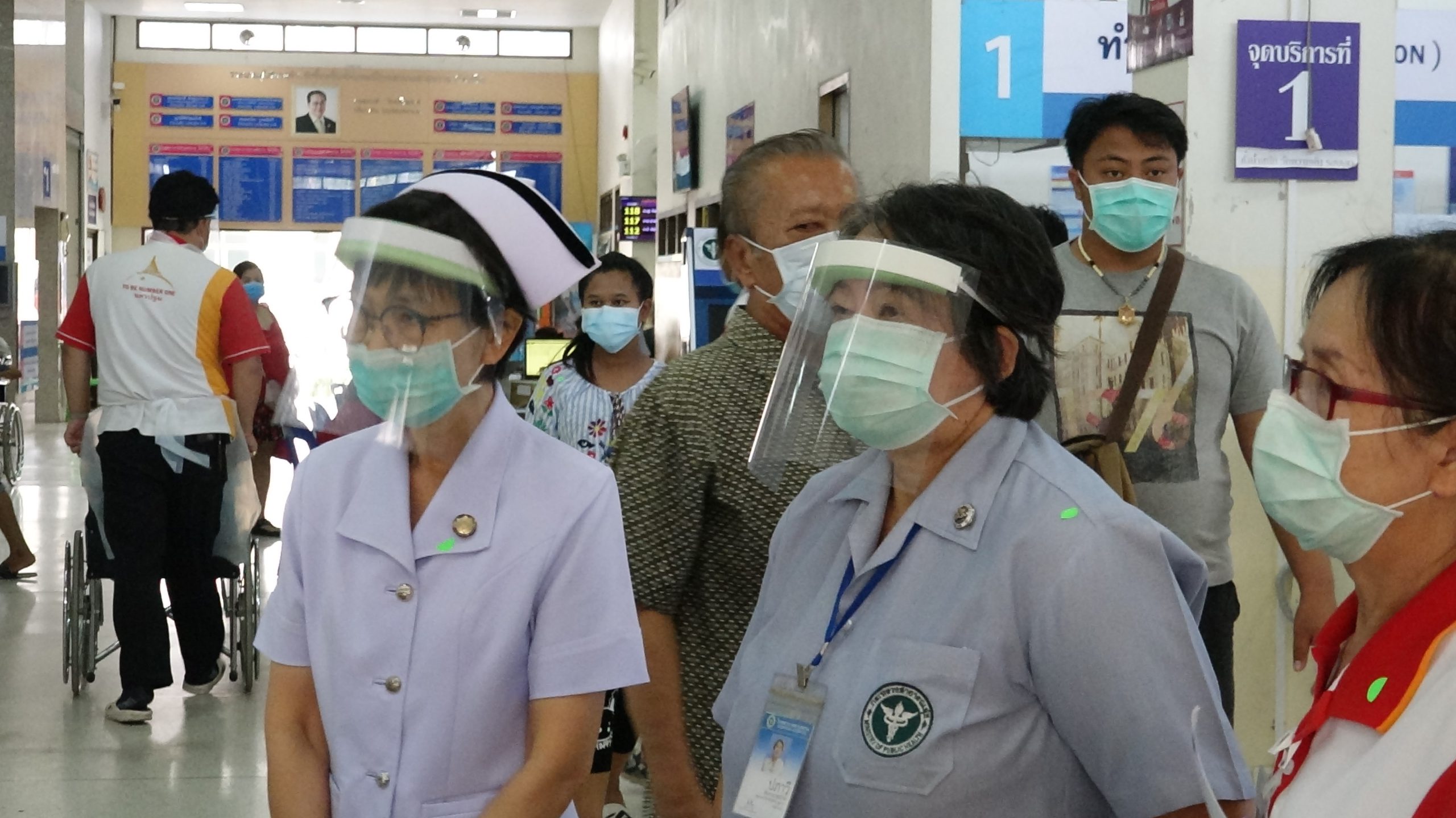 กองบุญเมืองไร่ขิงมอบเจลล้างมือและหน้ากากพลาสติกให้โรงพยาบาลสามพราน