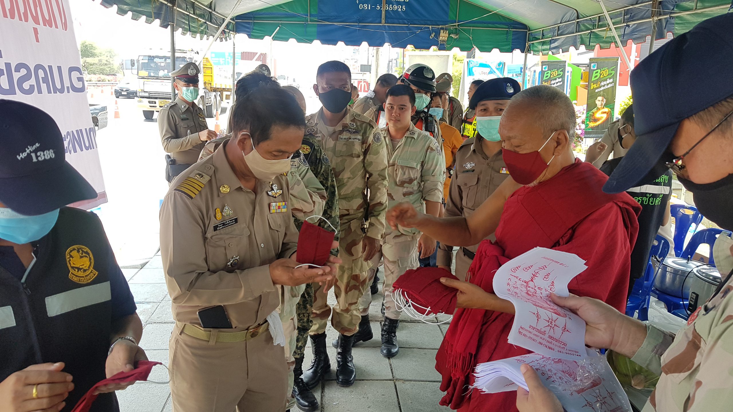 นครปฐม – เมื่อเวลา 12.00 น.ของวันที่ 27 มี.ค. 63 ผู้สื่อข่าวรายงานมาจากด่านสกัดและป้องกันการแพร่ระบาดเชื้อไวรัส โควิด 19 ซึ่งเป็น 1 ใน 4 ด่าน ที่จังหวัดนครปฐม ได้กำหนดไว้ให้ตั้งจุดตลอด 24 ช.ม. ที่ตั้งอยู่บริเวณด้านหน้าแขวงการทาง ต.ท่าตำหนัก ริมถนนเพชรเกษมขาเข้าเมืองนครปฐม พระครูยติธรรมานุยุต หรือหลวงพ่อแป๊ะ เกจิดังชื่อดังแห่งลุ่มน้ำนครชัยศรี เจ้าอาวาสวัดสว่างอารมณ์ ได้เดินทางนำ อาหาร ข้าวกล่อง กล้วยหอม น้ำดื่ม และหน้ากากอนามัยสีแดงกรัก จากจีวรของหลวงพ่อแป๊ะที่กลุ่มแม่บ้านตำบลขุนแก้วช่วยกันตัดเย็บให้ และผ้ายันต์มหาอุตม์ มามอบให้กับเจ้าหน้าที่ตำรวจทางหลวง เจ้าหน้าที่ทหาร สาธารณสุข และฝ่ายปกครอง เพื่อสร้างขวัญกำลังใจและความเป็นศิริมงคล ให้กับเจ้าหน้าที่ที่ปฏิบัติงานตรวจจุดคัดกรองป้องกันสถานการณ์การแพร่ระบาดของไวรัสโคโรน่า หรือ โควิด19 ตรวจประชาชนที่เดินทางเข้าออกกรุงเทพ