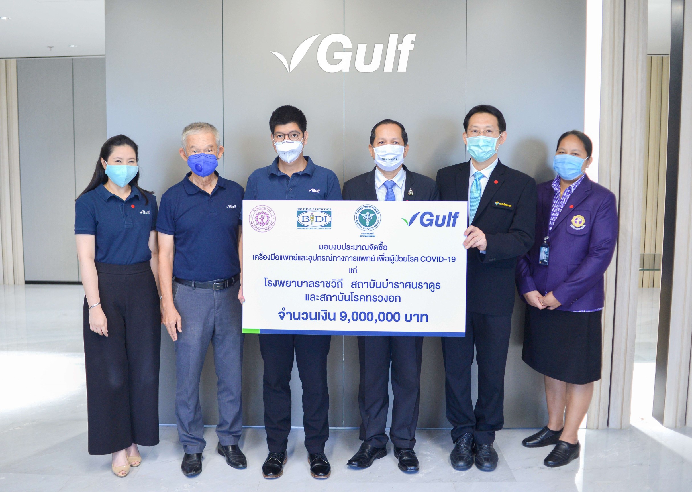 บริษัท กัลฟ์ เอ็นเนอร์จี ดีเวลลอปเมนท์ จำกัด (มหาชน) หรือ GULF มอบเงินสนับสนุนแก่โรงพยาบาลราชวิถี 4 ล้านบาท สถาบันบำราศนราดูร 4 ล้านบาท และสถาบันโรคทรวงอก 1 ล้านบาท เพื่อจัดซื้ออุปกรณ์ทางการแพทย์สำหรับการรักษาผู้ป่วย COVID-19 และผู้ป่วยภาวะการหายใจล้มเหลว เช่น เครื่องช่วยหายใจชนิดอัตราการไหลสูง (High Flow Oxygen Therapy Device) เครื่องช่วยหายใจชนิดแรงดันบวกสองระดับ (BiPAP) เครื่องช่วยหายใจชนิดเคลื่อนย้าย และเครื่องติดตามและเฝ้าระวังสัญญาณชีพผู้ป่วยแบบศูนย์กลาง เป็นต้น
