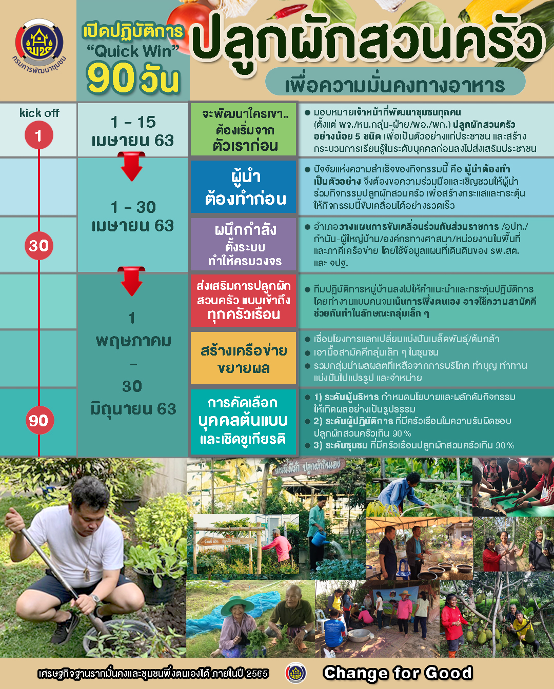 กรมการพัฒนาชุมชน จึงขอเชิญชวนพี่น้องชาวไทยทุกคนมาร่วมกันปลูกผักสวนครัว ไว้บริโภคในครัวเรือน ส่วนเมล็ดพันธ์ุ หรือกล้าพันธ์ุให้ใช้วิธีการแบ่งปันจากเพื่อนบ้านในจังหวัดเดียวกัน เช่น หน่อกล้วย ต้นกะเพรา ตะไคร้ หัวข่า มะกรูด มะนาว เป็นต้นผมเชื่อมั่นว่าถึงแม้สถานการณ์การแพร่ระบาดของเชื้อไวรัสโคโรนา 2019 (โควิด-19) จะรุนแรงขนาดไหน ระบบเศรษฐกิจต้องหยุดชะงักงัน การท่องเที่ยวที่เป็นเส้นเลือดสำคัญถูกกระทบ อัตราการว่างงานเพิ่มขึ้น สินค้าอุปโภคบริโภคกระทบหนัก ประกอบกับความตื่นตระหนกของผู้คนที่เกรงว่าสินค้าอุปโภคบริโภคจะขาดแคลน ดังปรากฏการณ์ประชาชนแย่งกันซื้อของ ในห้างสรรพสินค้าเพื่อไปกักตุน ถ้าทุกครัวเรือนทำได้ เราจะผ่านพ้นวิกฤตนี้ไปด้วยกันได้อย่างแน่นอน