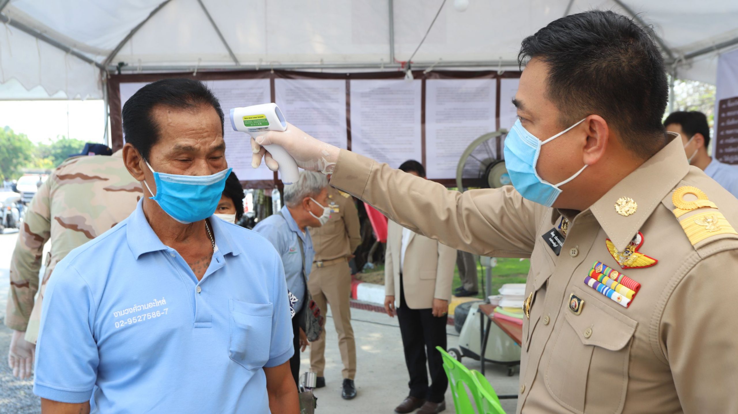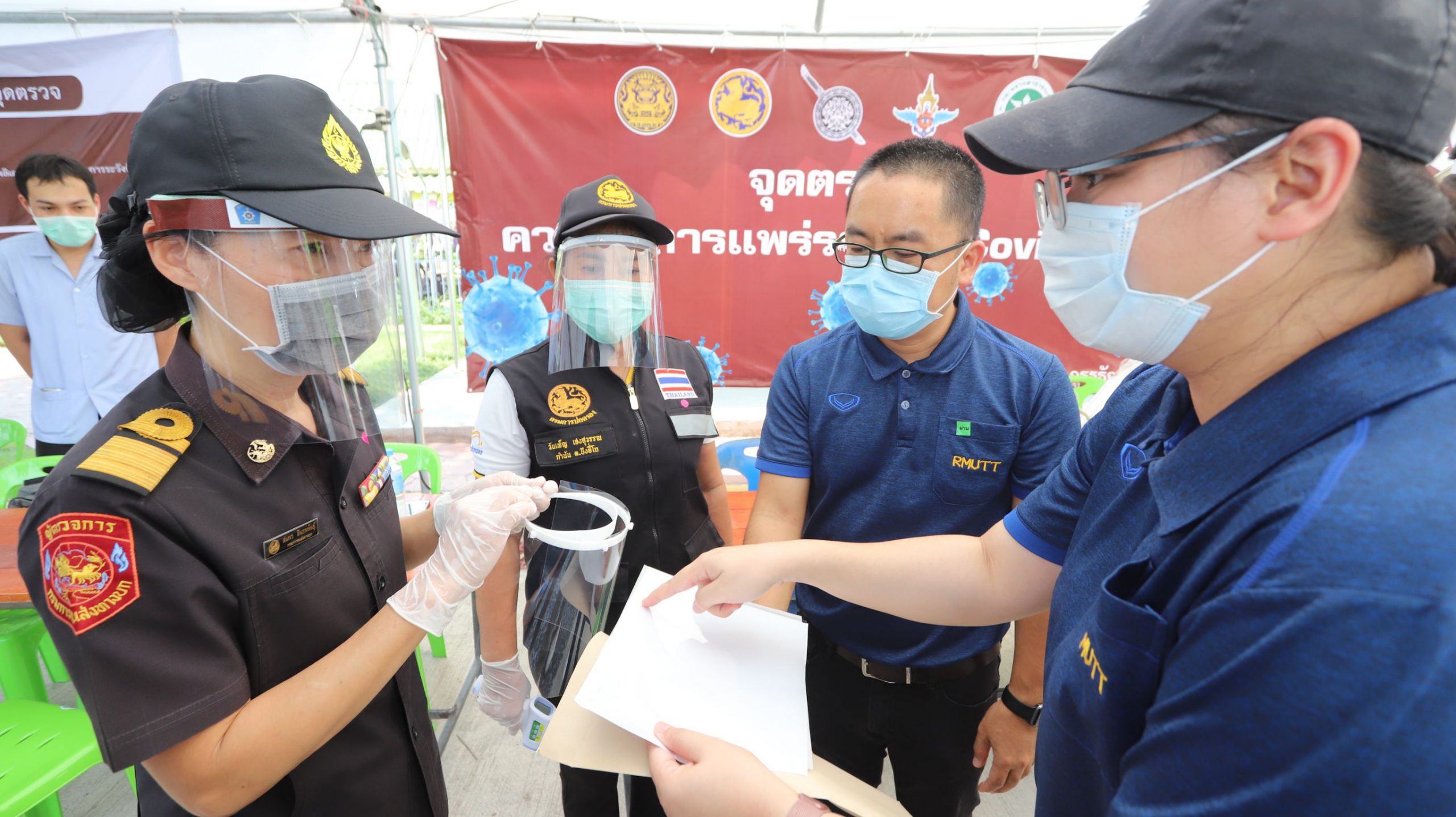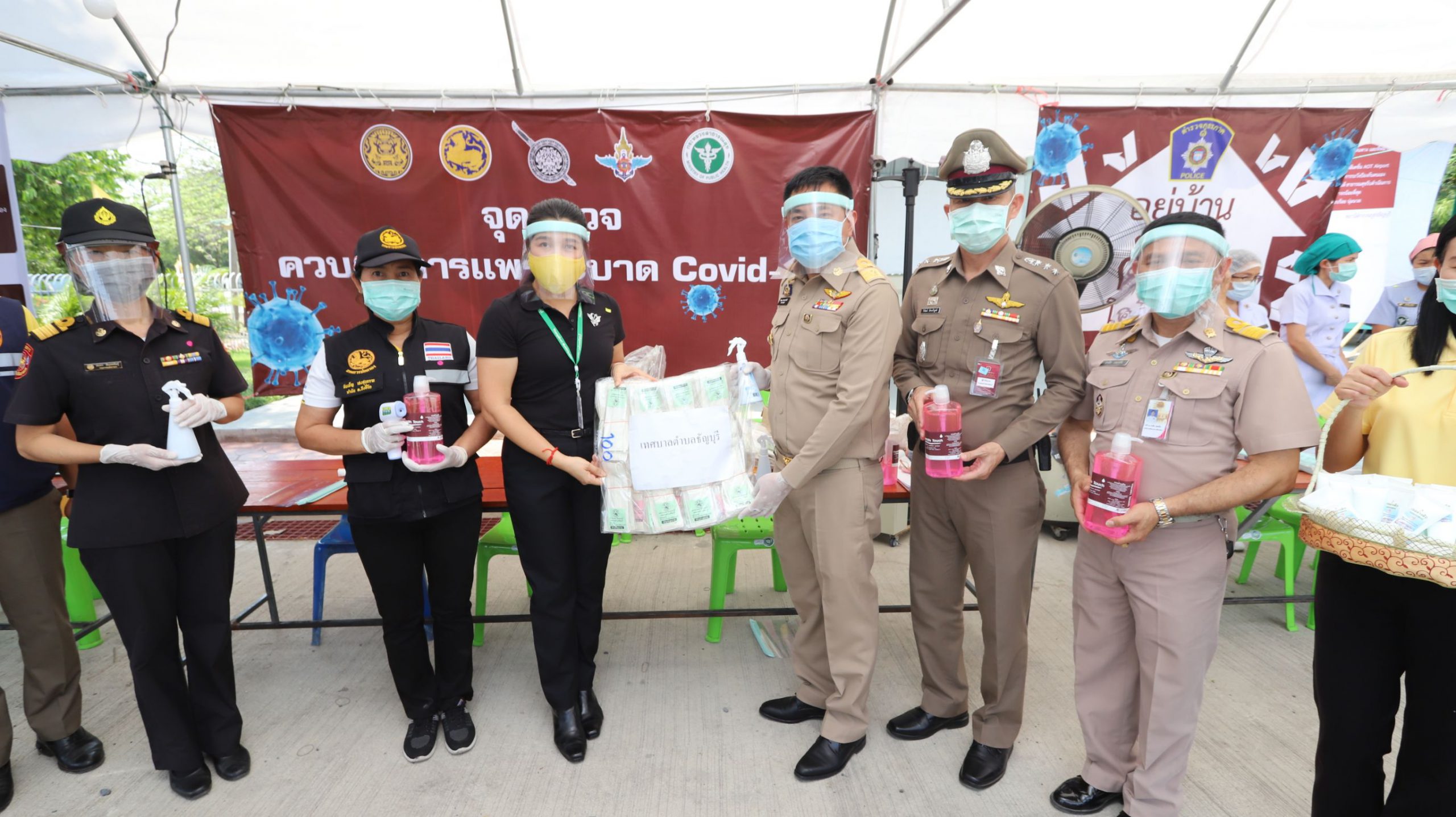 อำเภอธัญบุรี ตั้งด่านเข้ม วัดไข้ ล้างมือ จุดคัดกรองตรวจกันแพร่ระบาดโควิด-19 ทุกภาคส่วนร่วมมอบหน้ากากอนามัย เจลล้างมือให้เจ้าหน้าที่และประชาชน