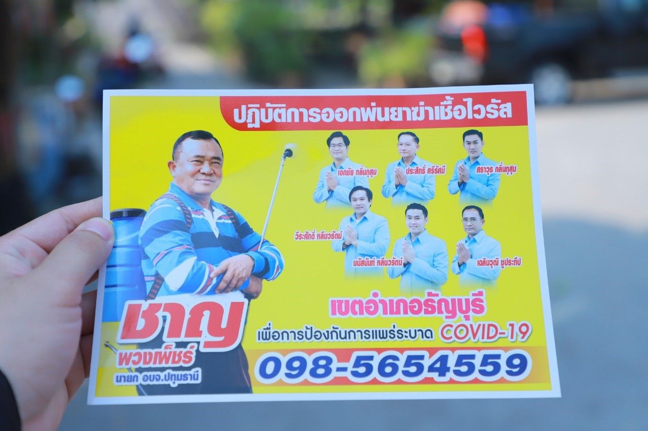 เทศบาลตำบลธัญบุรี นำโดยนายกฤษฎา หลีนวรัตน์ “นายกเบี้ยว” นายกเทศมนตรีตำบลธัญบุรี นายมนัสนันท์ หลีนวรัตน์ ว่าที่ผู้สมัครส.อบจ.ปทุมธานี อำเภอธัญบุรี เขต 5 นายเฉลิมวุฒิ ชูประทีปว่าที่ผู้สมัคร ส.อบจ.ปทุมธานี อำเภอธัญบุรี เขต 6 จังหวัดปทุมธานี พนักงานเทศบาล อาสาสมัคร และประชาชนร่วมกันปฏิบัติการออกฉีดพ่นน้ำยาฆ่าเชื้อโรคเชื้อไวรัสโควิด-19 ร่วมกับเทศบาลเมืองสนั่นรักษ์ และทีมงานลุงชาญใจดี ตามสถานที่ต่างๆ สนองนโยบายรัฐบาลฉีดพ่นน้ำยาฆ่าเชื้อโรคเพื่อป้องกันการแพร่ระบาดโควิด-19 และสร้างความตระหนักให้แก่ประชาชนในการเฝ้าระวังและป้องกันโรคโควิด-19