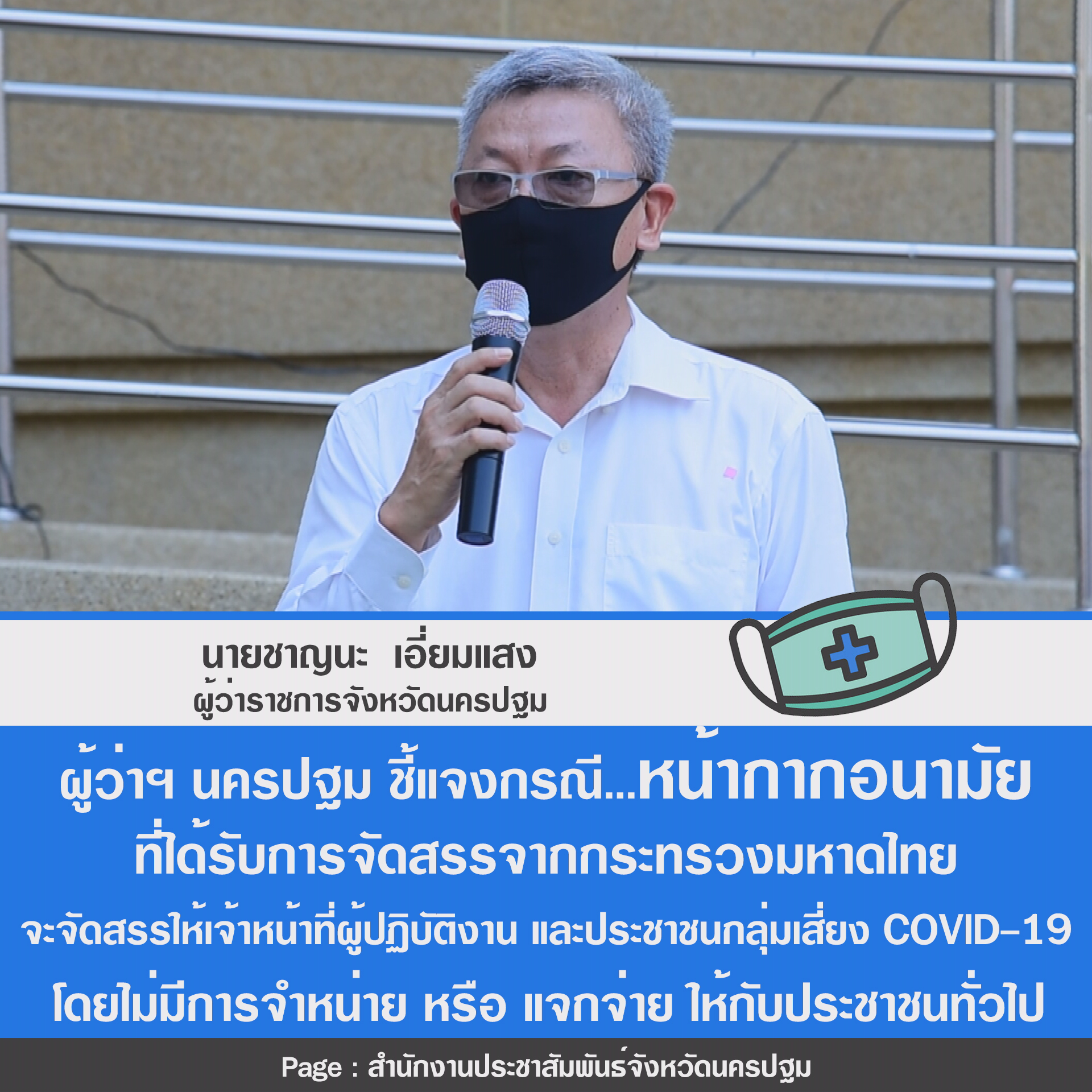 ผู้ว่าราชการจังหวัดนครปฐม ชี้แจงกรณีหน้ากากอนามัยที่ได้รับจัดสรรจากกระทรวงมหาดไทย จะดำเนินการจัดสรรให้กับบุคลากรทางการแพทย์ เจ้าหน้าที่ผู้ปฏิบัติงาน และประชาชนกลุ่มเสี่ยงโรค COVID-19 โดยไม่มีการจำหน่ายหรือแจกจ่ายให้กับประชาชนทั่วไป