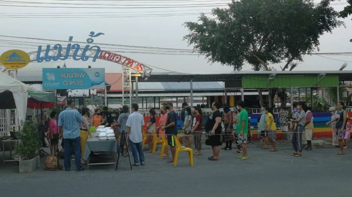 ที่บริเวณลานด้านหน้าร้านแม่น้ำอาหาร “เสี่ยแมว” เจ้าของร้าน”แม่น้ำแพอาหาร ร่วมกับครอบครัว” คชวัตร”ซึ่งเป็นนามสกุลเดิมของ” สมเด็จพระญาณสังวร สมเด็จพระสังฆราชองค์ที่ 19 แห่งกรุงรัตนโกสินทร์ นำข้าวมันไก่ ข้าวผัดกระเพรา จำนวน 500 กล่องมาตั้งเรียงไว้บนโต๊ะเพื่อที่จะแจกให้กับพี่น้องประชาชนชาวกาญจนบุรีที่ประสบความเดือดร้อนจากสถานการณ์การแพร่ระบาดของเชื้อโรคไวรัส” โคโรนา-2019 หรือ” โควิด-19″ในหลายพื้นที่ของประเทศไทย ณ ลานจอดรถด้านหน้าร้าน” แม่น้ำแพอาหาร” ตำบลบ้านเหนือ อำเภอเมือง จังหวัดกาญจนบุรีภายหลังเสร็จสิ้นการเคารพธงชาติในเวลา 18.00 น.ทางร้าน”แม่น้ำแพอาหาร”พร้อมด้วยครอบครัว” คชวัตร” ได้ให้พี่น้องชาวกาญจนบุรีที่เดินทางมารับการแจกข้าวกล่องของทางร้าน”แม่น้ำแพอาหาร”และครอบครัว” คชวัตร” จัดไว้โดยทางผู้แจกได้ให้พี่น้องประชาชนที่เดินทางมารับข้าวกล่องปฏิบัติตามมาตรการป้องกันตามที่กระทรวงสาธารณสุขและคณะกรรมการโรคติดต่อส่วนจังหวัดกาญจนบุรีอย่างเข็งครัด โดยให้ประชาชนเข้าแถวหน้ากระดานเรียง 3 โดยให้เว้นช่องห่างระหว่างกันกว่า 1.5 เมตร เพื่อป้องกันการติดเชื้อโรคไวรัสโคโรนา2019 หรือ “โควิด-19″รวมถึงแมล์ตปิดจมูก ถ้าใครไม่สวมใส่ทางผู้แจกจะไม่ทำการแจกข้าวกล่องดังกล่าวให้เพราะถือว่า ไม่ปฎิบัติตามมาตราการการป้องกันโรคติดในส่วนกลางและส่วนจังหวัดพร้อมกับกำชับให้ผู้ที่เดินทางมารับข้าวกล่องเมื่อรับเสร็จแล้วขอให้ท่านรีบกลับอย่าได้ชุมนุมหรือพูดคุยแต่อย่างเพื่อป้องกันการแพร่ระบาดของโรคเชื้อไวรัสโคโรนา2019 หรือ “โควิด-19” พร้อมกับนำเจลและแอลกอฮอล์มาทำการฉีดให้กับพี่น้องประชาชนก่อนที่จะทำการเขารับแจกข้าวกล่องดังกล่าว