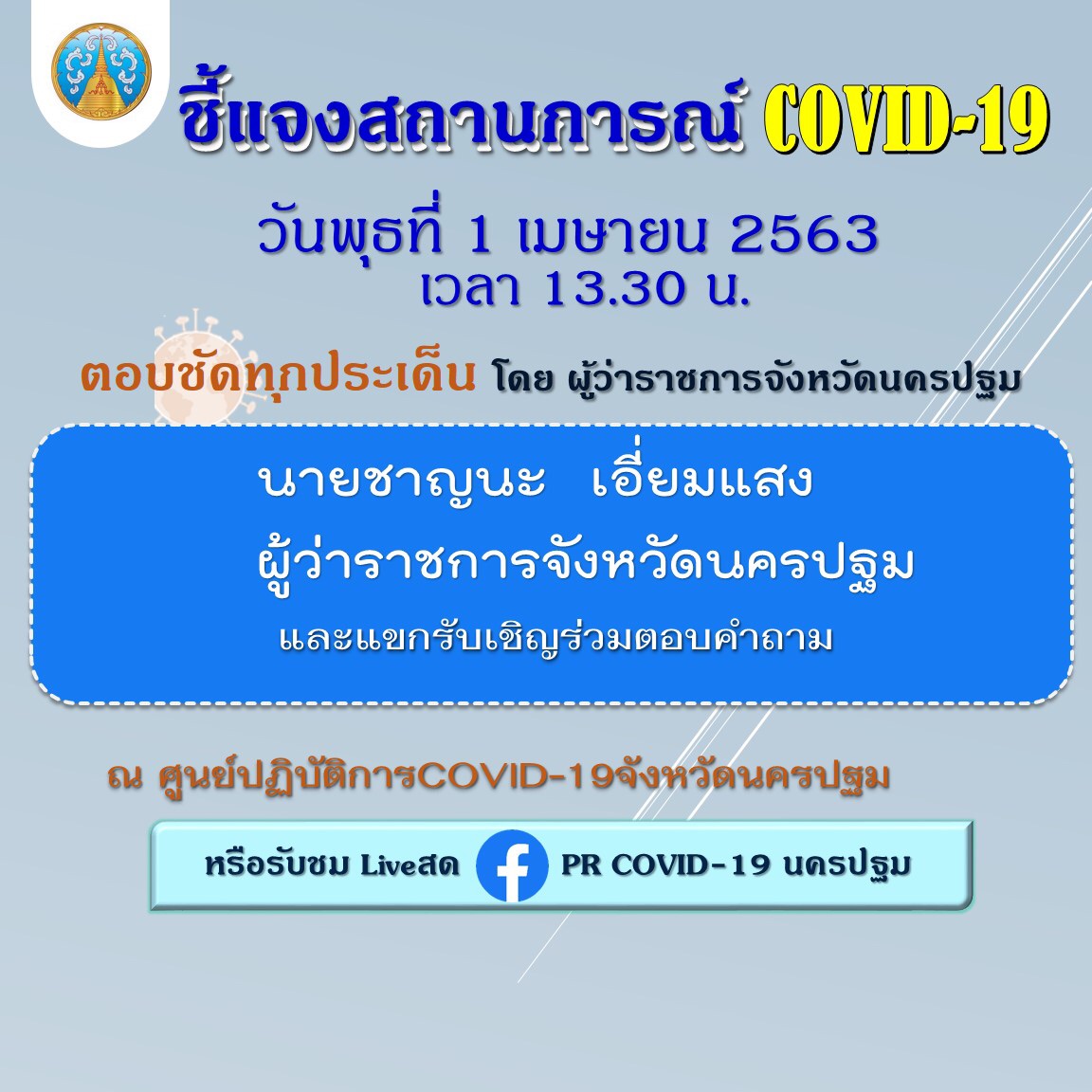 ศูนย์ปฏิบัติการโควิด 19 (COVID-19) จังหวัดนครปฐม ชี้แจงสถานการณ์ไวรัส COVID-19 จังหวัดนครปฐม ประจำวันที่ 1 เมษายน 2563 เวลา 13.30 น. โดย