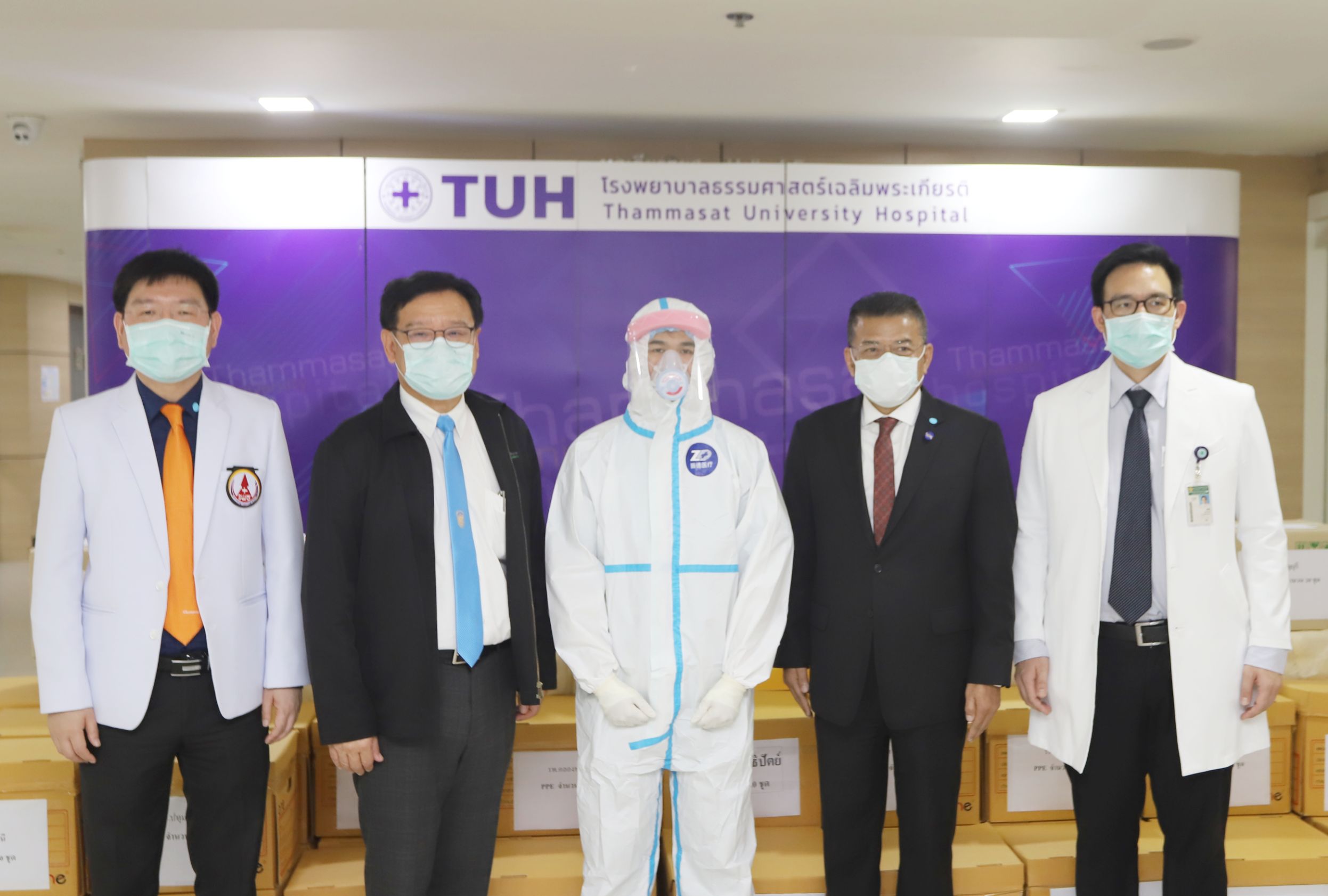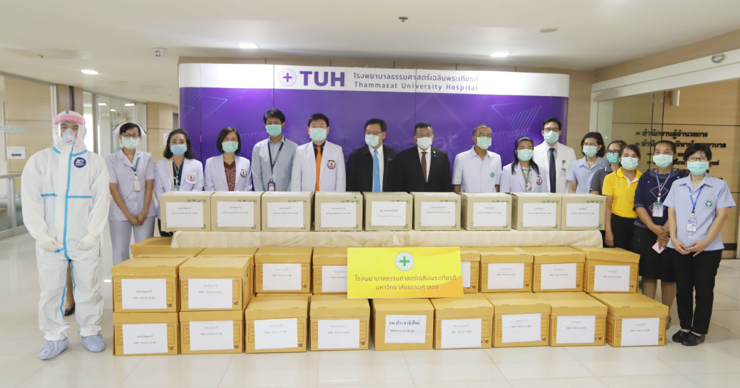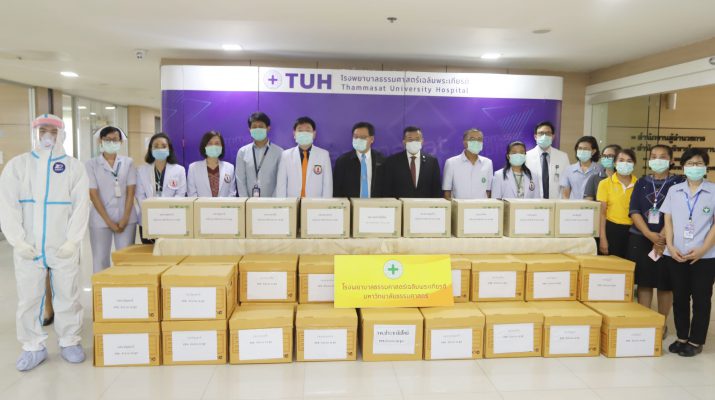 จากนั้น ดร.พินิจ บุญเลิศ ผู้ว่าราชการจังหวัดปทุมธานี พร้อมด้วย ศ.ดร.สุรพล นิติไกรพจน์ ประธานคณะกรรมการบริหาร โรงพยาบาลธรรมศาสตร์เฉลิมพระเกียรติ นพ.พฤหัส ต่ออุดม ผู้อำนวยการโรงพยาบาลธรรมศาสตร์ เฉลิมพระเกียรติ นายแพทย์สุรินทร์ สืบซึ้ง นายแพทย์สาธารณสุขจังหวัดปทุมธานี ได้ร่วมกันมอบอุปกรณ์ป้องกันการติดเชื้อ COVID -19ให้กับโรงพยาบาลอำเกอในจังหวัดปทุมธานี จำนวน 2 รายการดังนี้ 1. ชุดอุปกรณ์ป้องกันการติดเชื้อ (PPE) ได้รับบริจาคจาก แจ๊คหม่า 2. หน้ากากป้องกันการติดเชื้อ (N99) ได้รับบริจาคจากคณะแพทยวชิรพยาบาลที่คิดค้นขึ้นมาเอง