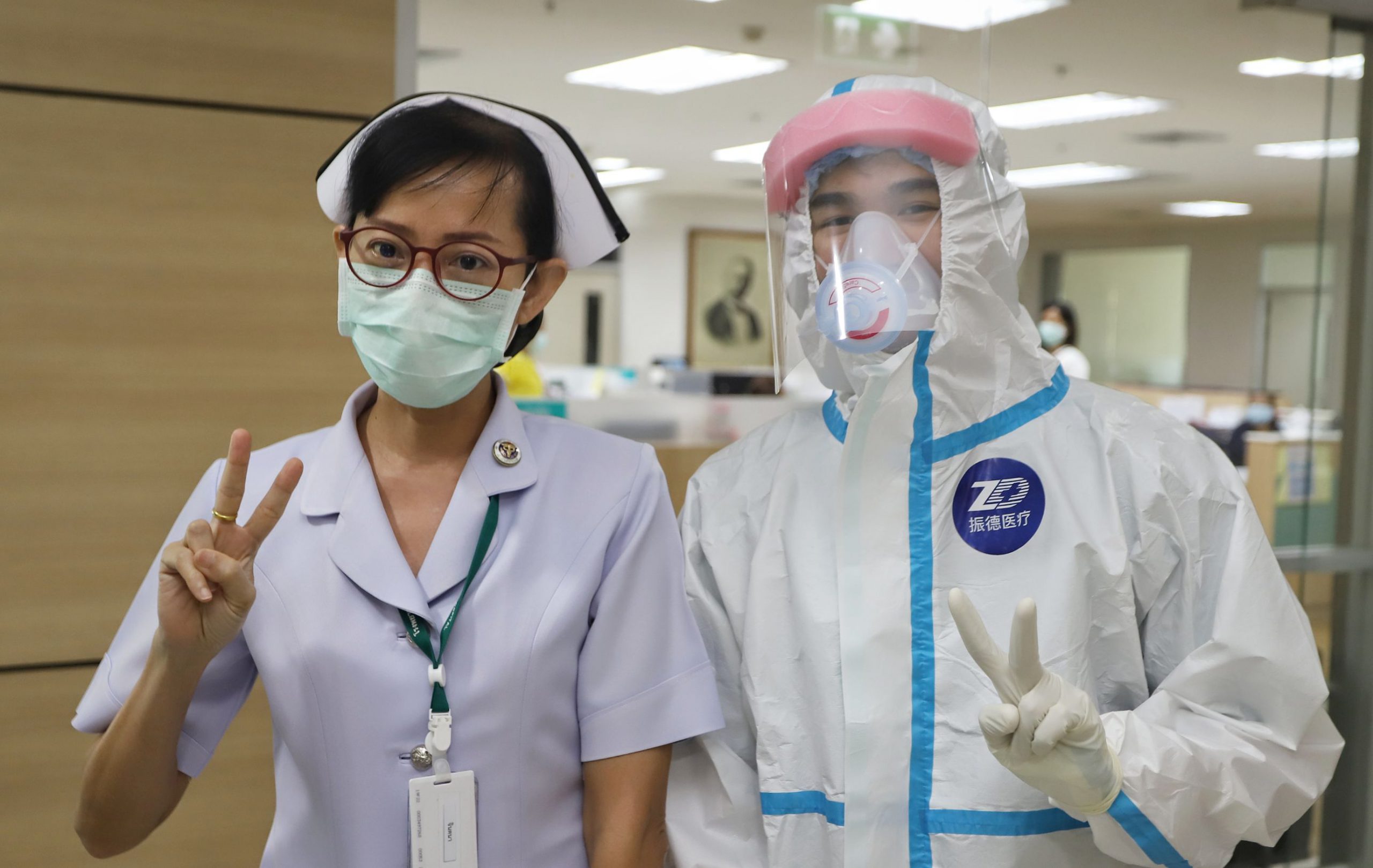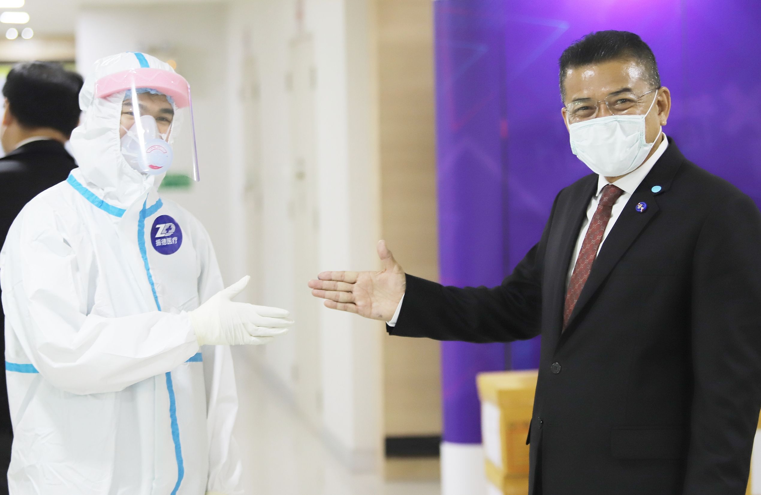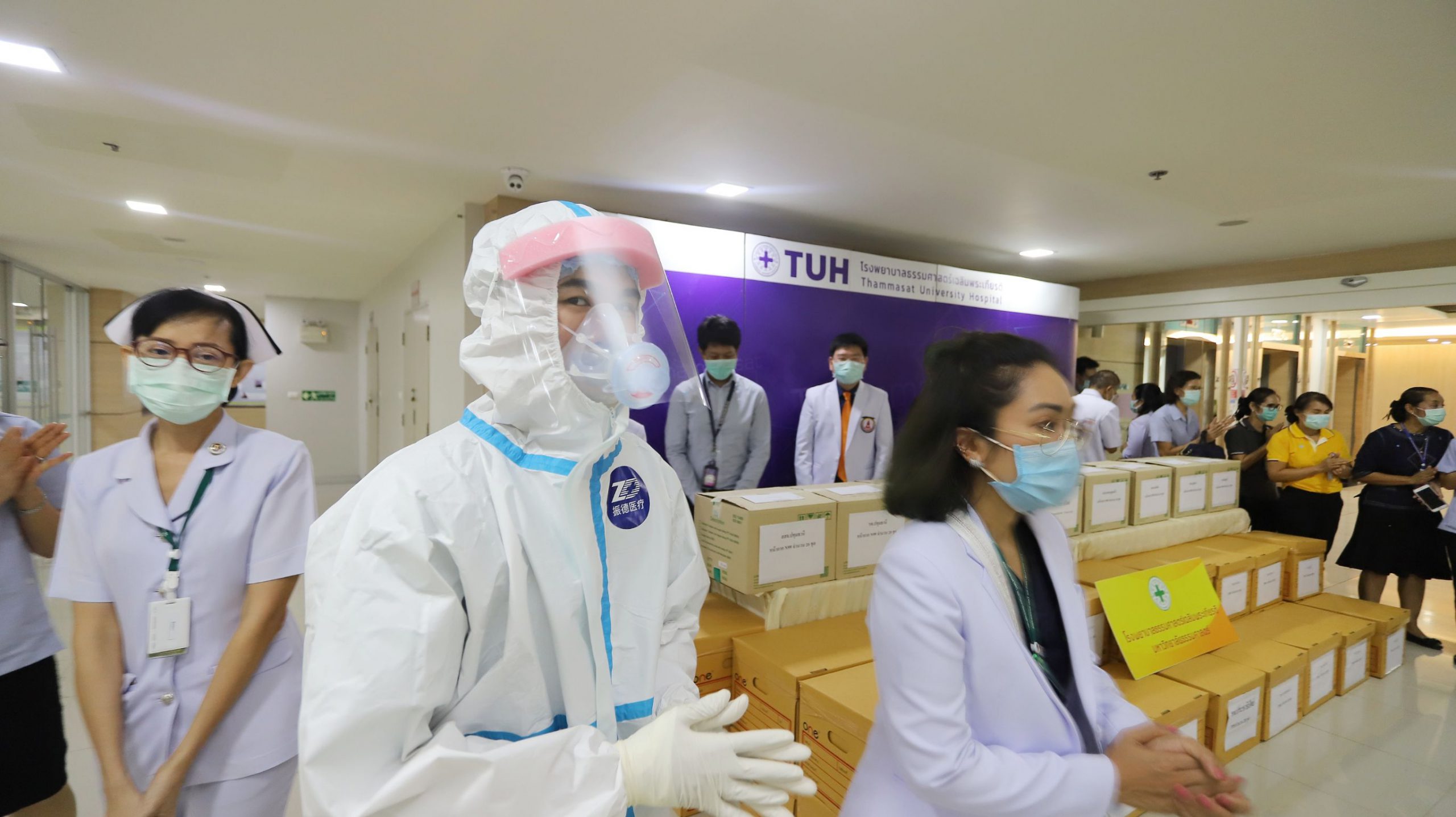 จากนั้น ดร.พินิจ บุญเลิศ ผู้ว่าราชการจังหวัดปทุมธานี พร้อมด้วย ศ.ดร.สุรพล นิติไกรพจน์ ประธานคณะกรรมการบริหาร โรงพยาบาลธรรมศาสตร์เฉลิมพระเกียรติ นพ.พฤหัส ต่ออุดม ผู้อำนวยการโรงพยาบาลธรรมศาสตร์ เฉลิมพระเกียรติ นายแพทย์สุรินทร์ สืบซึ้ง นายแพทย์สาธารณสุขจังหวัดปทุมธานี ได้ร่วมกันมอบอุปกรณ์ป้องกันการติดเชื้อ COVID -19ให้กับโรงพยาบาลอำเกอในจังหวัดปทุมธานี จำนวน 2 รายการดังนี้ 1. ชุดอุปกรณ์ป้องกันการติดเชื้อ (PPE) ได้รับบริจาคจาก แจ๊คหม่า 2. หน้ากากป้องกันการติดเชื้อ (N99) ได้รับบริจาคจากคณะแพทยวชิรพยาบาลที่คิดค้นขึ้นมาเอง
