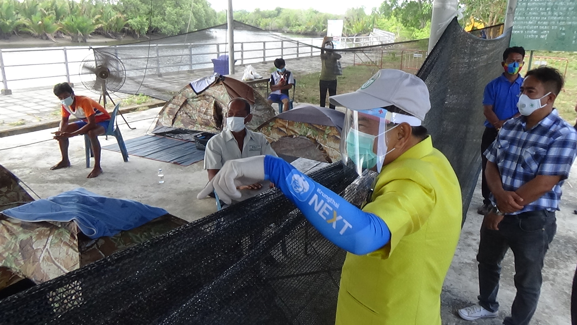 นายลือชัย เจริญทรัพย์ ผู้ว่าราชการจังหวัดตรัง พร้อมด้วยฝ่ายปกครองอำเภอกัน กำนัน ผู้ใหญ่บ้าน นายกองค์การบริหารส่วนตำบลกันตังใต้ เดินทางไปเยี่ยมกำลังใจลูกเรือประมงที่เดินทางกลับจากประเทศมาเลเซีย กลับบ้านที่จังหวัดตรัง จำนวน 8 คน ทั้งนี้ครอบครัวและผู้นำชุมชนในพื้นที่ หมู่ที่ 4 ตำบลกันตังใต้ อำเภอกันตัง ได้จัดสถานที่กักบริเวณลูกเรือประมง โดยนำสแลนด์ มากั้นโดยรอบอาคาร และกางเต็นท์ ให้เป็นสถานที่หลับนอนของผู้ที่กักบริเวณตัวเอง โดยชาวบ้านที่ไปทำงานเป็นลูกเรือประมงที่ประเทศมาเลเซียนั้นเดินทางกลับมาจังหวัดตรังเมื่อวันที่ 1 เมษายนที่ผ่านมา และมีการกักบริเวณตัวเองทันที เพื่อความสบายใจของตนเอง ครอบครัวและชาวบ้านในชุมชน ส่วนเรื่องอาหารการกินครอบครัวได้นำอาหารมาให้อย่างต่อเนื่อง ในขณะที่แพทย์และพยาบาลก็เดินทางมาคอยวัดไขให้กับผู้ที่กักบริเวณ โดยตั้งกักบริเวณเป็นระยะเวลา 14 วันตามประกาศของกระทรวงสาธารณสุข
