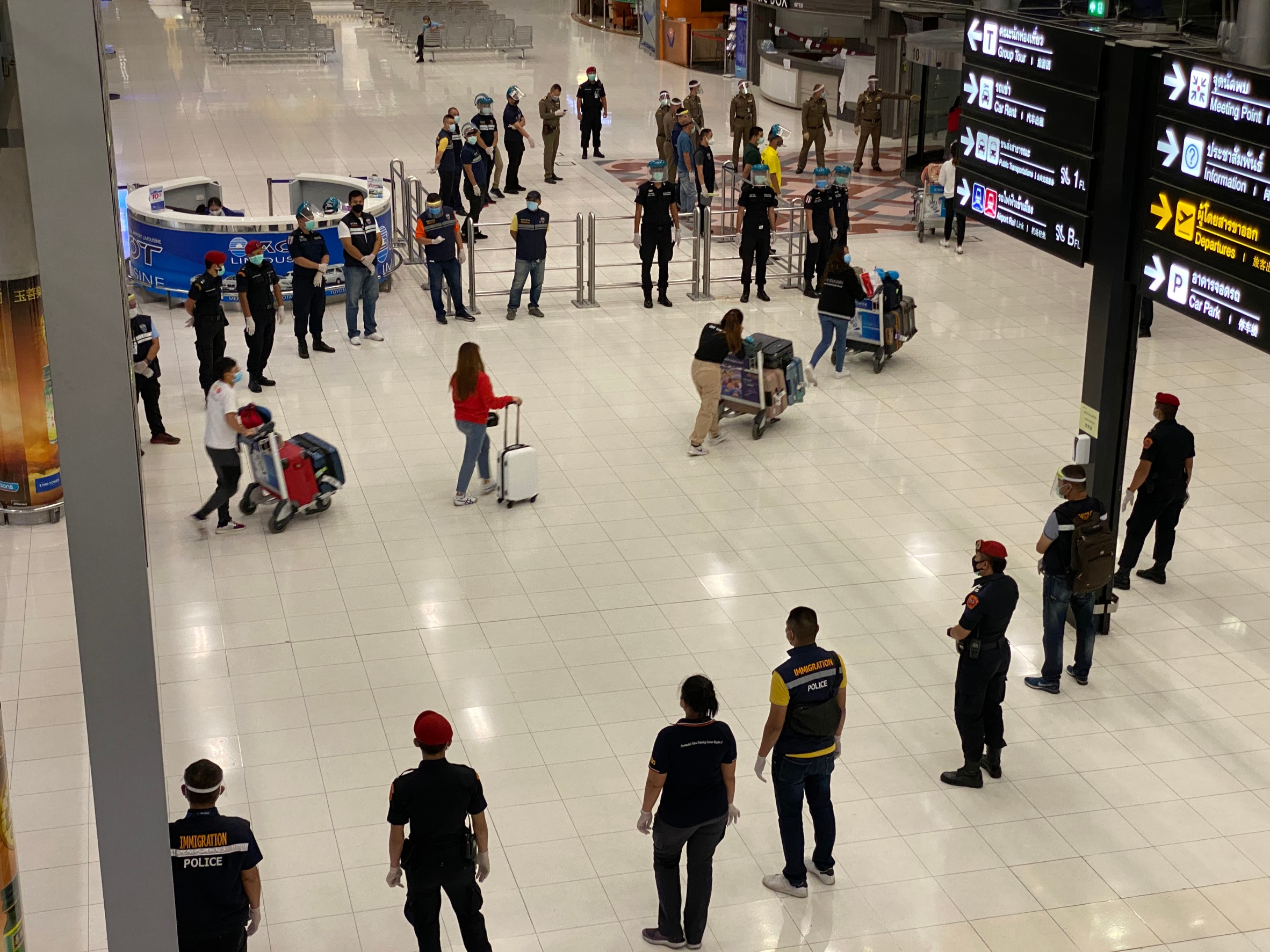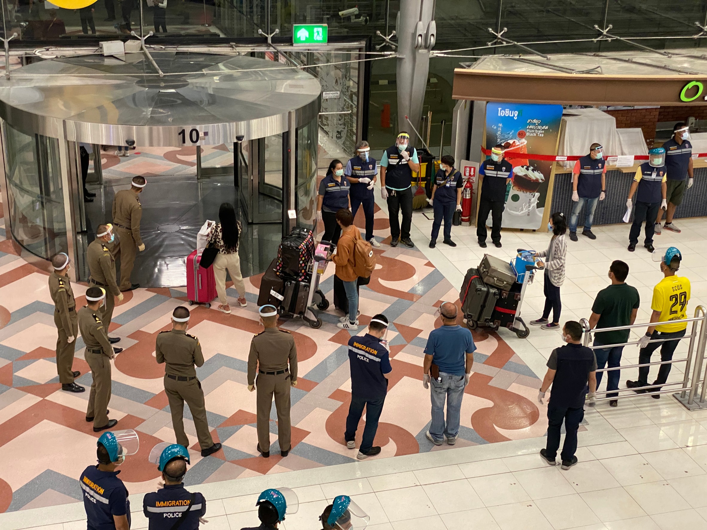 *****และต่อมาเมื่อเวลา 21.30 น. พล.ต.ต.ชัยณรงค์ เจริญไชยเนาว์ รองผู้บัญชาการตำรวจภูธรภาค 1 พล.ต.ต.ชุมพล พุ่มพวง ผบก.ภ.จว.สมุทรปราการ ได้ระดมกำลังเจ้าหน้าที่ตำรวจ ทหาร กว่า 100 นาย เข้าพื้นที่เพื่อรอรับเที่ยวบินที่จะมีผู้โดยสารเดินทางเข้าประเทศอีก เทียวบินมีผู้โดยสารประมาณ 200 คน เพื่อรักษาความสงบเรียบร้อยในการนำตัวผู้ที่เดินทางเข้ามา ไปกักตัวในสถานที่ที่กระทรวงสาธารณสุขและหน่วยงานด้านความมั่นคงเตรียมไว้ โดยเจ้าหน้าที่ที่เกี่ยวข้องทั้งหมดได้นำตัวผู้โดยสารทั้งหมด 214 คนที่ผ่านการคัดกรองโควิด 19 แล้วขึ้นรถบัสไปกักตัวที่ อ.สัตหีบ จ.ชลบุรี เป็นเวลา 14 วัน ตาม พ.ร.ก.ฉุกเฉินฯ และประกาศของสำนักงานการบินพลเรือน โดยไม่มีเหตุการณ์วุ่นวายแต่อย่างใด