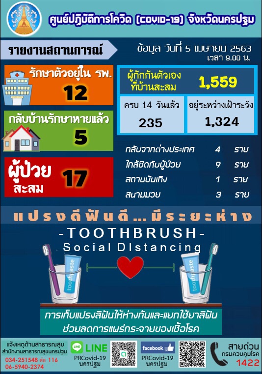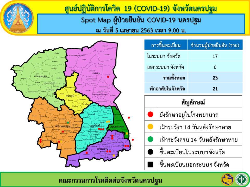 สถานการณ์ COVID-19 จ.นครปฐม ประจำวันที่ 5 เม.ย 63 ไม่พบผู้ป่วยรายใหม่เพิ่ม ผู้ป่วยยืนยันสะสม 17 ราย กลับบ้านแล้ว 5 ราย กำลังรักษา ในรพ. 12 ราย และมีผู้อยู่ระหว่างรอผลตรวจ 7 ราย