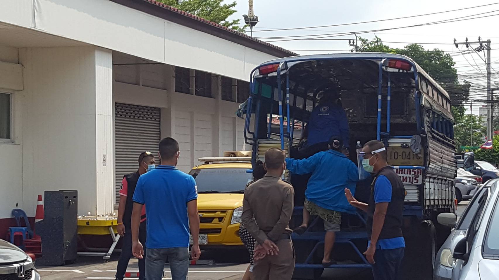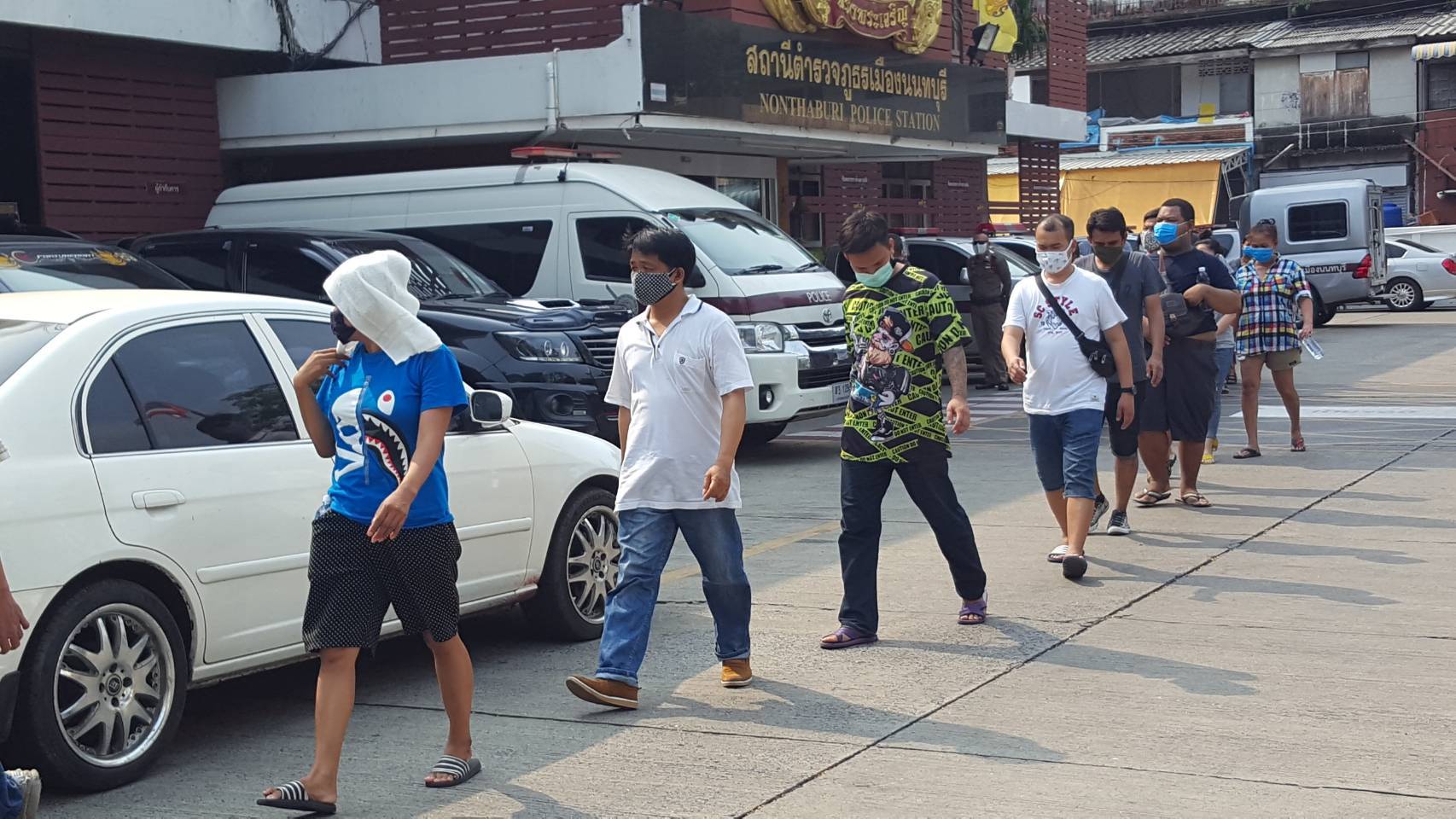 ตำรวจนำตัวผู้ต้องหาการพนันไฮโล ที่ถูกชุดพิเศษ กรมการปกครองจับกุมตัวกว่า 100 คน จากห้องขัง ขึ้นรถ2แถวส่งฟ้องศาลแขวงจังหวัดนนทบุรี