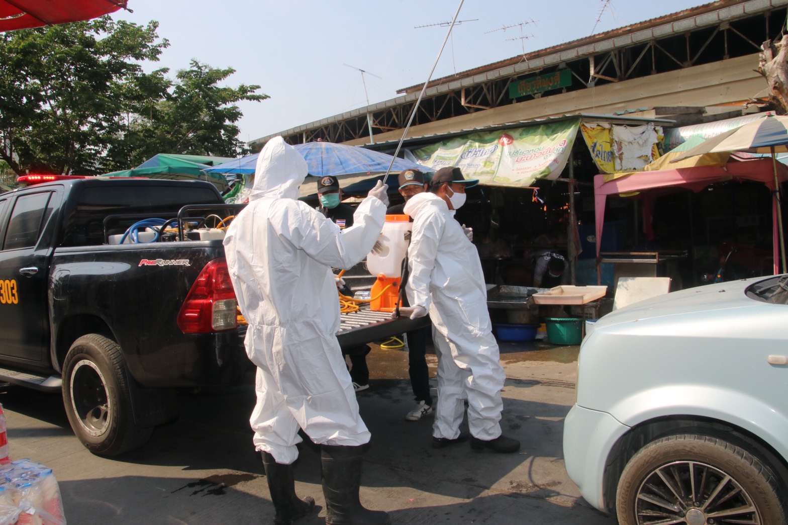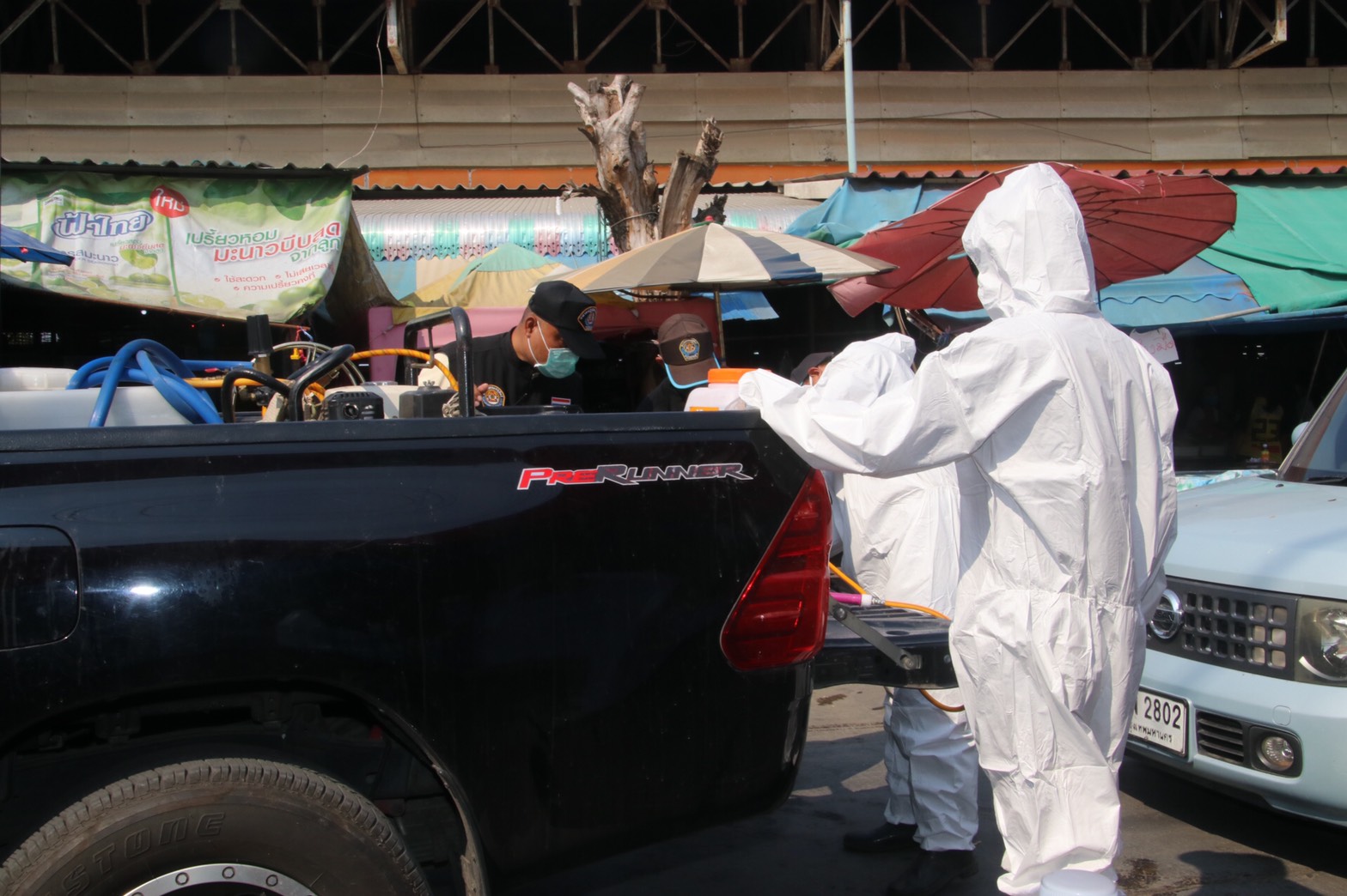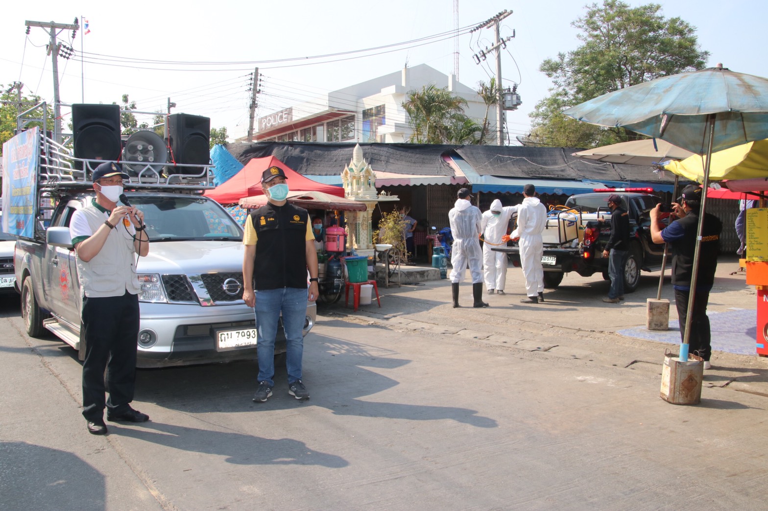 อำเภอบ้านโป่ง ผู้แทนราษฎรจ.ราชบุรี เขต 4 อำเภอบ้านโป่งรวมพลังกับเทศบาลตำบลกรับใหญ่และผู้ใหญ่บ้านพ่นยาฆ่าเชื้อไวรัส COVID-19 ที่ตลาดห้วยกระบอก