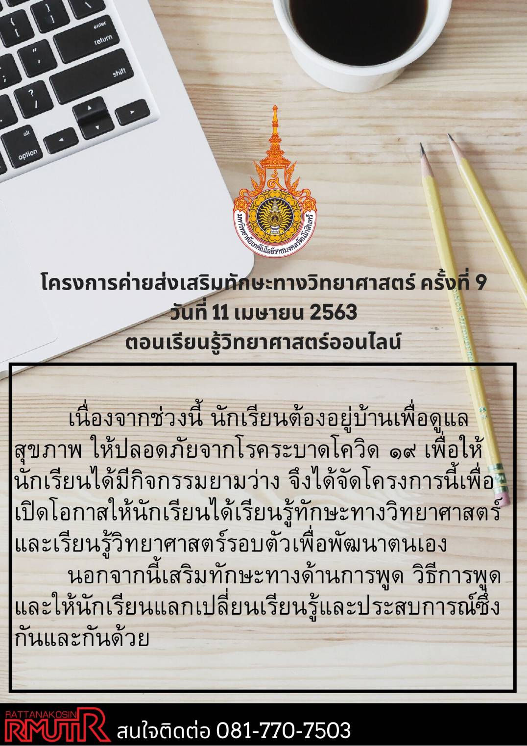 มหาวิทยาลัยเทคโนโลยีราชมงคลรัตนโกสินทร์ สนับสนุนให้นักเรียน เรียนรู้ได้ ห่างไกล โควิด 19 คณะวิทยาศาสตร์และเทคโนโลยี มหาวิทยาลัยเทคโนโลยีราชมงคลรัตนโกสินทร์ จัดโครงการบริการวิชาการออนไลน์ “ค่ายส่งเสริมทักษะทางวิทยาศาสตร์ ครั้งที่ 9” วันเสาร์ ที่ 11 เมษายน 2563(ตอนเรียนรู้วิทยาศาสตร์ออนไลน์) ซึ่งสถานการณ์ปัจจุบัน นักเรียนต้องอยู่บ้านเพื่อดูแลสุขภาพให้ปลอดภัยจากโรคระบาดโควิด 19 คณะวิทยาศาสตร์และเทคโนโลยีจึงมีกิจกรรมยามว่าง