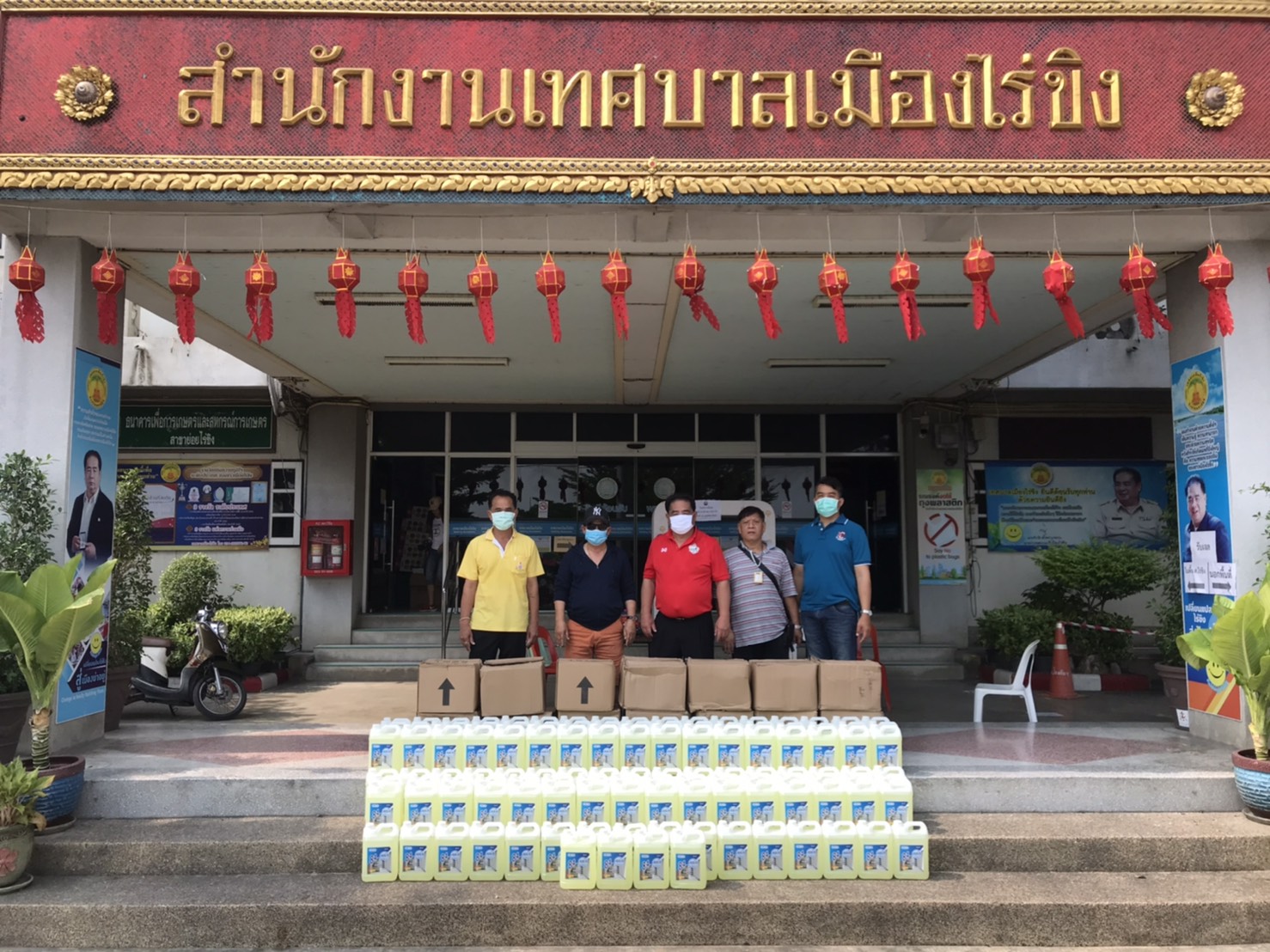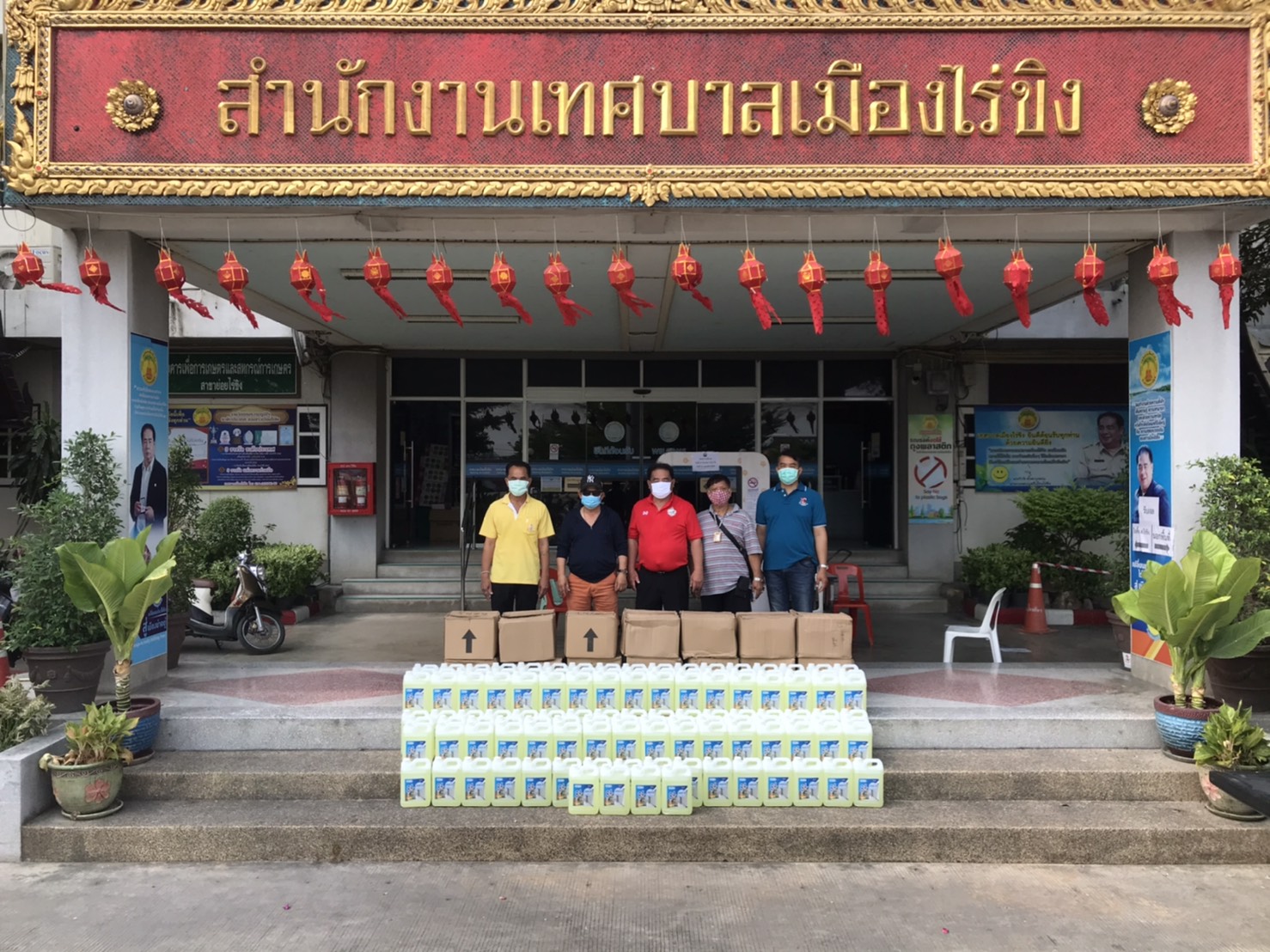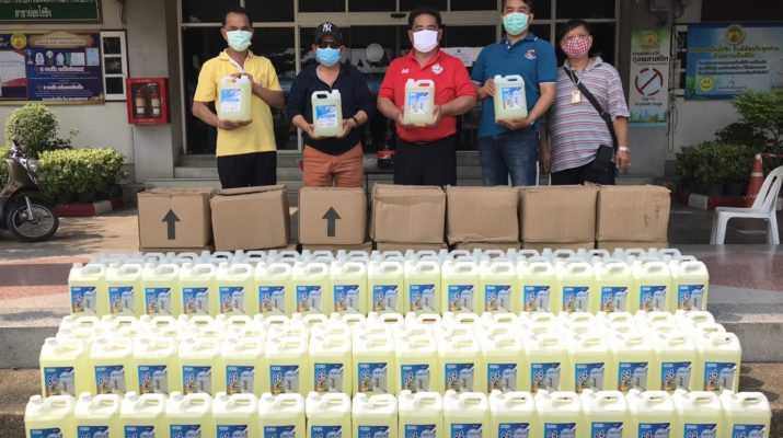 นายจำรัส ตั้งตระกูลธรรม นายกเทศมนตรีเมืองไร่ขิง มอบน้ำยาฆ่าเชื้อ สำหรับผสมน้ำฉีดพ่นฆ่าเชื้อในชุมชน พร้อมกับแบ่งปันมอบให้นายตุม ชอบมาก ประธานกต.ตร.สน.บางเสาธง คณะกรรมการตรวจสอบและติดตามการบริหารงานตำรวจ รับมอบน้ำยาฆ่าเชื้อ 50แกลอนในการนำไปผสมน้ำฉีดพ่น ในเขต สน.บางเสาธง สน.ศาลาแดงและสน.จักรวรรดิ์