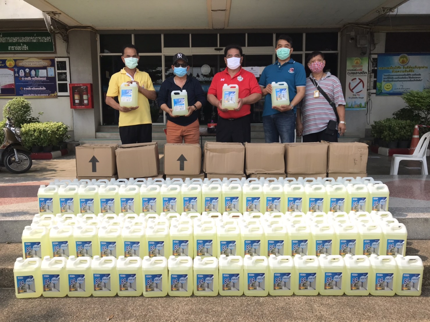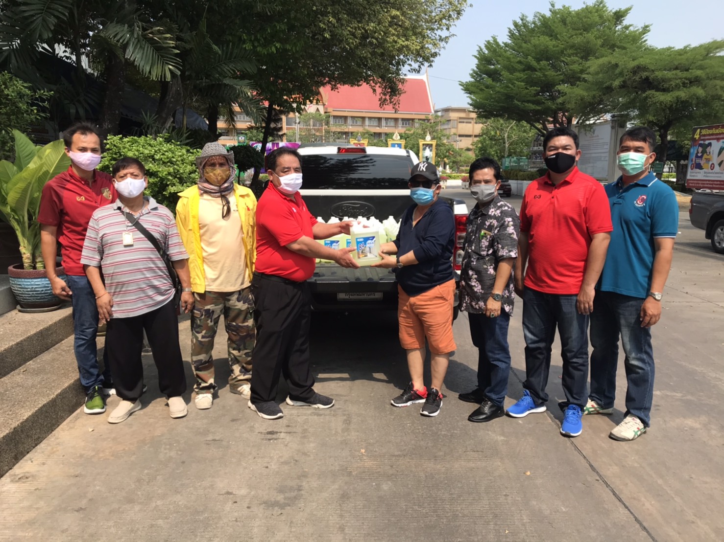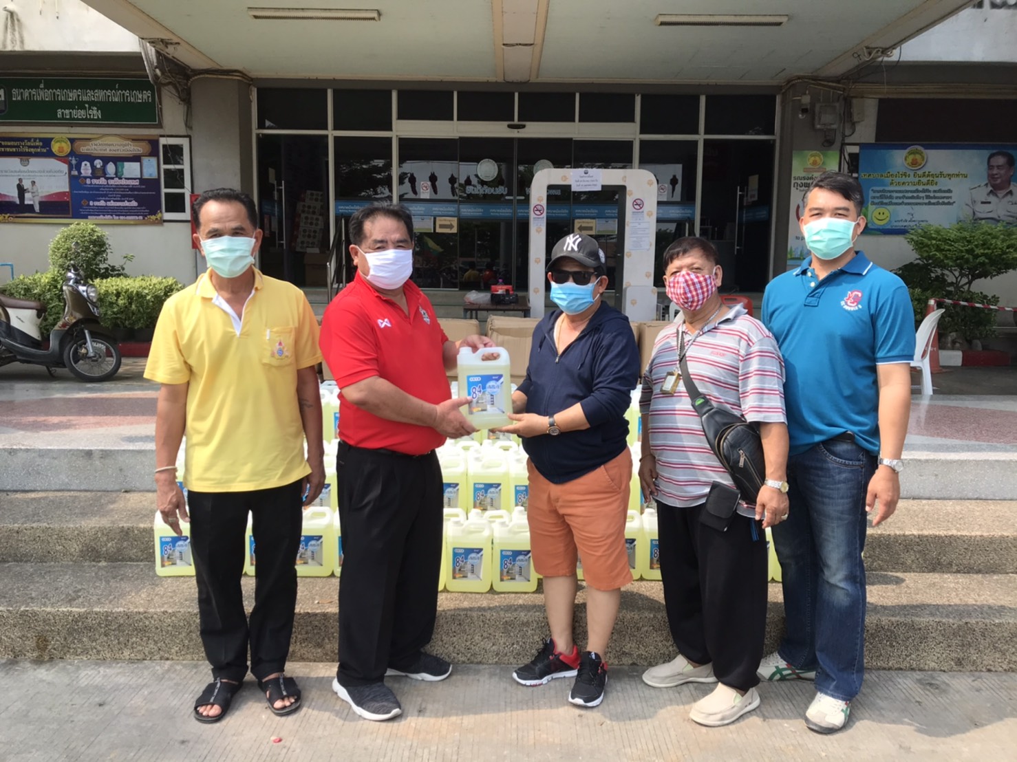นายจำรัส ตั้งตระกูลธรรม นายกเทศมนตรีเมืองไร่ขิง มอบน้ำยาฆ่าเชื้อ สำหรับผสมน้ำฉีดพ่นฆ่าเชื้อในชุมชน พร้อมกับแบ่งปันมอบให้นายตุม ชอบมาก ประธานกต.ตร.สน.บางเสาธง คณะกรรมการตรวจสอบและติดตามการบริหารงานตำรวจ รับมอบน้ำยาฆ่าเชื้อ 50แกลอนในการนำไปผสมน้ำฉีดพ่น ในเขต สน.บางเสาธง สน.ศาลาแดงและสน.จักรวรรดิ์