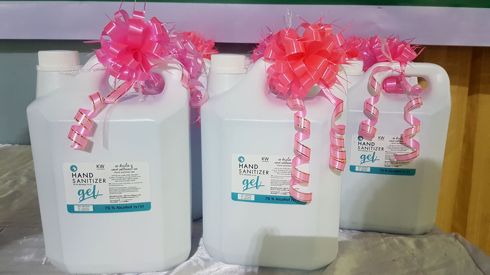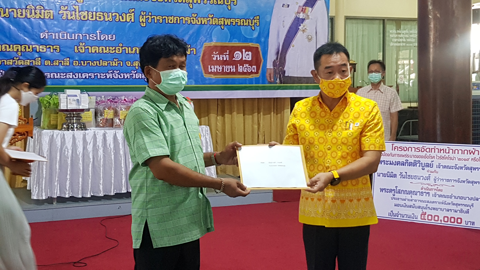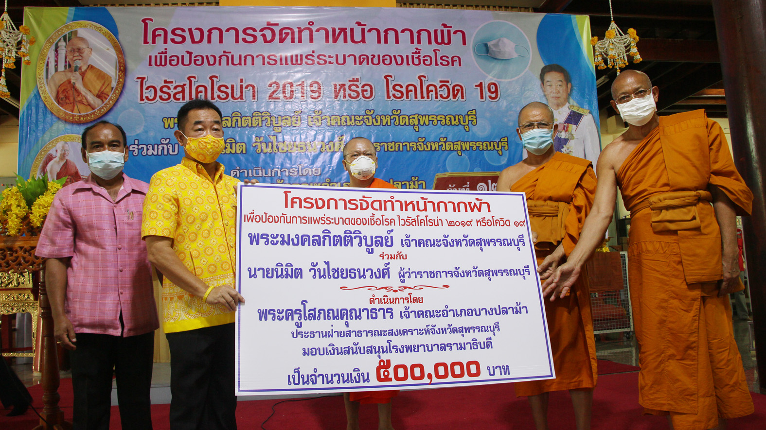 โดยได้มอบให้กับผู้แทนพระสงฆ์แต่ละอำเภอ ทุกวัดทั้ง 10 อำเภอ ในจังหวัดสุพรรณบุรี ประกอบด้วย อ.ดอนเจดีย์ จำนวน 824 ชิ้น อ.อู่ทอง 800 ชิ้น อ.สองพี่น้อง 1,200 ชิ้น อ.สามชุก 700 ชิ้น อ.ด่านช้าง 900 ชิ้น อ.สามชุก 850 ชิ้น อ.เดิมบางนางบวช 962 ชิ้น อ.หนองหญ้าไซ 500 ชิ้น อ.เมือง 2,200 ชิ้น และ อ.บางปลาม้า 830 ชิ้น รวมหน้ากากผ้าที่มอบให้กับคณะสงฆ์ทั้งจังหวัดและประชาชน ตำบลสาลี จำนวน 8 หมู่บ้าน รวมทั้งสิ้นจำนวน 15,166 ชิ้น มอบเครื่องวัดไข้ จำนวน 10 ตัว ให้กับ รพ.สต.สาลี 2 ตัว รพ.สต.เสาธงทอง 2 ตัว และมอบให้กับหน่วยคัดกรอง จุด อ.บางปลาม้า 6 ตัว มอบแอลกอฮอล์ จำนวน 15 ถัง รวม 150 ลิตร ให้กับสาธารณสุขอำเภอบางปลาม้า และ รพ.สต.ในพื้นที่ อ.บางปลาม้า และได้มอบเงินสนับสนุนให้กับโรงพยาบาลรามาธิบดี จำนวน 500,000 บาท