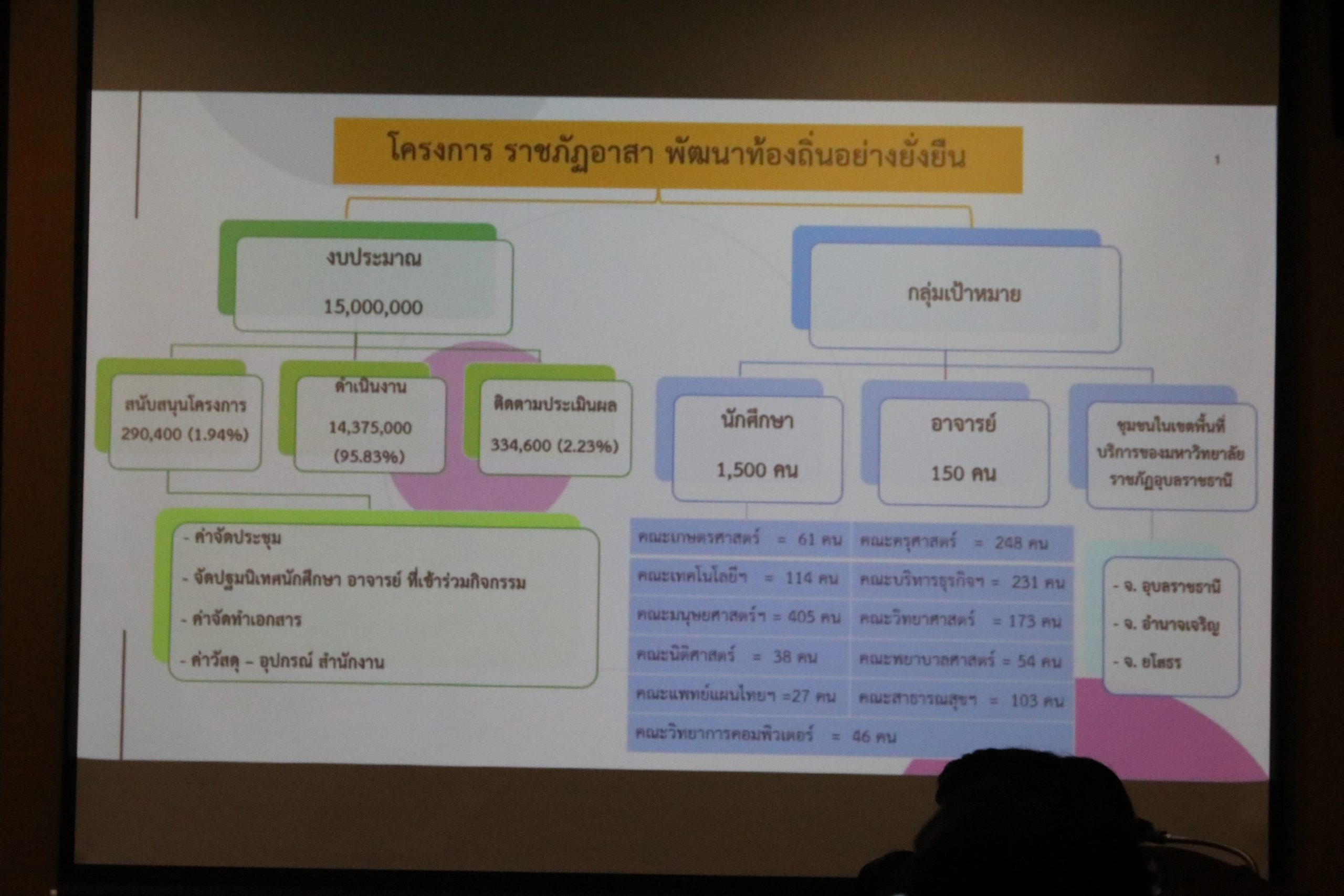 รองศาสตราจารย์ ดร.ภาสกร นันทพานิช รองอธิการบดีฝ่ายยุทธศาสตร์ มหาวิทยาลัยราชภัฏอุบลราชธานี กล่าวถึงโครงการ “ราชภัฏอาสา พัฒนาท้องถิ่นยั่งยืน รวมใจสู้ภัย COVID-19” ว่า…ตามนโยบายและความคิดริเริ่มของ พล.อ.นิรุทธ เกตุสิริ นายกสภามหาวิทยาลัยราชภัฏอุบลราชธานี และ รองศาสตราจารย์ธรรมรักษ์ ละอองนวล อธิการบดีมหาวิทยาลัยราชภัฏอุบลราชธานี ได้เลงเห็นถึงผลกระทบจากการระบาดของโรค COVID-19 โดยเฉพาะในด้านเศรษฐกิจที่มีต่อผู้ปกครองและนักศึกษา ซึ่งส่วนใหญ่เป็นประชาชนในพื้นที่ จังหวัดอุบลราชธานี และ จังหวัดใกล้เคียง จึงได้กำหนดนโยบายและแนวทางในการช่วยเหลือเพื่อลดภาระค่าใช้จ่ายด้านการศึกษาของนักศึกษาที่เป็นบุตรหลานที่เรียนอยู่มหาวิทยาลัยราชภัฏอุบลราชธานี โดยการจ้างงานให้นักศึกษาทำงานอยู่ที่บ้านตามศาสตร์ของนักศึกษาที่เรียนมา เพื่อเฝ้าระวัง ให้ความรู้และคำแนะนำ รวมทั้งเตรียมการพัฒนาหรือฟื้นฟูหลังจากผ่านวิกฤติการระบาดของโรค COVID-19