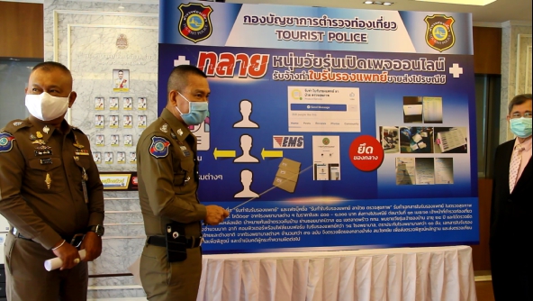 สมุทรปราการ ตร.ท่องเที่ยวแถลงข่าวจุบหนุ่มวัยรุ่นเปิดเพจออนไลน์ รับจ้างทำใบรับรองแพทย์ขายส่งทางไปรษณีย์