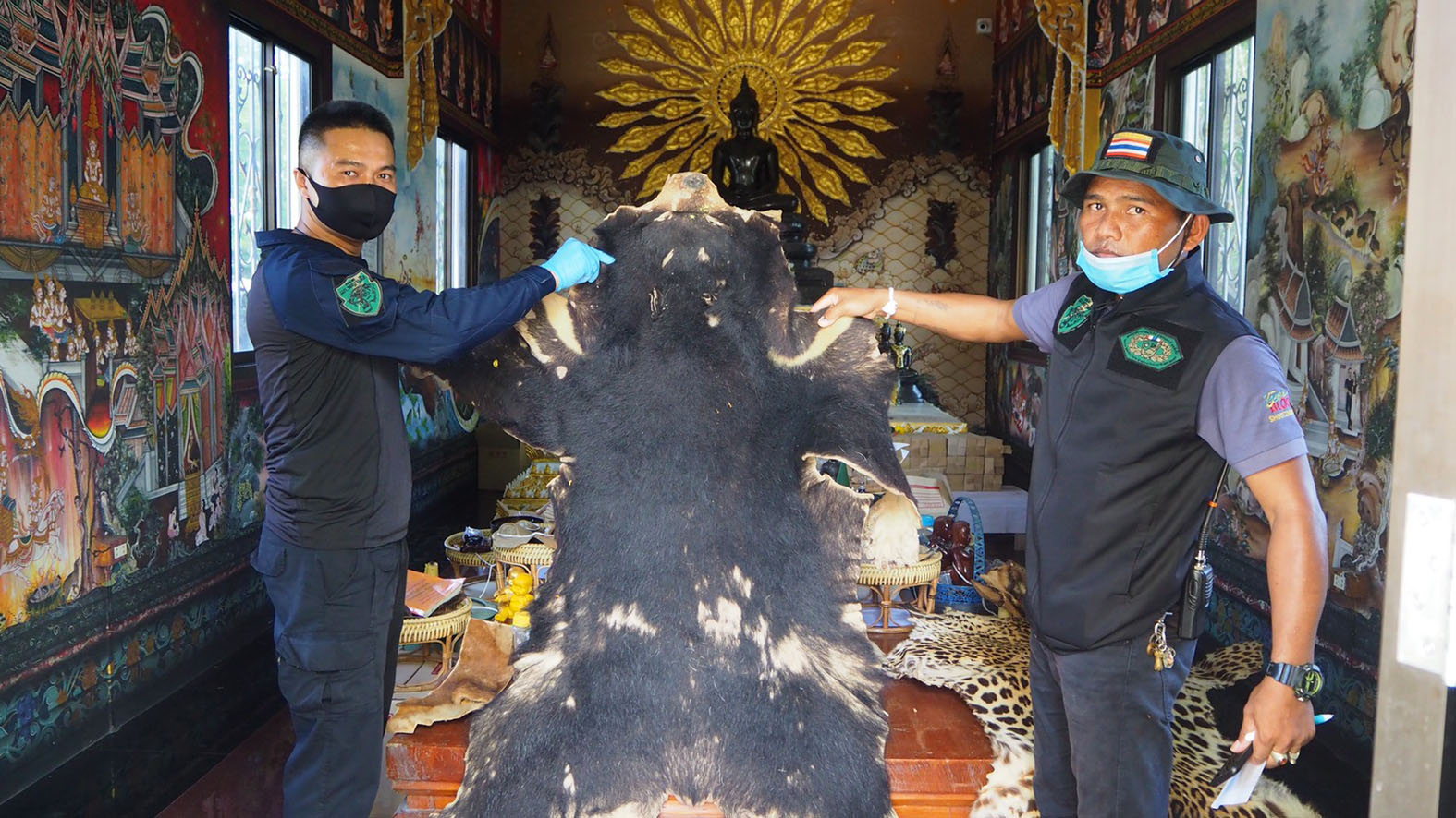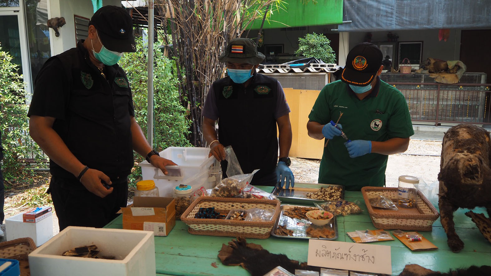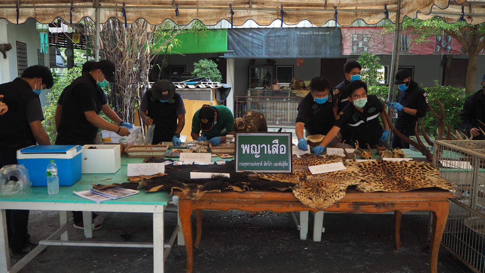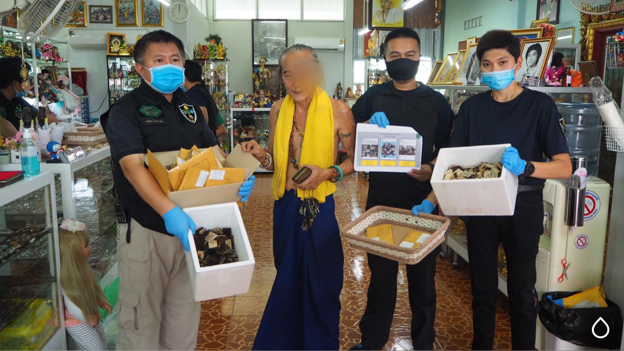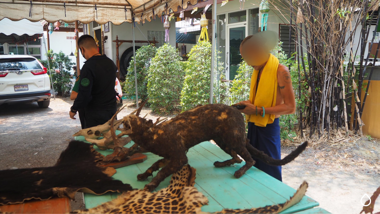 ด้านนายพนัชกร โพธิบัณฑิต หัวหน้าชุดพญาเสือ เปิดเผยว่าการปฏิบัติงานตรวจสอบการครอบครองและค้าซากสัตว์ป่าสงวนและซากสัตว์ป่าคุ้มครองทางสื่อออนไลน์ ของบุคคลซึ่งใช้ชื่อเฟสบุ๊ก “ไตรเวทย์ อ้อมทอง” ตามนโยบาย/ข้อสั่งการของ นายวราวุธ ศิลปอาชา รวม.ทส. ดร.ยุทธพล อังกินันทน์ ที่ปรึกษา รมว.ทส. และ นายธัญญา เนติธรรมกุล ท่านอธิบดี อส. ให้สืบสวนติดตามจับกุมผู้ใช้เฟสบุ๊คที่ชื่อว่า ไตรเวทร์ อ้อมทอง ที่ ได้ประกาศขายวัตถุมงคลและเครื่องรางของขลัง ที่ทำมาจากซากสัตว์ป่าที่ผิดกฎหมาย ในโลกโซเซียล จึงได้ติดตามกว่า 1 สัปดาห์ จากนั้นเจ้าหน้าที่ได้รวบรวมพยานหลักฐาน ขอหมายบุกเข้าตรวจค้นสำนักดังกล่าว กระทั่งพบของกลางเป็นซากสัตว์ป่าหลายรายการซุกซ่อนอยู่จำนวนมาก เบื้องต้นแจ้งข้อกล่าวหาแก่นายไตรเวย์ อ้อมทอง ในข้อหาครอบครองซากสัตว์ป่าโดยไม่ได้รับอนุญาต และค้าซากสัตว์ป่าโดยไม่ได้รับอนุญาต หากมีพยานหลักฐานว่ามีการส่งขายทั้งในประเทศและต่างประเทศก็จะแจ้งข้องหาเพิ่มเติมอีก
