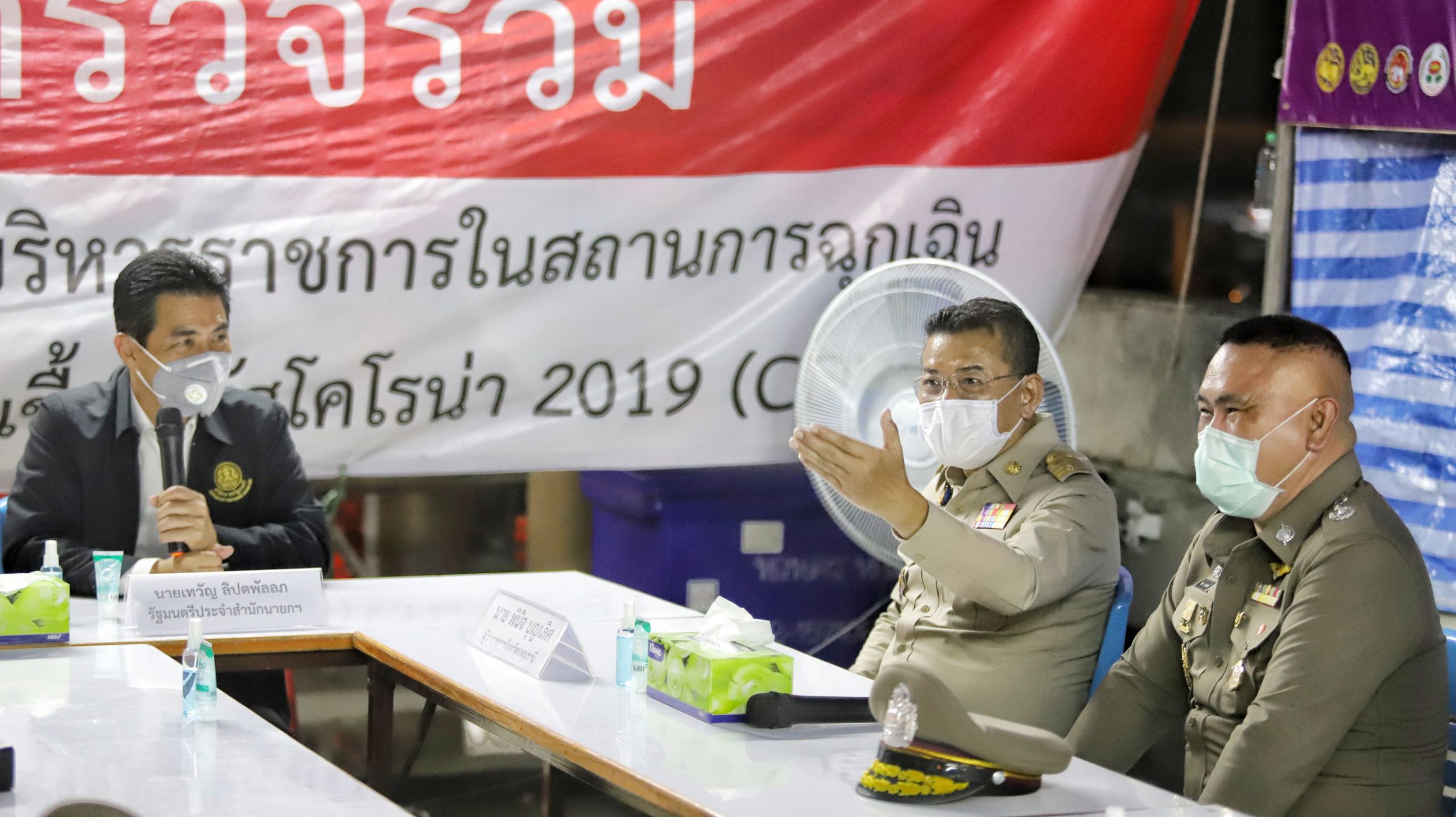 จากนั้นได้ร่วมประชุมติดตามสถานการณ์ โดยมีดร.พินิจ บุญเลิศ ผู้ว่าราชการจังหวัดปทุมธานี และพล.ต.ต.ชยุต มารยาทตร์ ผู้บังคับการตำรวจภูธรจังหวัดปทุมธานี บรรยายสรุปสถานการณ์การดำเนินงานของด่านเคอร์ฟิวจุดคัดกรองเพื่อป้องกันการแพร่ระบาดของเชื้อไวรัสโควิด-19 ในจังหวัดปทุมธานี