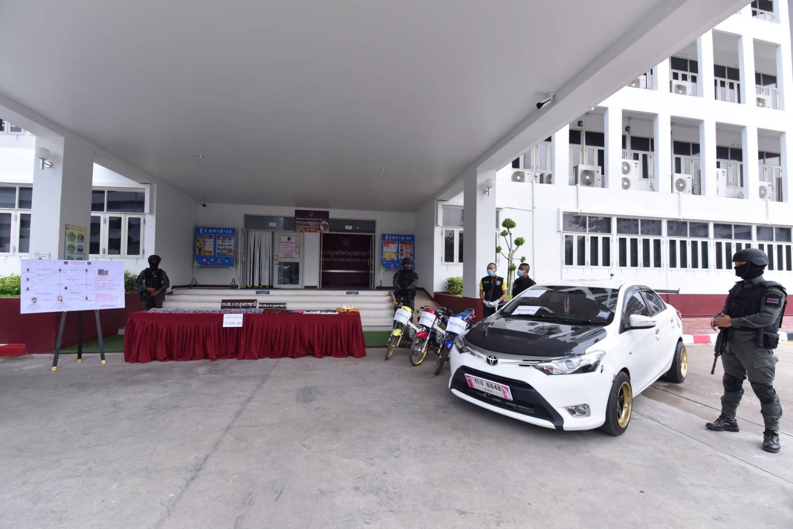 ยาบ้า จำนวน 37,689 เม็ด ยาไอซ์ จำนวนสามถุงเล็กน้ำหนักรวม 85.4 กรัม อาวุธปืนสั้นไทยประดิษฐ์ จำนวน 2 กระบอก เครื่องกระสุนปืนขนาด .38 จำนวน 20 นัด โทรศัพท์มือถือ จำนวน 2 เครื่อง รถยนต์ ยี่ห้อโตโยต้า รุ่นวีออส สีขาว หมายเลขทะเบียน กง 8848 ยโสธร จำนวน 1 คัน 7.รถยนต์ ยี่ห้อฟอร์ด รุ่นไฮไรเดอร์ สีขาวหมายเลขทะเบียน 1ฒพ 6201 กรุงเทพมหานคร จำนวน 1 คัน 8.รถจักรยานยนต์ ยี่ห้อฮอนด้า รุ่นโซนิค ไม่ติดแผ่นป้ายทะเบียน จำนวน 3 คัน สมุดบัญชีธนาคาร จำนวน 4 เล่ม