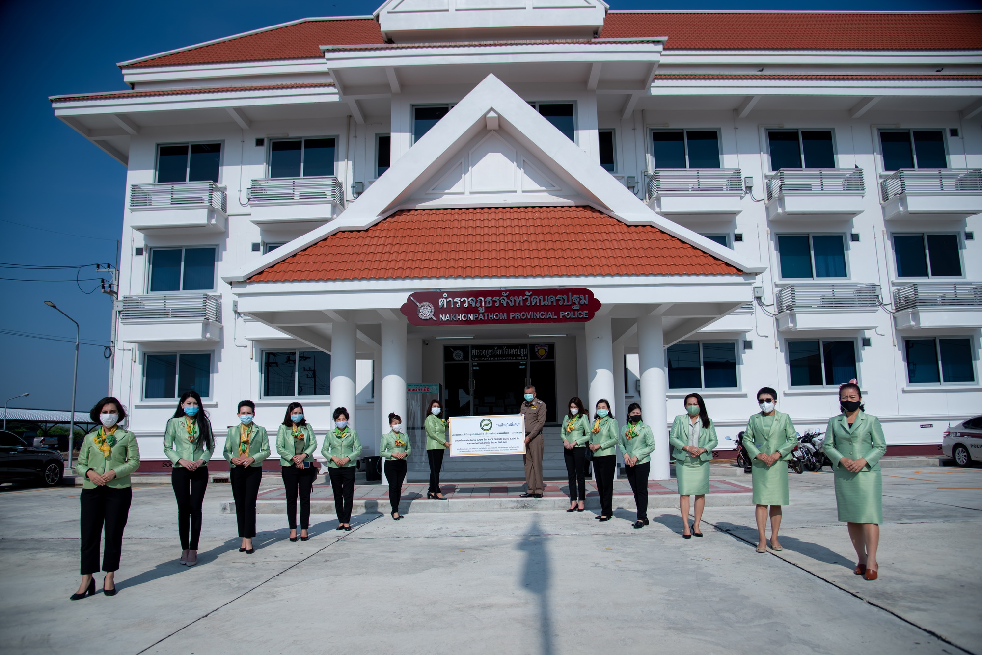 มอบสิ่งของหน้ากากอนามัยแบบผ้า 1,200 ชิ้น Face shield 1,800 ชิ้น และเจลแอลกอฮอล์ทำความสะอาดมือจำนวน 360 ลิตร ให้กับ พล.ต.ต.คำรณ บุญเลิศ ผู้บังคับการตำรวจภูธรจังหวัดนครปฐม เพื่อส่งมอบให้สถานีตำรวจภูธรในพื้นที่จังหวัดนครปฐม ในการใช้ปฏิบัติหน้าที่การให้บริการประชาชนในช่วงสถานการณ์โควิด-19 และเป็นกำลังใจให้ข้าราชการตำรวจปฏิบัติหน้าที่เพื่อประชาชนต่อไป