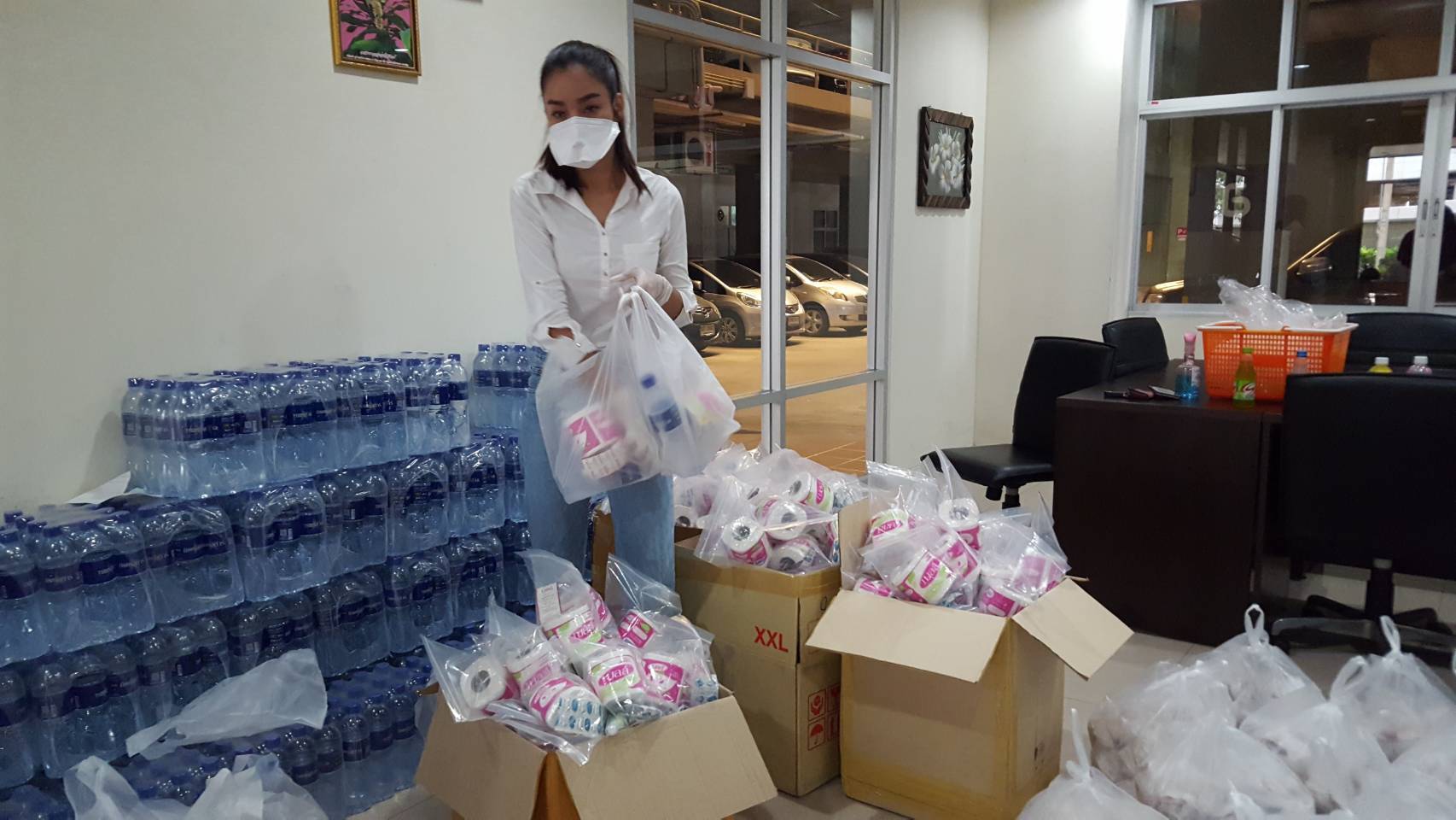 เมื่อเวลา 13.00 น. วันที่ 18 เม.ย.63 ที่สำนักงานส่วนบุคคลคอนโดลุมพินี ต.บางเขน อ.เมือง จ.นนทบุรี น.สปิยธิดา ยั่งยืน นักธุรกิจด้านอาหารเสริม พร้อมด้วย น.ส.ธัญชนก มูลนิลตา อายุ 27 ปี หรือน้องเฟรนฟราย มิสไทยแลนด์เวิลด์ 2015 และกลุ่มเพื่อน ๆ ได้ช่วยกันบรรจุสิ่งของ อาทิ กระดาษทิชชู่ ยารักษาโรค เคริื่องอุปโภค-บริโภค รวมทั้งข้าวเหนียว-ไก่ทอด น้ำดื่ม จำนวน 500 ชุด เพื่อนำไปช่วยเหลือผู้ที่ได้รับผลกระทบจากโรคไวรัสโควิด-19 ซึ่งได้รับความลำบากอย่างมากต้องนอนอยู่ตามสวนลุมพินีและสถานีรถไฟหัวลำโพงตามที่โลกโซเชี่ยลแชร์ภาพกันจนเป็นที่น่าสงสาร