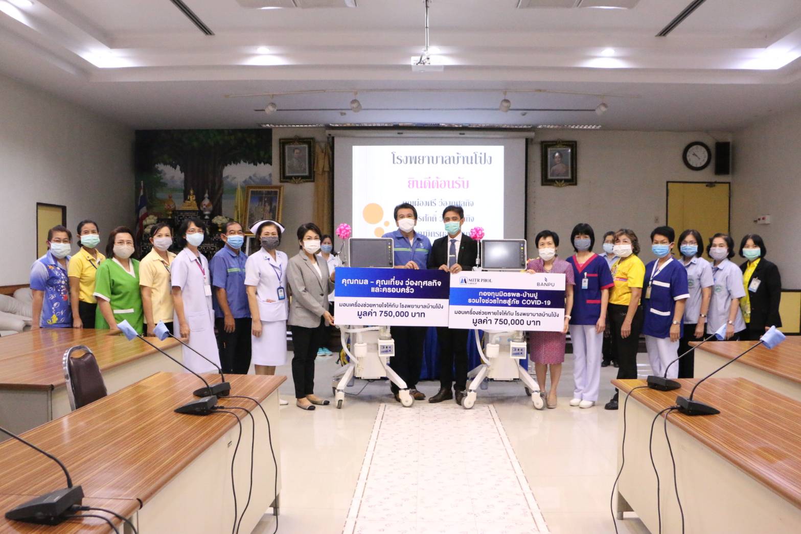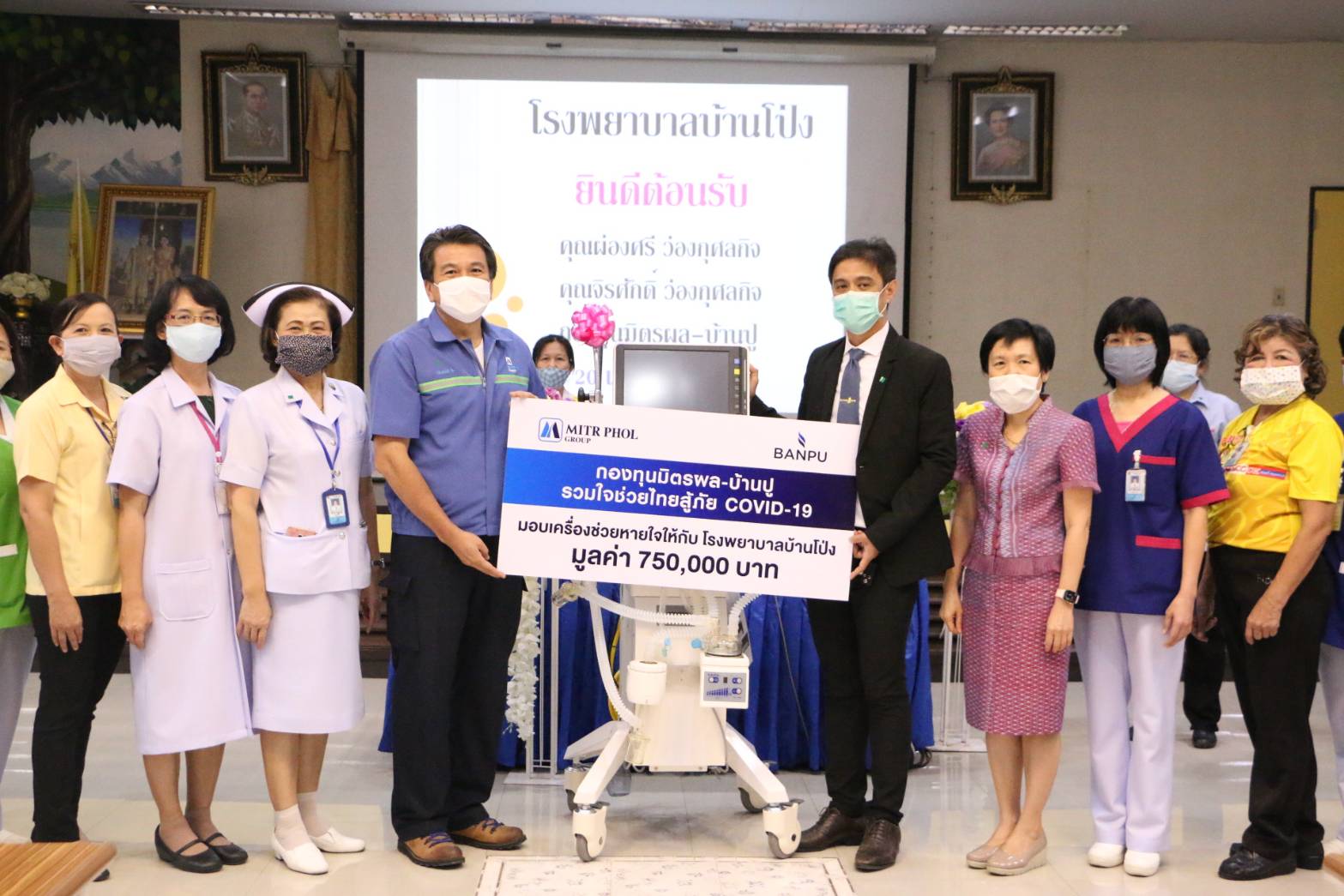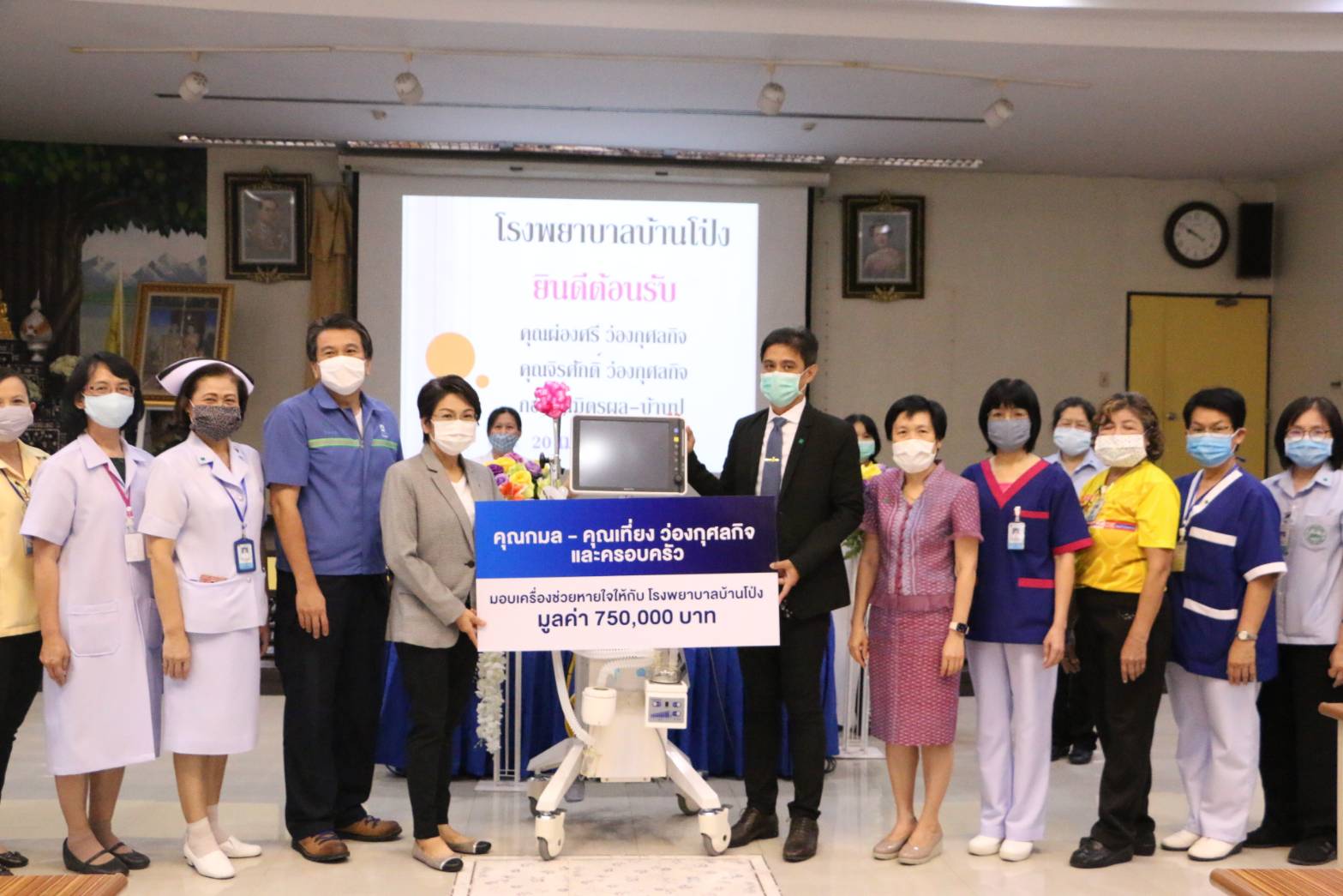 กมล -เที่ยง ว่องกุศลกิจและครอบครัว มอบเครื่องช่วยหายใจ ให้กับโรงพยาบาลบ้านโป่ง มูลค่า 750,000 บ. พร้อมด้วยกองทุนรวมมิตรผล-บ้านปู รวมใจช่วยไทยสู้ภัย COVID-19 มอบเครื่องช่วยหายใจให้กับโรงพยาบาลบ้านโป่งอีกมูลค่า 750,000 บ. รวมทั้งสิ้น 1,500,000 บ. เพื่อช่วยในการหายใจของผู้ป่วย ที่ติดเชื้อไวรัส ที่หายใจเองไม่ได้ต้องใช้อุปกรณ์ ชิ้นนี้ถือว่าเป็นอุปกรณ์ที่สำคัญที่ต้องใช้ในการรักษา