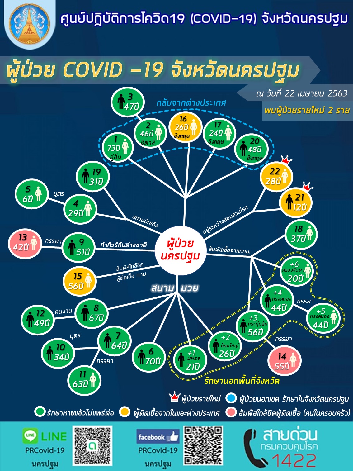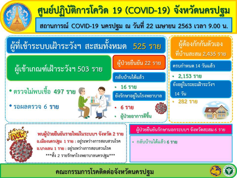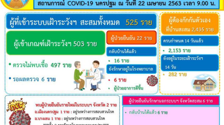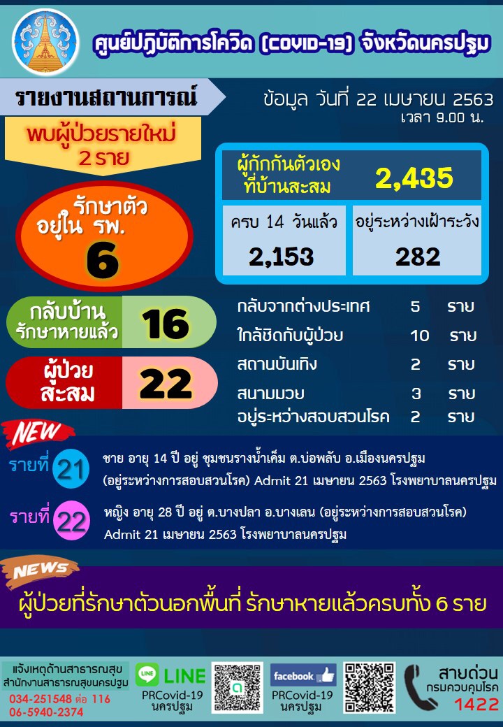 สถานการณ์โควิด จ.นครปฐม ประจำวันที่ 22 เมษายน 2563 พบผู้ป่วยโควิดเพิ่ม 2 ราย