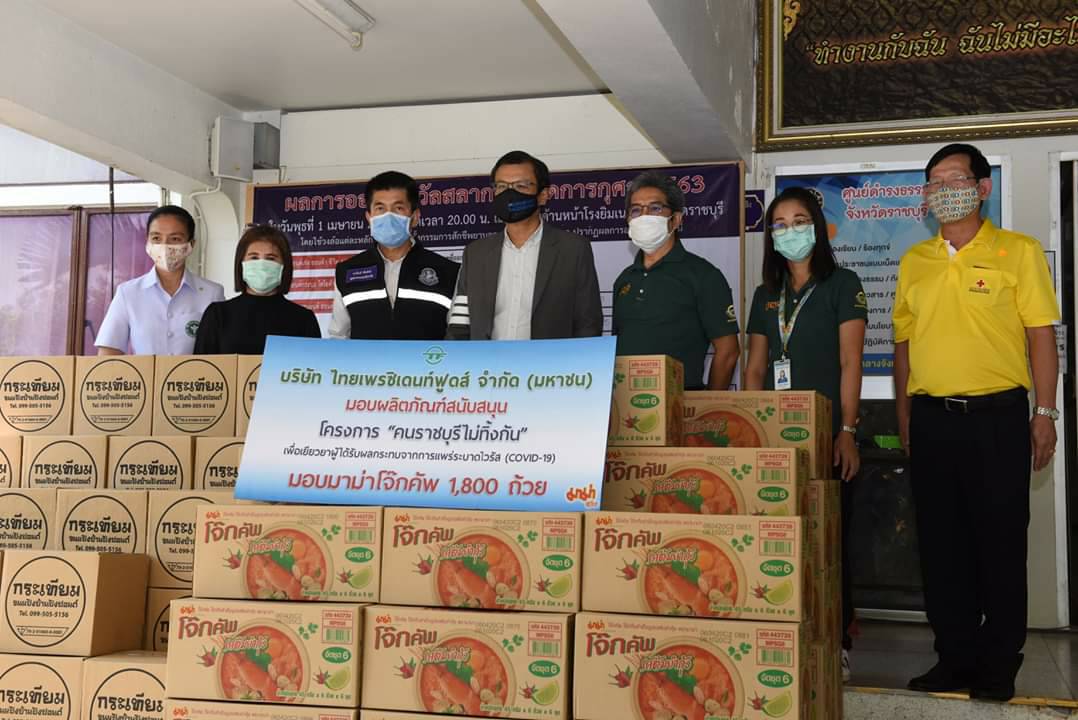 พร้อมกันนี้บริษัท ไทยเพรซิเดนท์ฟูดส์ จำกัด (มหาชน) มอบผลิตภัณฑ์ โจ๊กคัพจำนวน 1,800 ถ้วย และคุณระวี อารยะวัฒนเวช กรรมการผู้จัดการบริษัทเทพประทานการแร่ ราชบุรี มอบเงิน จำนวน 100,000 บาท เพื่อเข้าโครงการ “คนราชบุรีไม่ทิ้งกัน” ในการนำไปเยียวยาผู้ได้รับผลกระทบจากการแพร่ระบาดไวรัสโควิด-19 แก่ชาวราชบุรีต่อไป