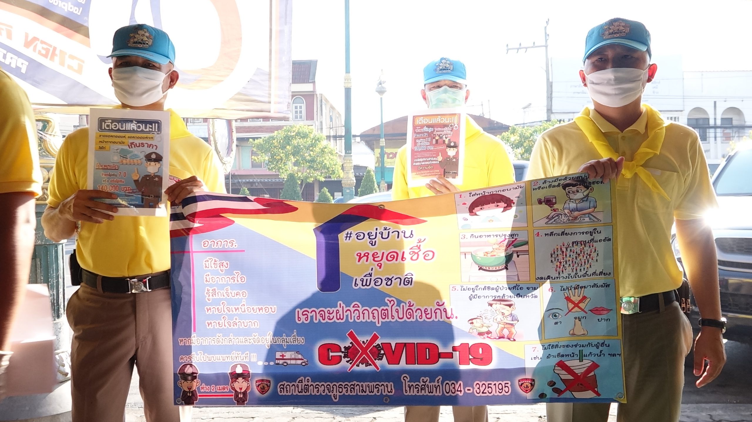 สภ.สามพราน ร่วมกับ รพ.สามพรานออกรณรงค์ให้ความรู้การล้างมือและความรู้เรื่องกฎหมายพร้อมแจกface shield ในสถานการณ์โรคระบาดไวรัสโคโรนา (โควิด-19) ซึ่งมี พ.ต.อ.วิสูตร สถิตย์ ผกก.สภ.สามพราน นำคณะนายตำรวจ ให้ความรู้เรื่องกฎหมายการประกาศเคอรฟิว พร้อมแจกหน้ากากอนามัย และface shieldให้แม่ค้าและผู้จับจ่ายในตลาดขุนแผน เพื่อความปลอดภัยจากโรคโควิด-19 และการปฎิบัติตามกฎหมายภาวะฉุกเฉิน รวมทั้งเชิญ เจ้าหน้าที่โรงพยาบาลสามพราน โดยมีนางพัชรี เกษรบุญนาค หัวหน้ากลุ่มงานบริการด้านปฐมภูมิและองค์รวม พร้อมเจ้าหน้าที่ ให้ความรู้การล้างมืออย่างถูกต้อง