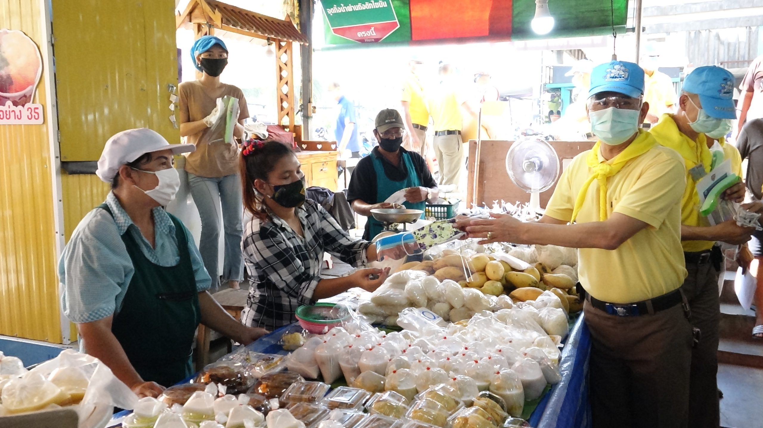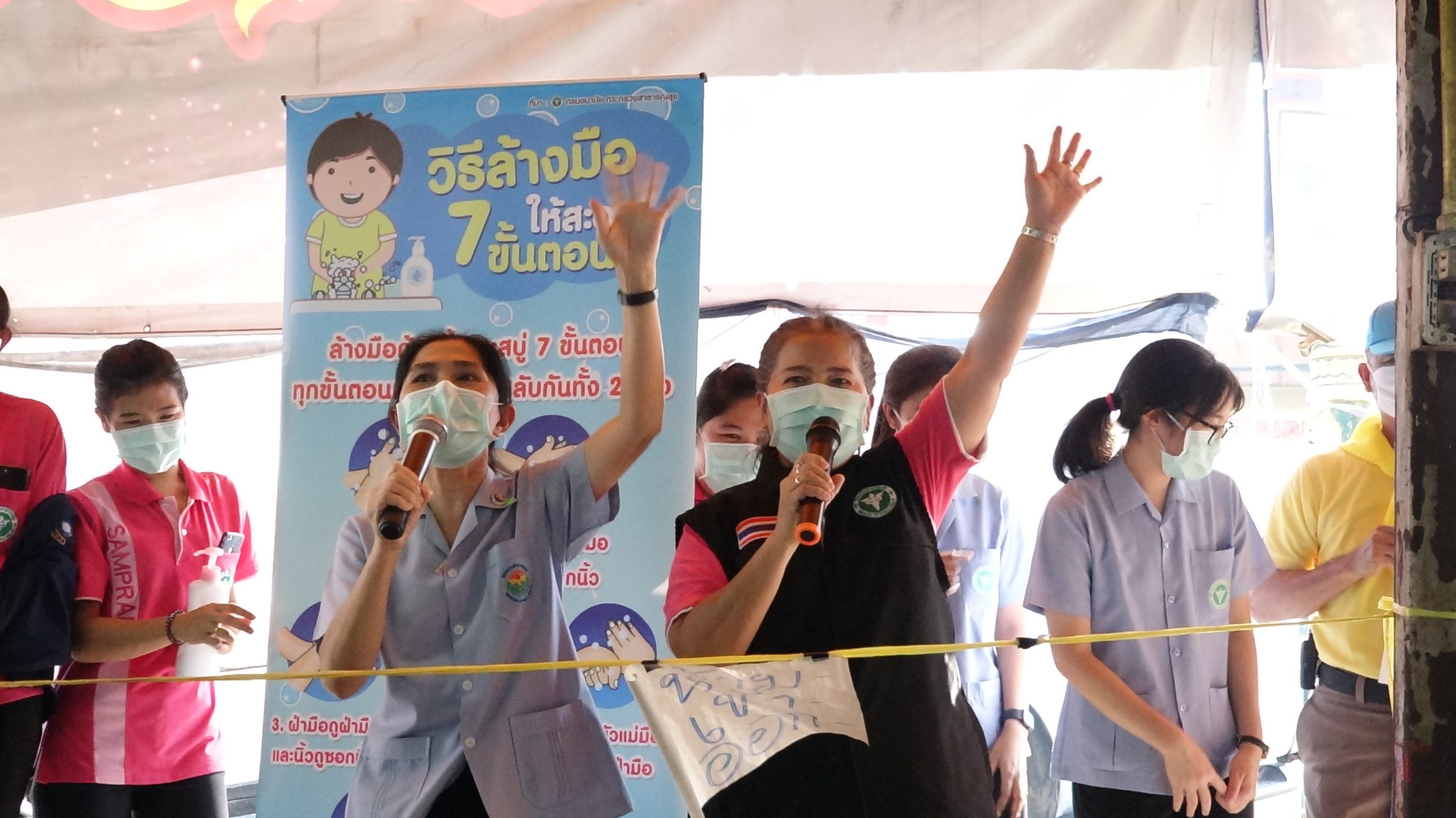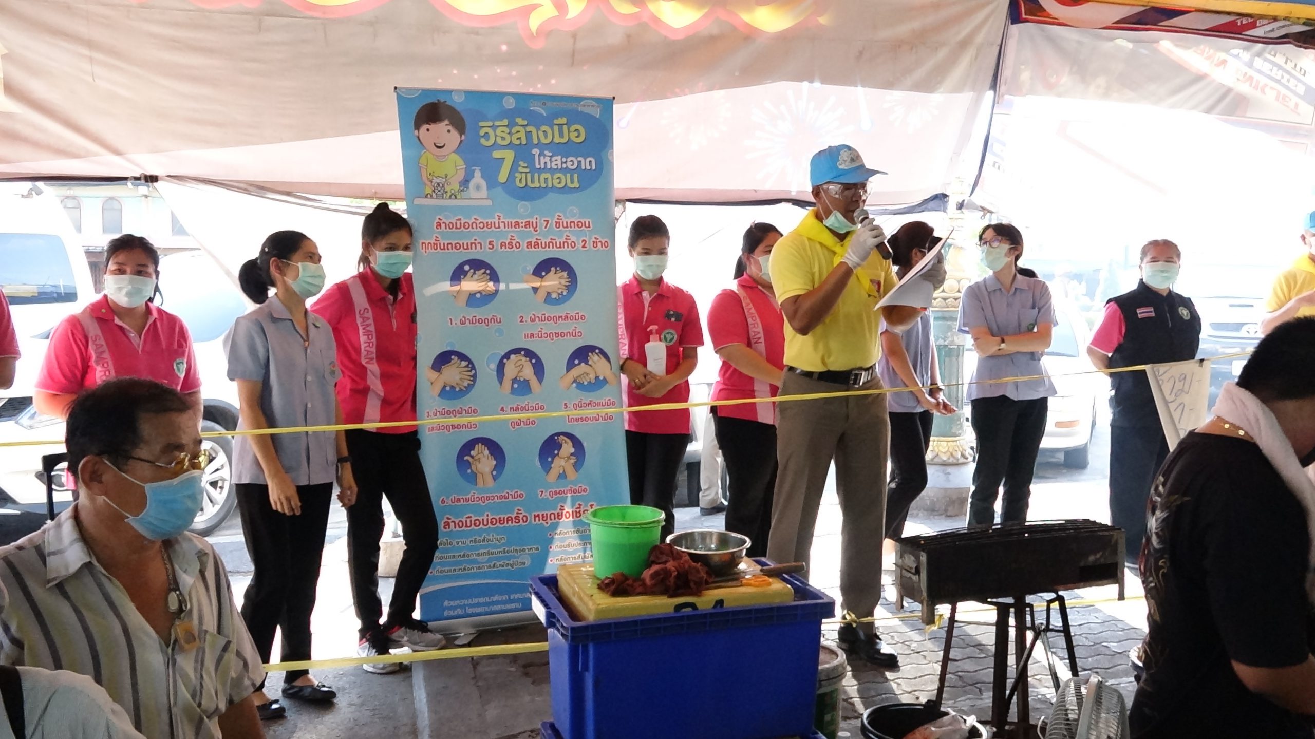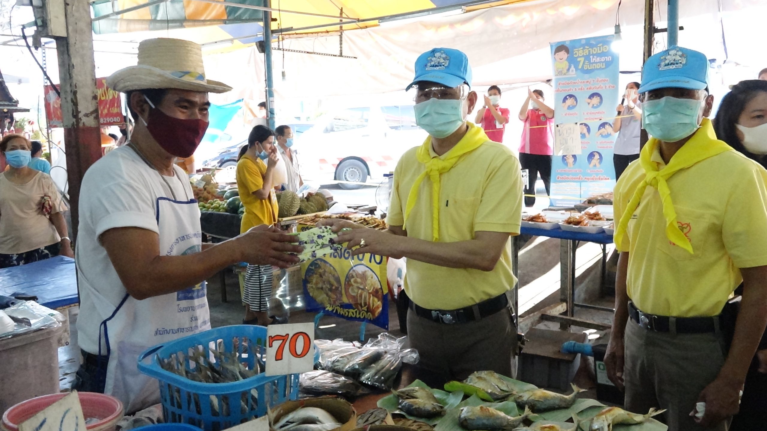 สภ.สามพรานร่วมกับรพ.สามพรานรณรงค์ให้ความรู้การล้างมือและกฎหมายพร้อมแจกface shieldแม่ค้าตลาดขุนแผน