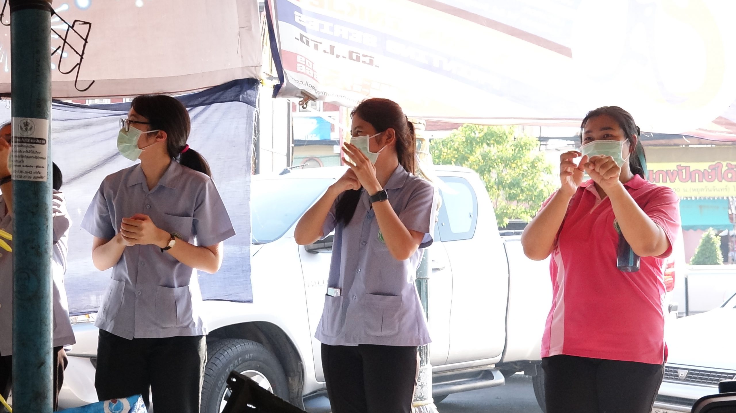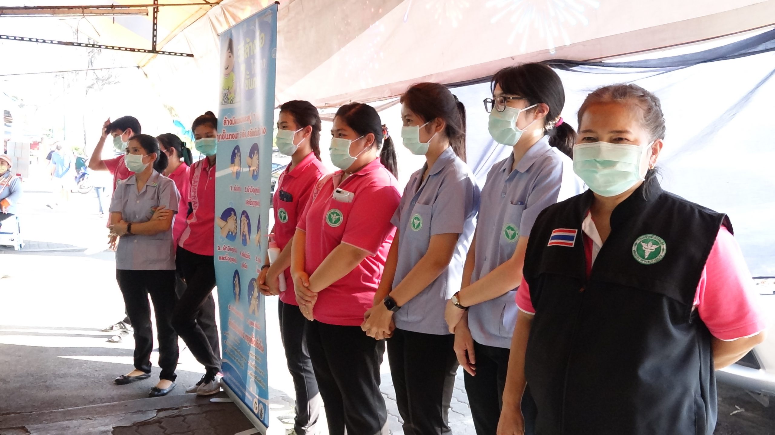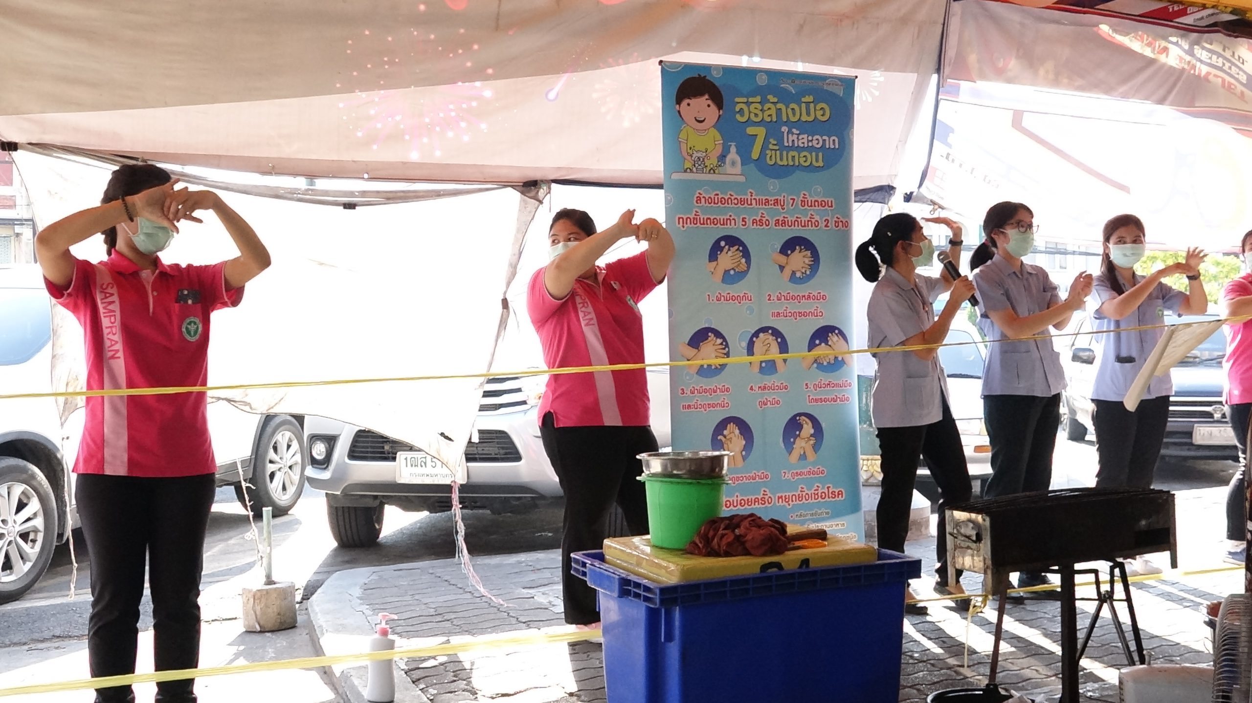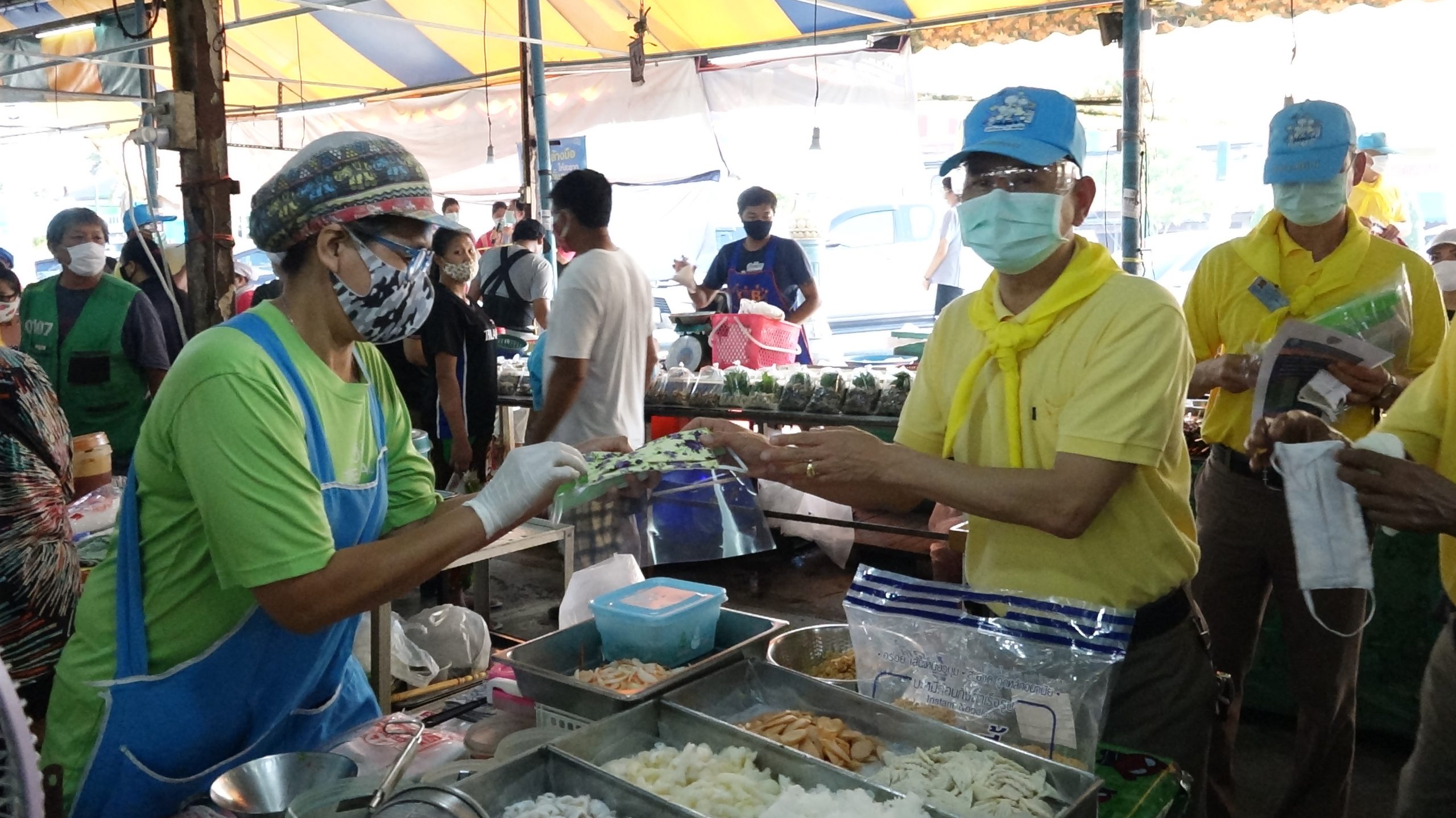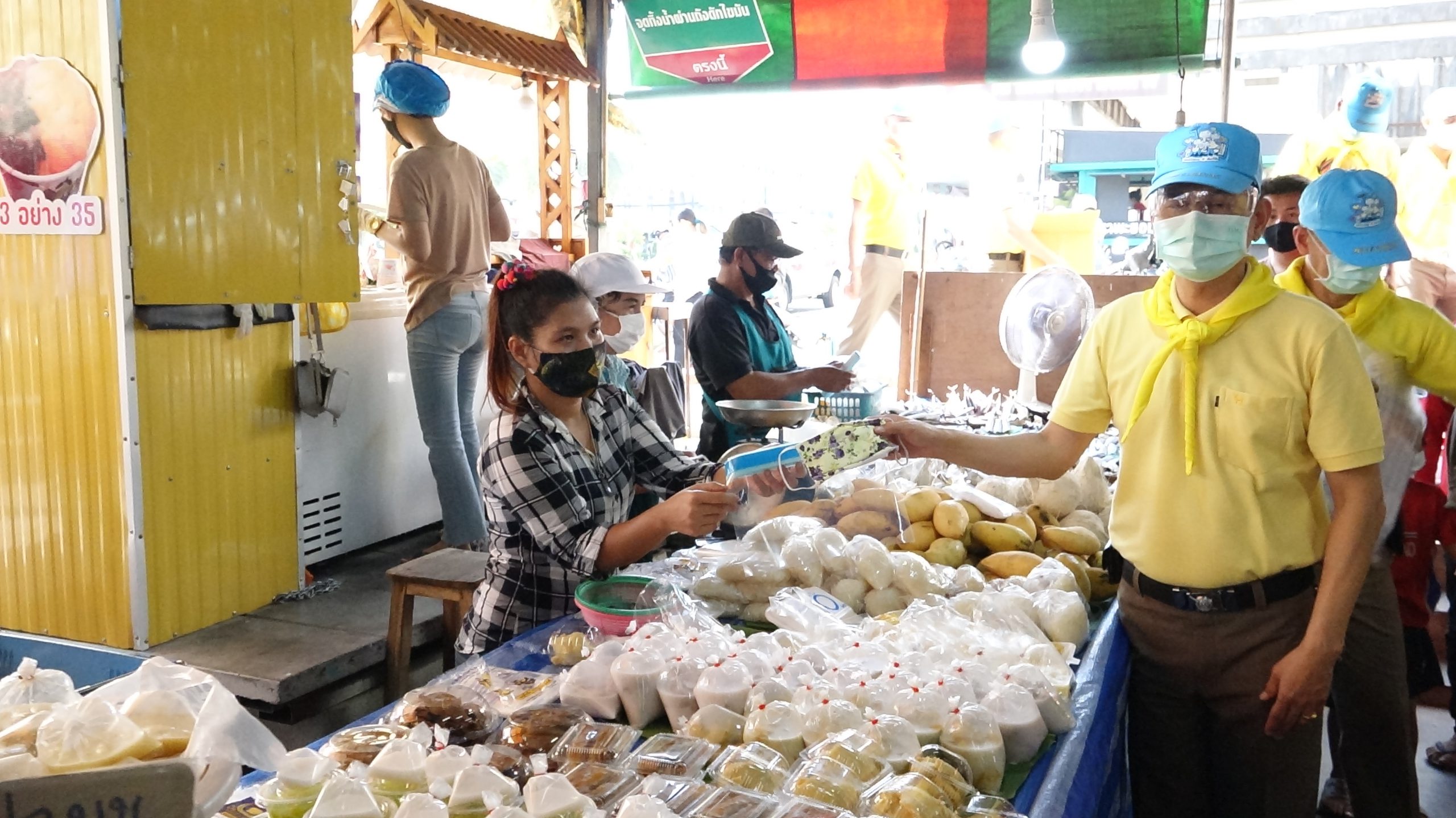 สภ.สามพรานร่วมกับรพ.สามพรานรณรงค์ให้ความรู้การล้างมือและกฎหมายพร้อมแจกface shieldแม่ค้าตลาดขุนแผน
