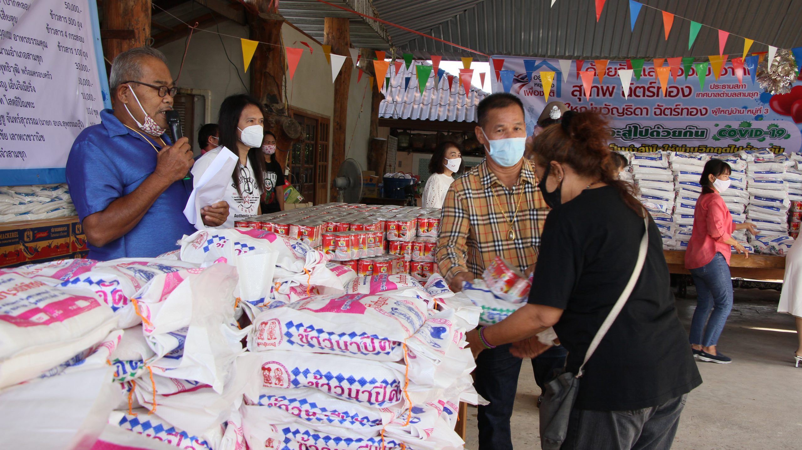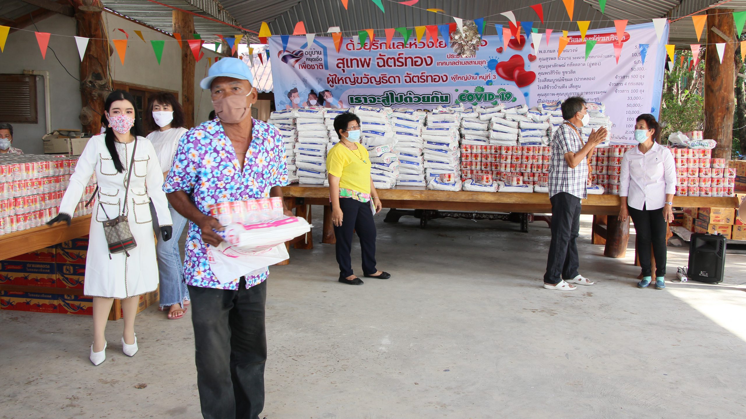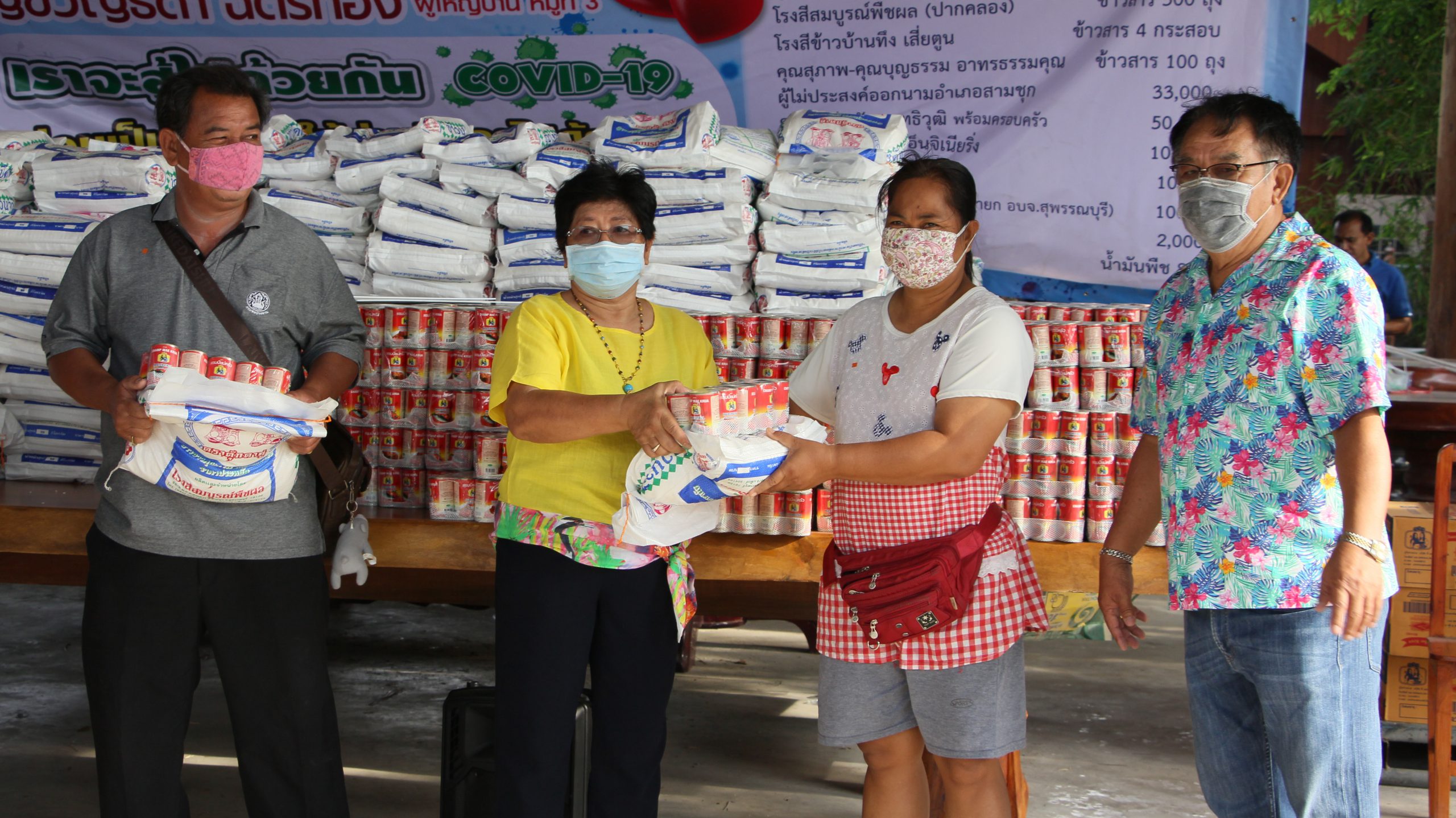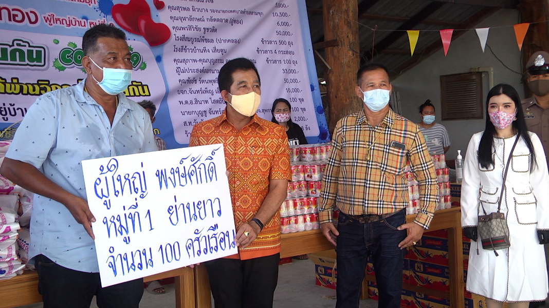 ซึ่งมี พ.อ.กมล ลักษณวงษ์ คุณจุฬาลักษณ์กลัดตลาด (อู่ทอง) คุณพรสิริชัย ชูชวลิต โรงสีสมบูรณ์พืชผล (ปากคลอง) โรงสีขาวบ้านทึง เสี่ยตูน คุณสุภาพ-คุณบุญธรรม อาทรธรรมคุณ คุณชัยรัช รัตนพุทธิวุฒิ พร้อมครอบครัว บจก.จันทร์เพ็ญ เอ็นจิเนียริ่ง พ.ต.อ.สินาท โสตถิปิณฑะนายกบุญชู จันทร์สุวรรณ(นายก อบจ.สุพรรณบุรี) ส.ท.วันชัย เลาหเวชวานิช และ ร้านแจ๋วสามชุก และผู้มีจิตศรัทราอีกหลายรายได้ร่วมกันบริจาคสิ่งของ เพื่อนำมาแจกให้พี่น้องประชาชนที่ได้รับผลกระทบจากปัญหาภัยไวรัสโควิด19ระบาด