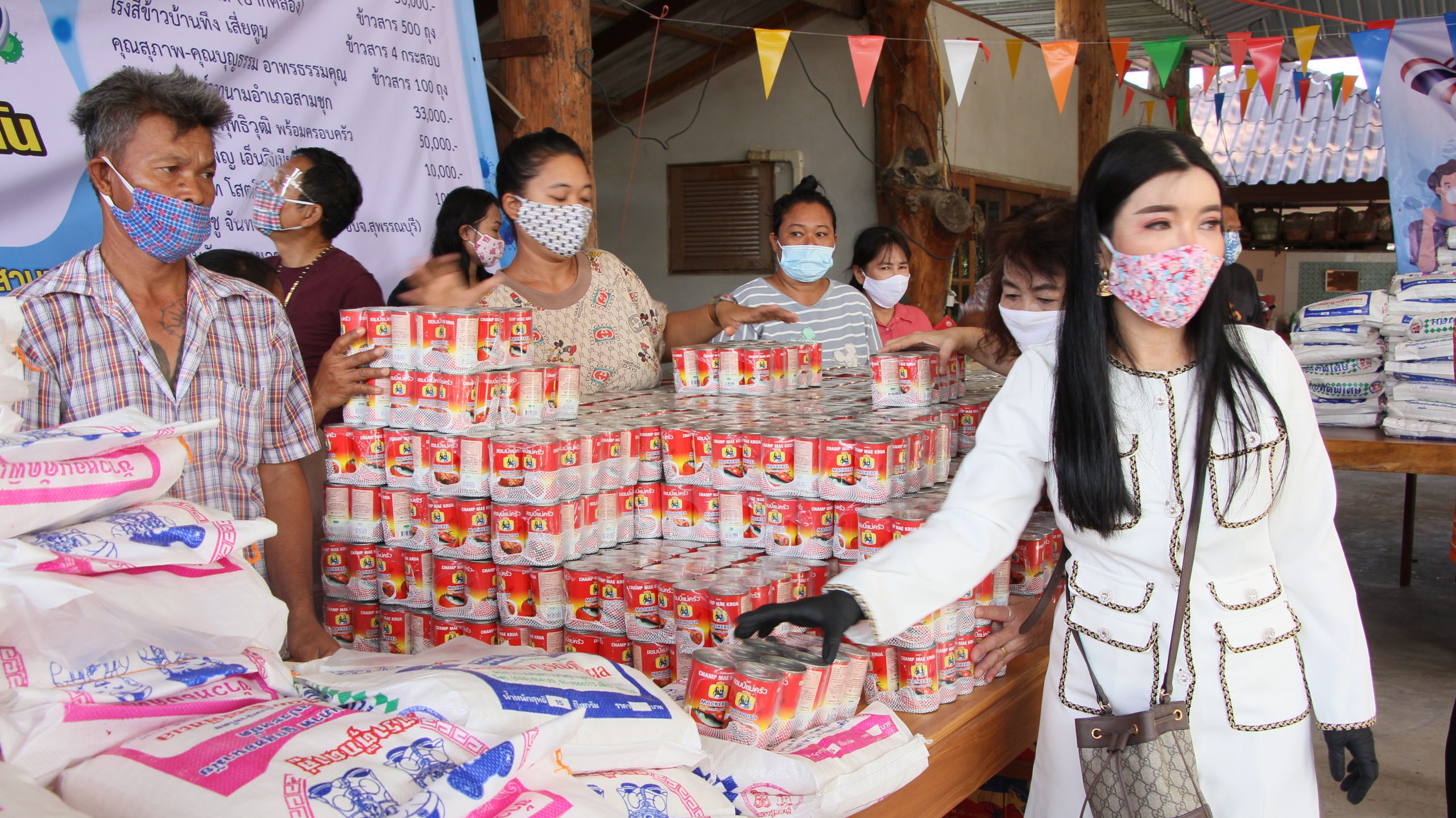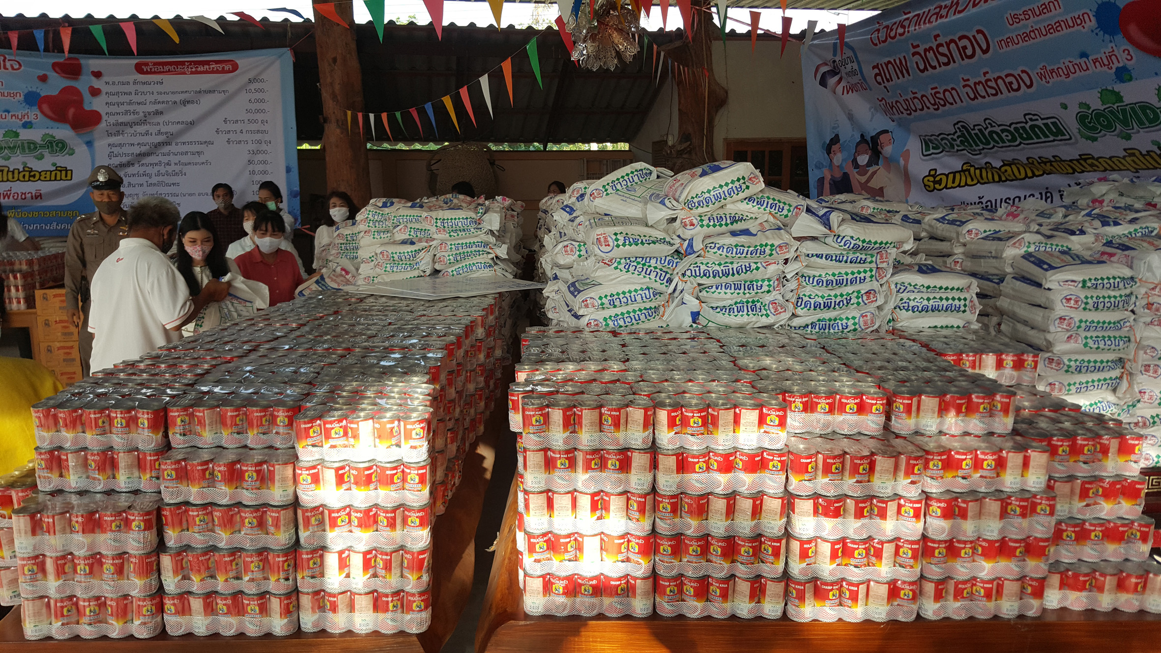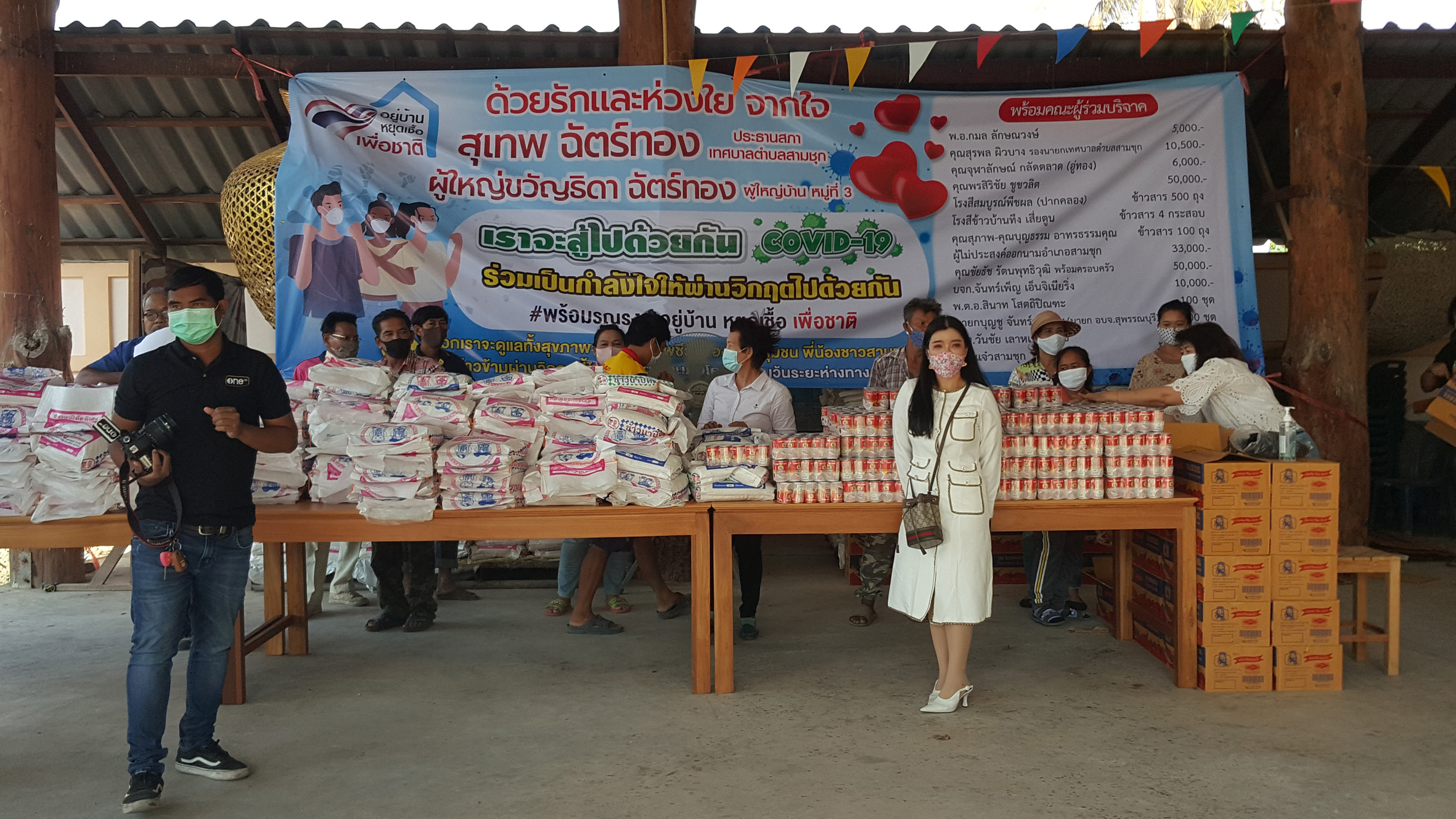 ซึ่งมี พ.อ.กมล ลักษณวงษ์ คุณจุฬาลักษณ์กลัดตลาด (อู่ทอง) คุณพรสิริชัย ชูชวลิต โรงสีสมบูรณ์พืชผล (ปากคลอง) โรงสีขาวบ้านทึง เสี่ยตูน คุณสุภาพ-คุณบุญธรรม อาทรธรรมคุณ คุณชัยรัช รัตนพุทธิวุฒิ พร้อมครอบครัว บจก.จันทร์เพ็ญ เอ็นจิเนียริ่ง พ.ต.อ.สินาท โสตถิปิณฑะนายกบุญชู จันทร์สุวรรณ(นายก อบจ.สุพรรณบุรี) ส.ท.วันชัย เลาหเวชวานิช และ ร้านแจ๋วสามชุก และผู้มีจิตศรัทราอีกหลายรายได้ร่วมกันบริจาคสิ่งของ เพื่อนำมาแจกให้พี่น้องประชาชนที่ได้รับผลกระทบจากปัญหาภัยไวรัสโควิด19ระบาด