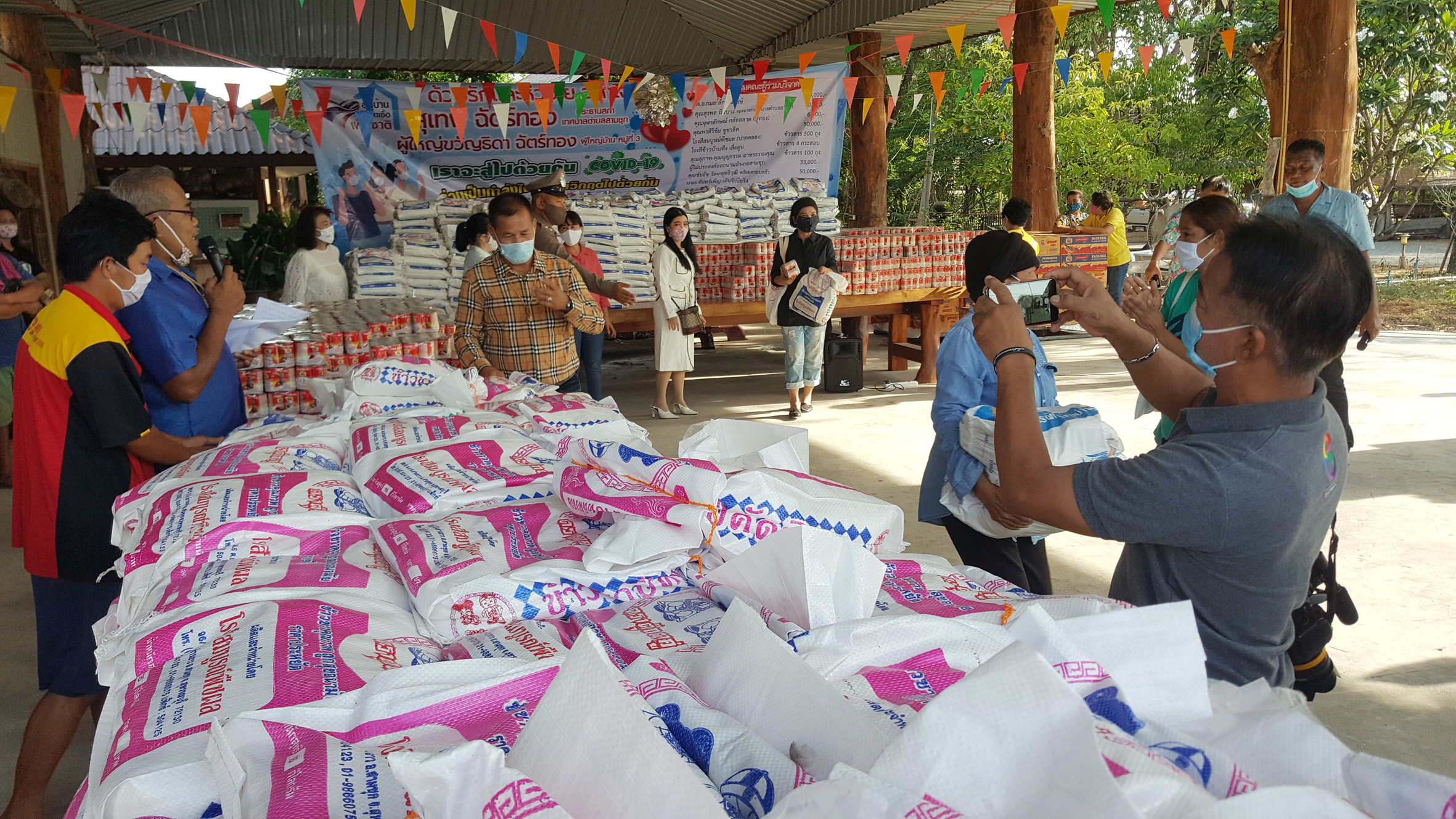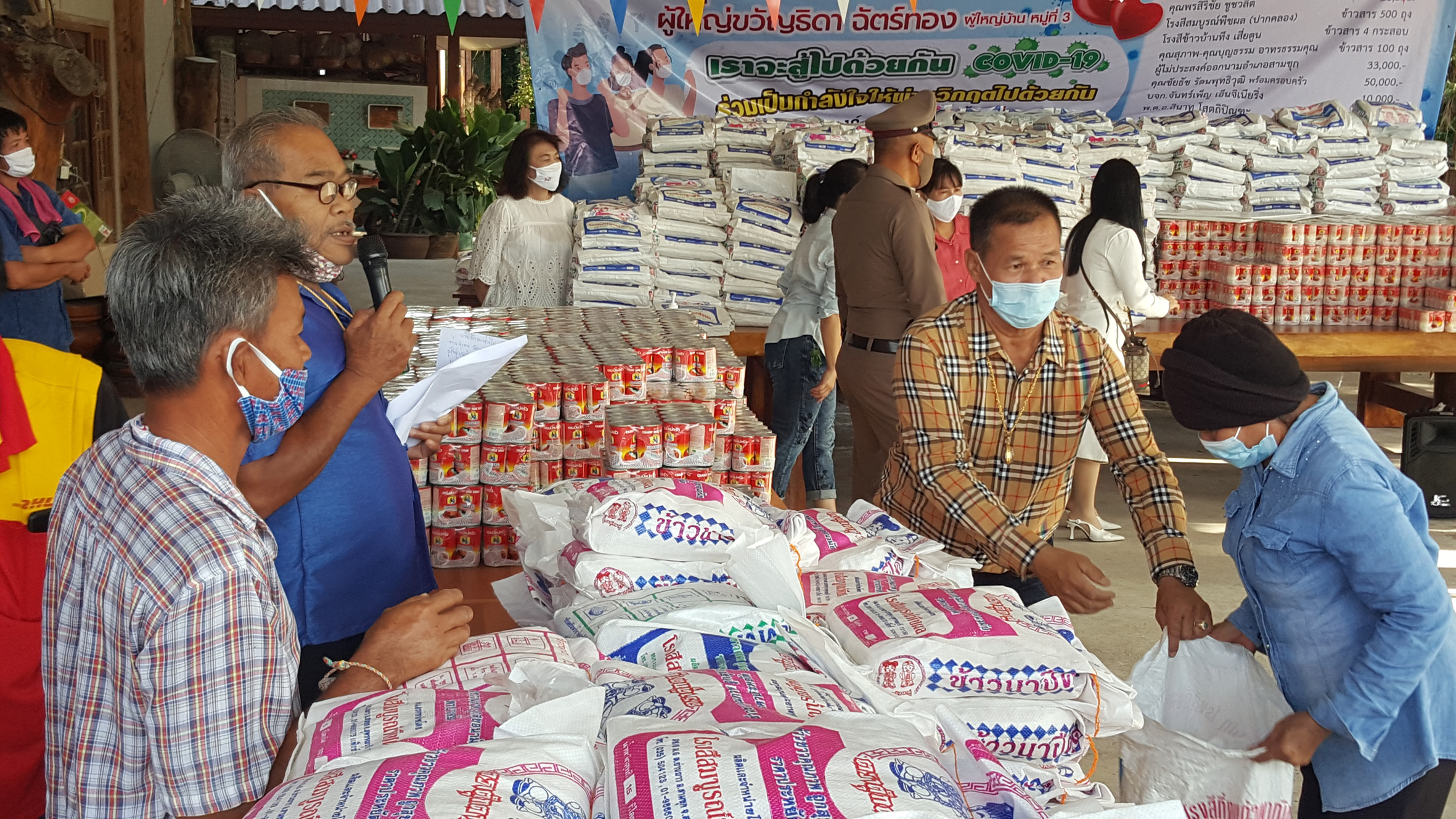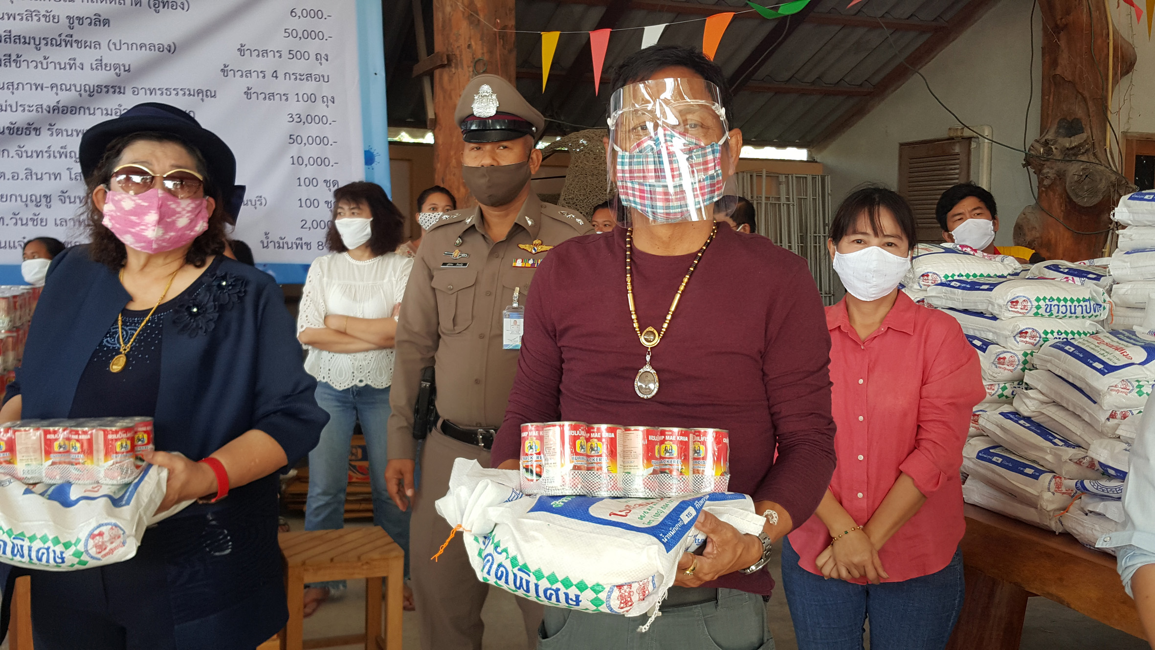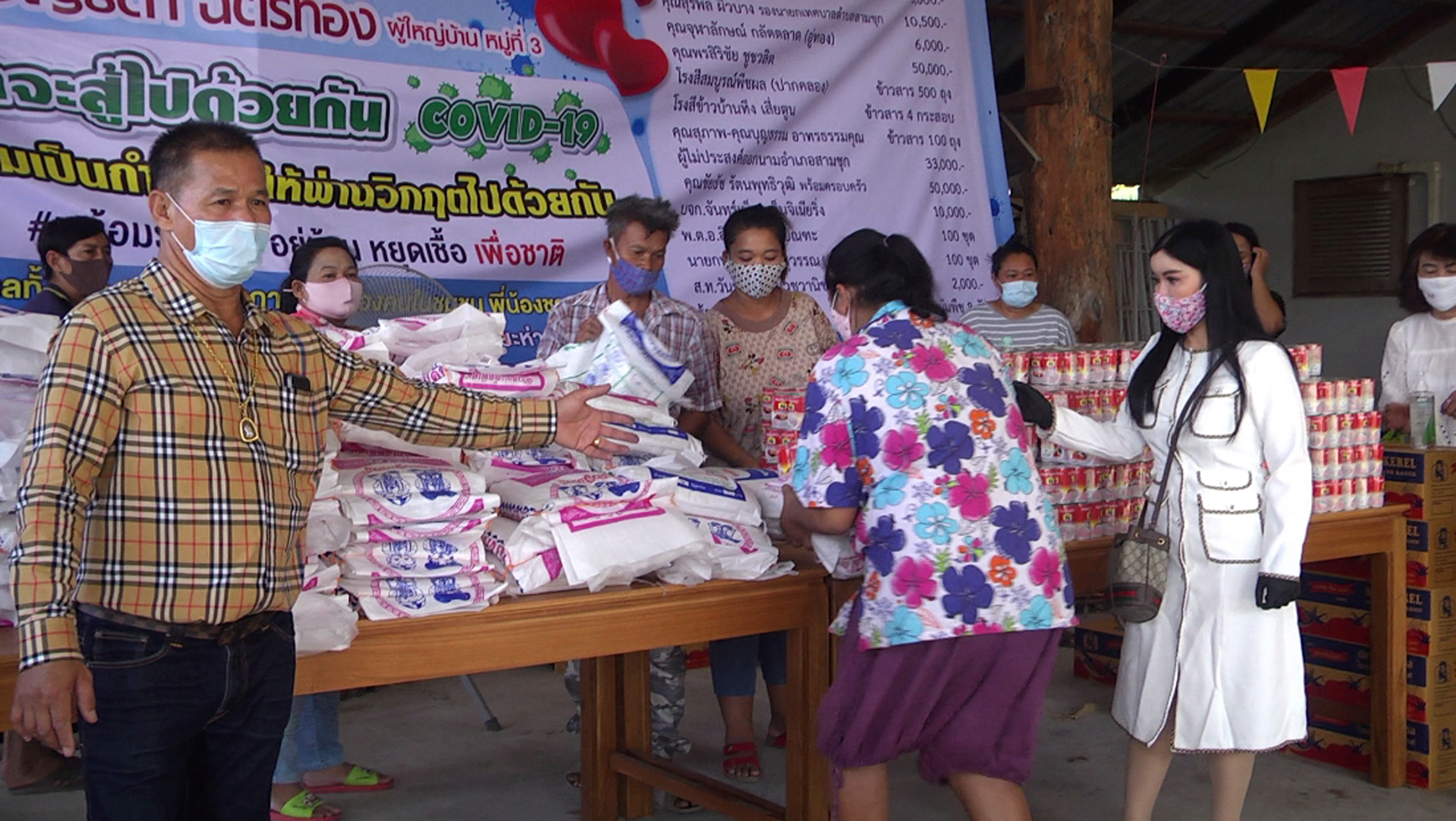 ซึ่งมี พ.อ.กมล ลักษณวงษ์ คุณจุฬาลักษณ์กลัดตลาด (อู่ทอง) คุณพรสิริชัย ชูชวลิต โรงสีสมบูรณ์พืชผล (ปากคลอง) โรงสีขาวบ้านทึง เสี่ยตูน คุณสุภาพ-คุณบุญธรรม อาทรธรรมคุณ คุณชัยรัช รัตนพุทธิวุฒิ พร้อมครอบครัว บจก.จันทร์เพ็ญ เอ็นจิเนียริ่ง พ.ต.อ.สินาท โสตถิปิณฑะนายกบุญชู จันทร์สุวรรณ(นายก อบจ.สุพรรณบุรี) ส.ท.วันชัย เลาหเวชวานิช และ ร้านแจ๋วสามชุก และผู้มีจิตศรัทราอีกหลายรายได้ร่วมกันบริจาคสิ่งของ เพื่อนำมาแจกให้พี่น้องประชาชนที่ได้รับผลกระทบจากปัญหาภัยไวรัสโควิด19ระบาด