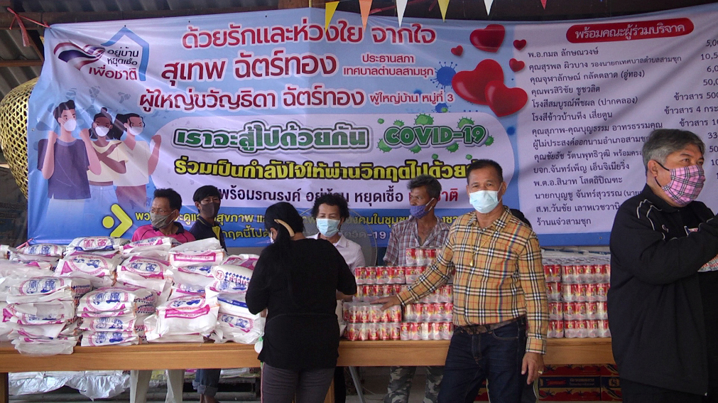 ด้านนายสุเทพ ฉัตรทอง ประธานสภาเทศบาลตำบลสามชุก จ.สุพรรณบุรี เปิดเผยว่าจากปัญหาไวรัสโควิด19ระบาด ส่งผลให้พี่น้องน้องประชาชนได้รับความเดือดร้อนกันอย่างต่อเนื่อง สำหรับพื้นที่ ต.สามชุก อ.สามชุก มีทั้งหมดจำนวน 20 ชุมชน จำนวน กว่า 3,000 หลังคาเรือน ชาวบ้าส่วนใหญ่ไม่ได้ทำงานไม่มีเงิน เนื่องจากต้อง “อยู่บ้าน หยุดเชื้อ เพื่อชาติ” ตามประกาศจากภาครัฐ จึงได้เสียสละควักกระเป๋าใช้เงินส่วนตัวและได้ร่วมกับผู้มีจิตศรัทธาร่วมบริจาคสิ่งของเป็นข้าวสาร ปลากระป๋อง รวมกว่า 3,000 ชุด นำมาแจกจ่ายให้กับพี่น้องประชาชน สู้ภัยไวรัสโควิด19 เป็นการบรรเทาความเดือดร้อนเบื้องต้น ซึ่งจะเป็นการแบ่งเบาภาระค่าใช้จ่ายในชีวิตประจำวันของชาวบ้าน ขอให้พี่น้องประชาชนทำตามประกาศทางภาครัฐ และอดทนต่อสู้กับไวรัสโควิด19 เชื่อว่าพี่น้องประชาชนทุกคนจะผ่านพ้นวิกฤตไวรัสโควิด19ไปด้วยกัน