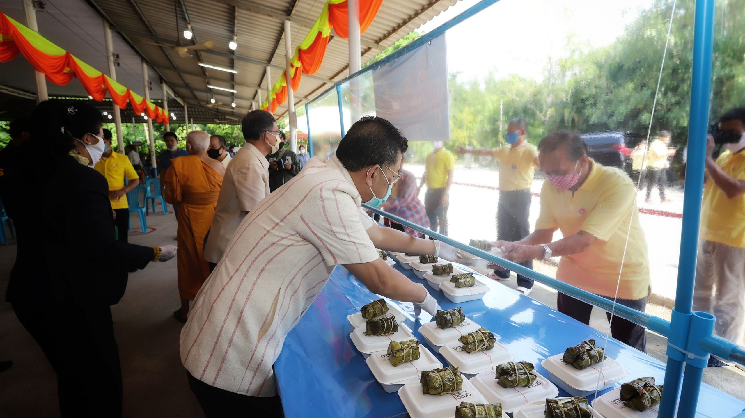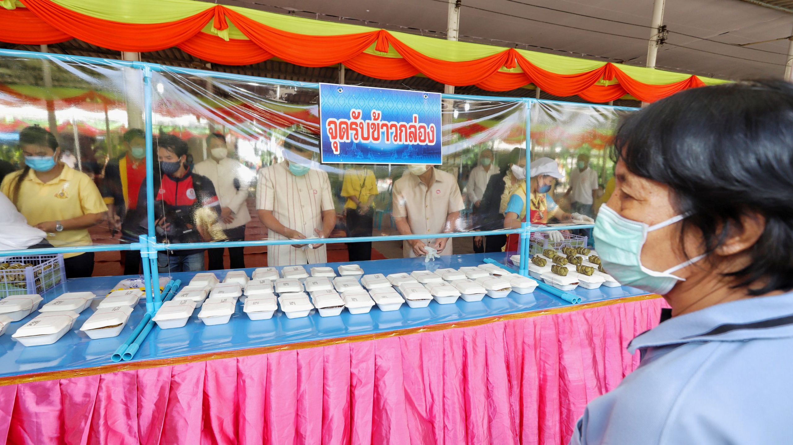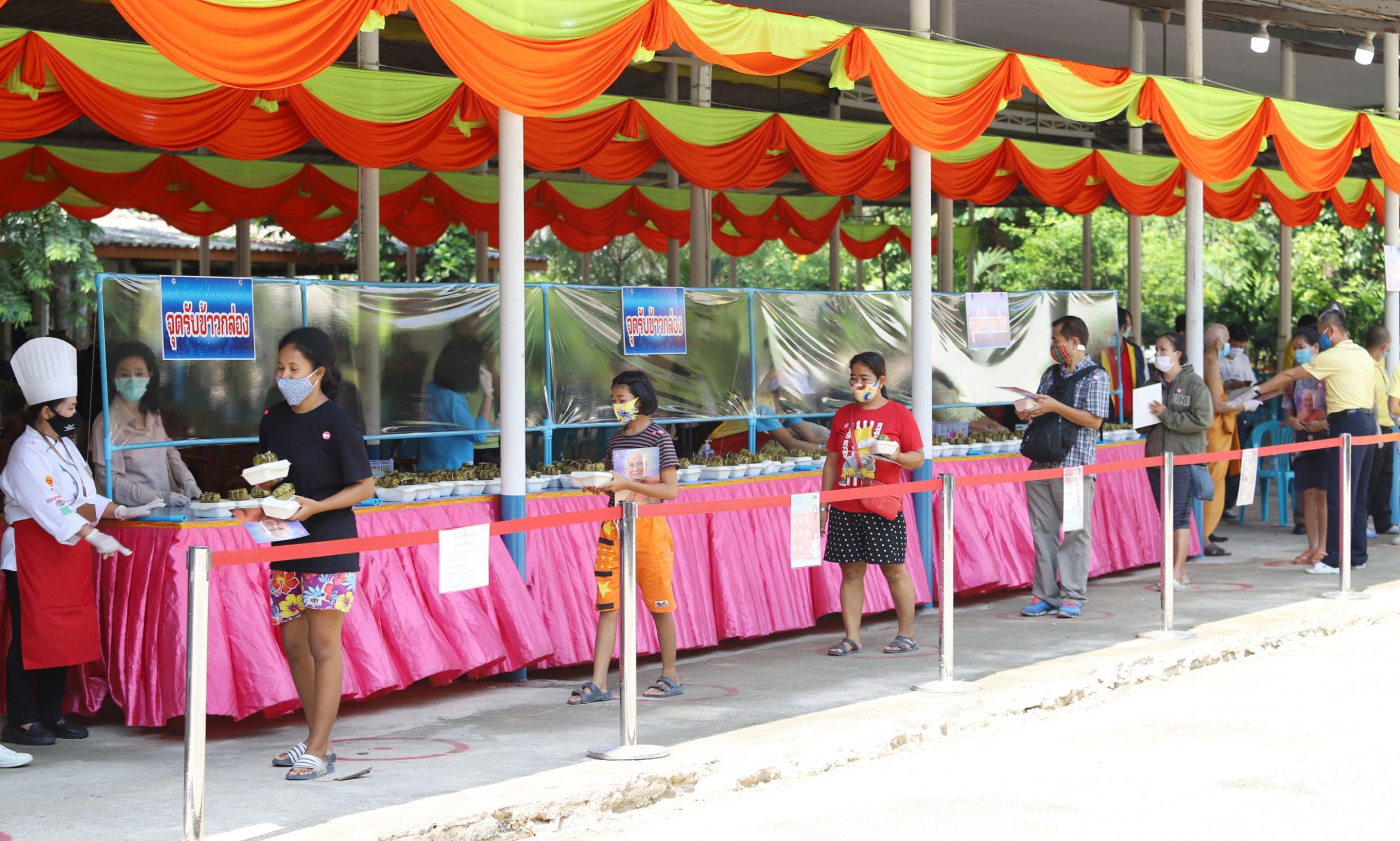 ทั้งนี้ผู้ที่มารับข้าวกล่องจะต้องผ่านจุดคัดกรองบริเวณด้านหน้า มีการตรวจวัดอุณหภูมิ ล้างมือด้วยเจลแอลกอฮอล์ และต่อแถวเว้นระยะห่างอย่างน้อย 1 เมตร โดยทางวัดจะทำฉากพลาสติกกั้นไว้ระหว่างผู้รับกับผู้มอบอาหาร เมื่อรับข้าวกล่องแล้วจะต้องกลับบ้านทันทีการจัดตั้งโรงทานและการแจกจ่าย ให้เป็นไปตามหลักสุขอนามัย โดยไม่มีการจัดพิธีการ พิธีกรรม กิจกรรม หรือการบริหารจัดการใดๆ ที่มีบุคคลจำนวนมากมารวมตัวกัน รวมทั้งให้ปฏิบัติตามคำสั่ง มาตรการ และคำแนะนำของทางราชการอย่างเคร่งครัด