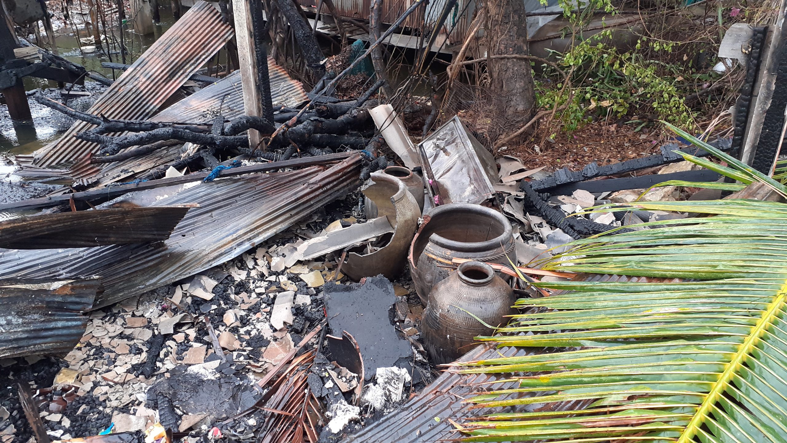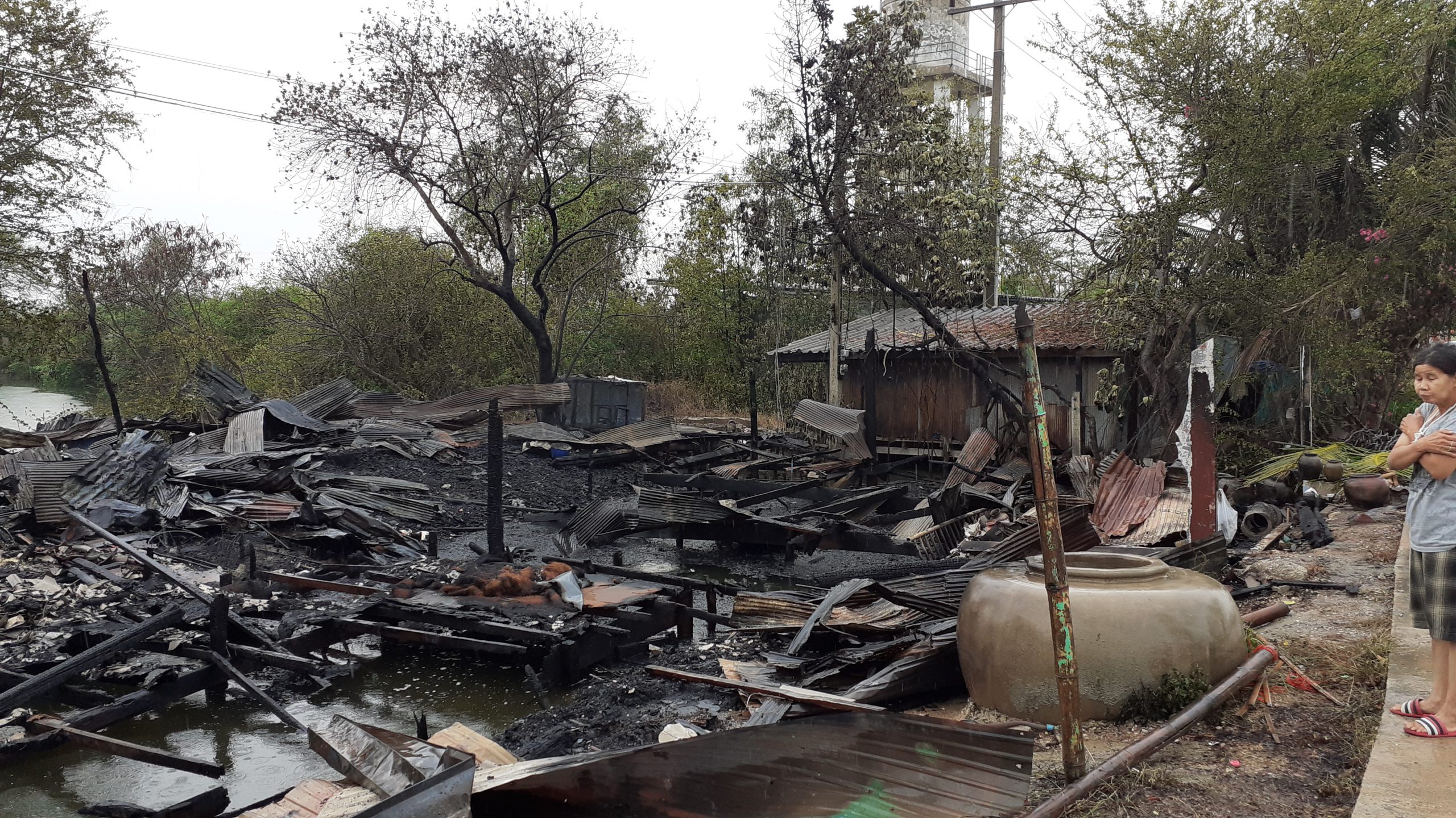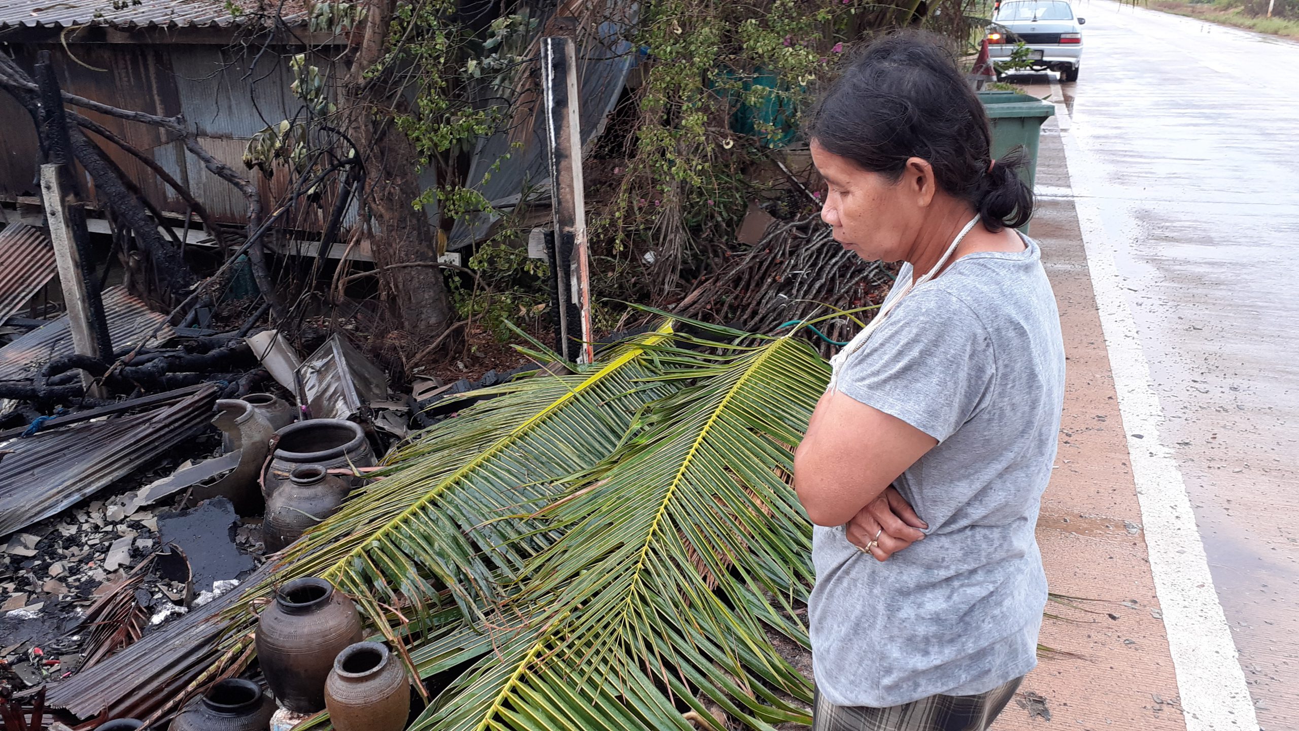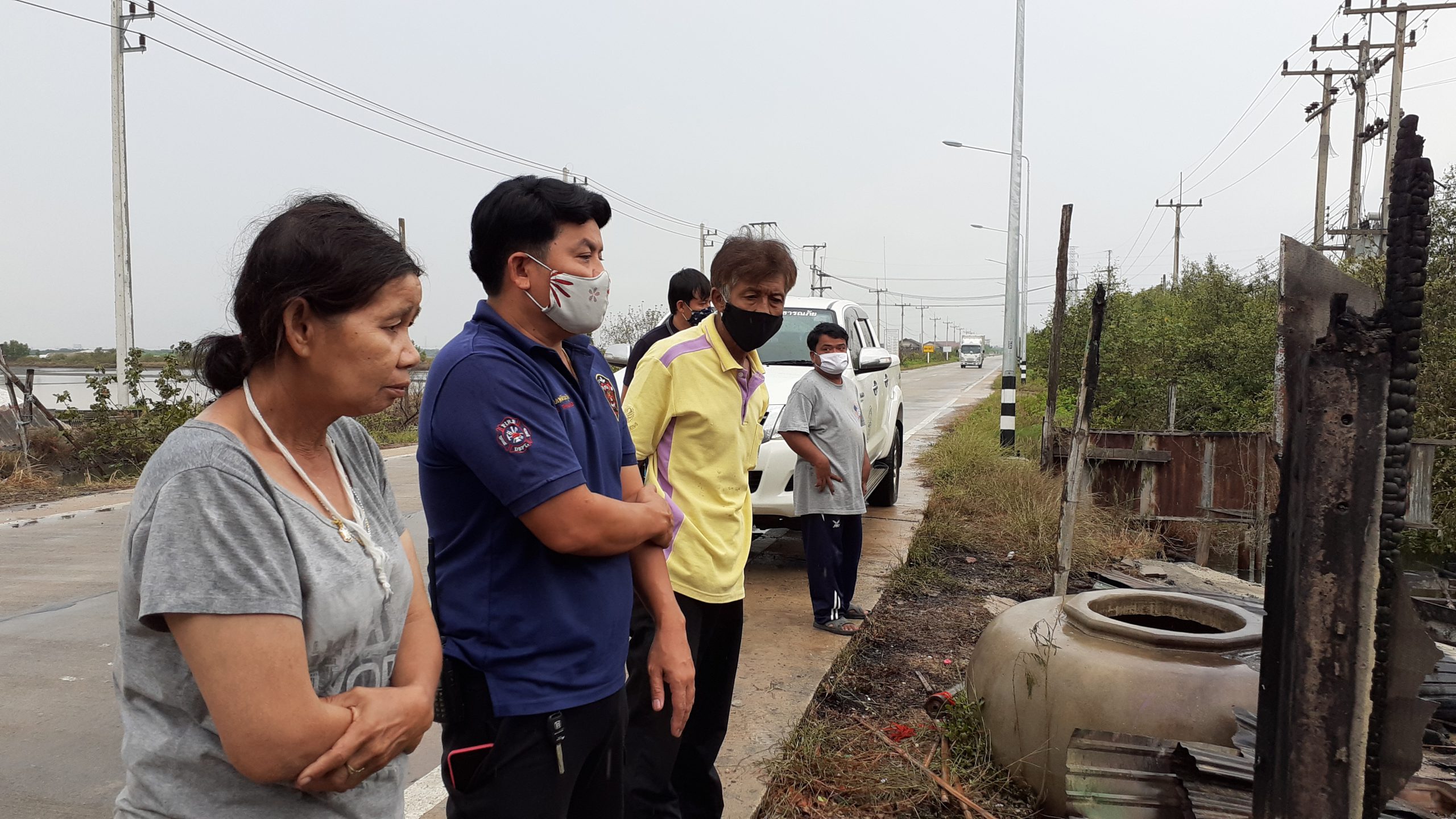 ตนจึงรีบโทรขอความช่วยเหลือจากเจ้าหน้าที่อย่างเร่งด่วนและรีบตะโกนเรียกหลานชายที่อยู่ในบ้านซึ่งมีอาการป่วยฯแต่ก็ไม่มีเสียงตอบจากนั้นตนกับสามีจึงตัดสินใจลงไปในน้ำข้างบ้านเพื่อช่วยกันเอาน้ำสาดบ้านของตนเพื่อไม่ให้ไฟลุกลามมาถึงบ้านตน นางลินดา ยังกล่าวอีกว่าในขนาดนั้นในคูน้ำข้างบ้านนั้นน้ำก็ร้อนมากแต่ก็ต้องทนและก็ไม่ได้นึกถึงกระแสไฟฟ้าว่าจะรั่วหรือไม่นึกอย่างเดียวเพื่อไม่ให้ไฟลุกลามมาที่บ้านของตน นางลินดา ยังเล่าอีกว่าภายในที่ถูกเพลิงไหม้มีเครื่องลายครามและของเก่าที่เก็บมาตั้งแต่รุ่นพ่อแม่และที่หลานชายได้หามาสะสมไว้เป็นจำนวนมากเสียหายทั้งหมดตนรู้สึกเสียดายส่วนหลานที่ป่วยฯนั้นเจอตัวแล้วในช่วงเช้าโดยสอบถามได้ความว่าได้วิ่งหนีข้ามฝั่งถนนไปหลบอยู่ในกองเกลือแต่ไม่ได้รับบาดเจ็บแต่อย่างไรตนก็รู้สึกโล่งใจที่หลานชายปลอดภัยส่วนค่าทรัพย์ที่ได้รับความเสียหายที่รายงานทีแรกว่าประมาณ 200000 บาทนั้นจากการตรวจสอบอีกครั้งน่าจะอยู่ประมาณ 300000 บาทเพราะเครื่องลายครามและของเก่าที่เก็บไว้ล้วนแต่มีราคา