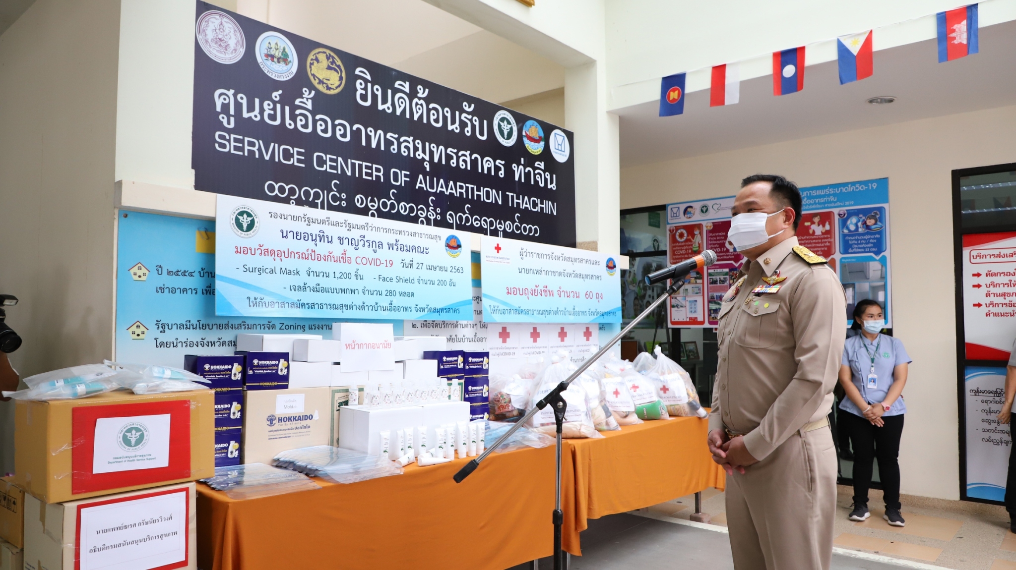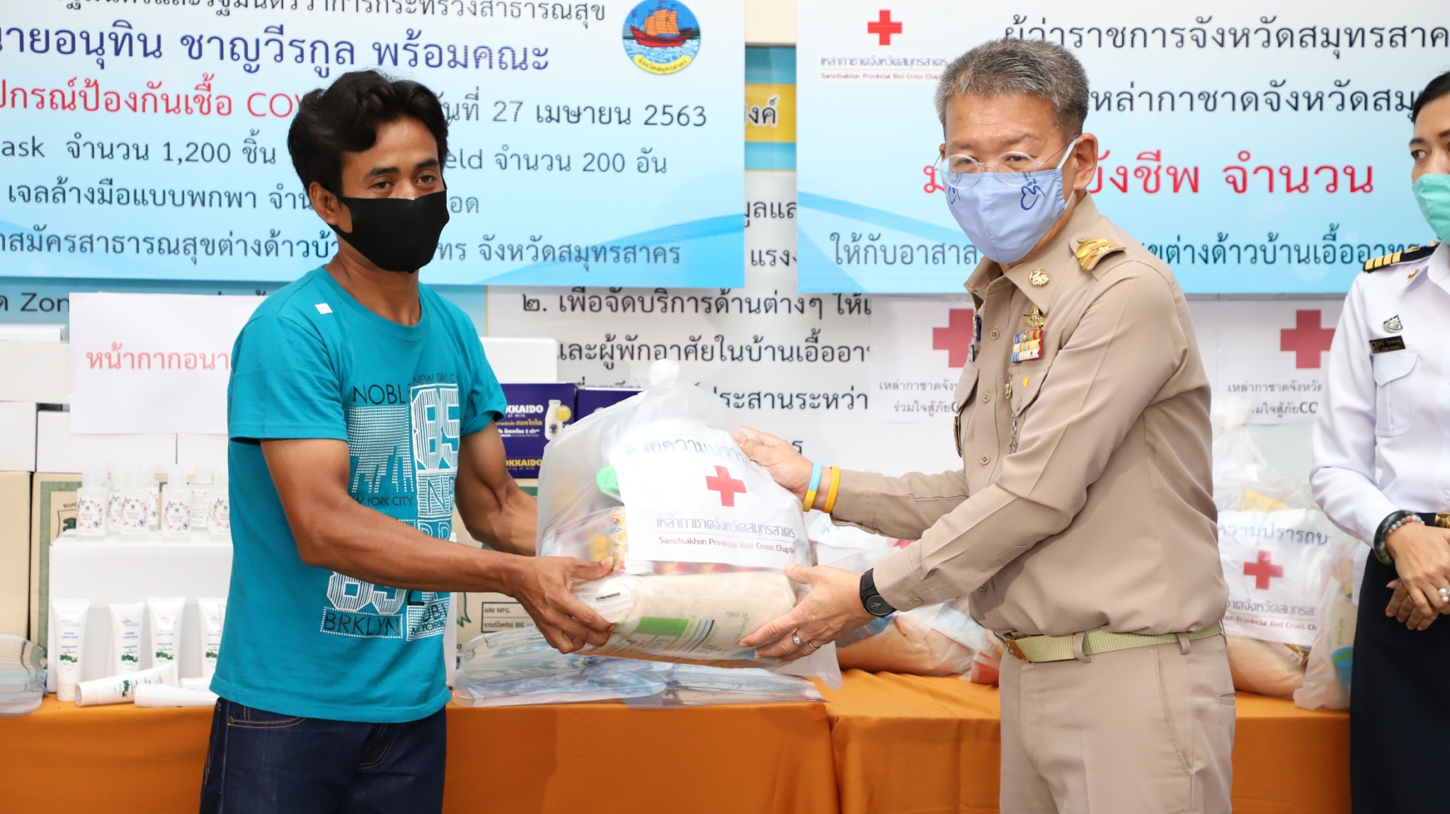 โดยทางด้านนายวีระศักดิ์ วิจิตร์แสงศรี ผู้ว่าราชการจังหวัดสมุทรสาคร กล่าวว่าจังหวัดสมุทรสาครมีอัตราการเติบโตทางเศรษฐกิจและอุตสาหกรรมเป็นอันดับต้นๆของประเทศมีประชากรหลัก584,703คน นอกจากนี้ยังมีประชากรต่างด้าวที่เข้ามาทำงานและมีใบอนุญาติจำนวน 268,084คน ปัจจัยดังกล่าวทำให้สมุทรสาครต้องวางมาตรการในการป้องกันโรค การติดตามข้อมูล ข้อสั่งการจากส่วนกลางแปลงสู่การปฏิบัติอย่างต่อเนื่อง ตั้งแต่การบริหารจัดการด้านสาธารณสุขแก่ประชาชนชาวไทยและชาวต่างชาติโดยการประสานข้อมูลการทำประกันสังคม การส่งเสริมกลไก อาสาสมัครสาธารณสุขประจำหมู่บ้านหรืออสม. การจัดตั้งกลไกอาสาสมัครสาธารณสุขต่างด้าวหรือ อสต. เป็นพลังขับเคลื่อนเพื่อช่วยเสริมสร้างภูมิคุ้มกัน สร้างความรู้ความเข้าใจและป้องกันโรคของแรงงานชาวไทยและแรงงานต่างชาติ การจัดตั้งโรงพยาบาลสนาม การจัดตั้งLocal quarantine ทั้ง3 อำเภอ โดยสถานการณ์ที่เกิดการระบาดของโรคติดเชื้อไวรัสโคโรนา2019 นั้นจังหวัดสมุทรสาครได้ดำเนินการเฝ้าระวังค้นหาผู้ติดเชื้ออย่างต่อเนื่อง โดยดำเนินการตั้งแต่ 27 มกราคม 2563 ถึงปัจจุบันรวมจำนวนเฝ้าระวังสะสม1,008 ราย จำนวนนี้เฝ้าระวังครบ14วันยืนยันไม่พบเชื้อจำนวน 525 ราย อยู่ในระยะเฝ้าระวัง 14วันจำนวน459ราย ย้ายนอกจังหวัด 23 รายพบผู้ติดเชื้อ 18 ราย รักษาหายแล้ว16 ราย ส่งต่อ 1 รายคงเหลือรักษา1 ราย และไม่พบมีผู้ติดเชื้อไวรัสโคโรนา2019 ในกลุ่มแรงงานต่างด้าวของจังหวัดสมุทรสาคร