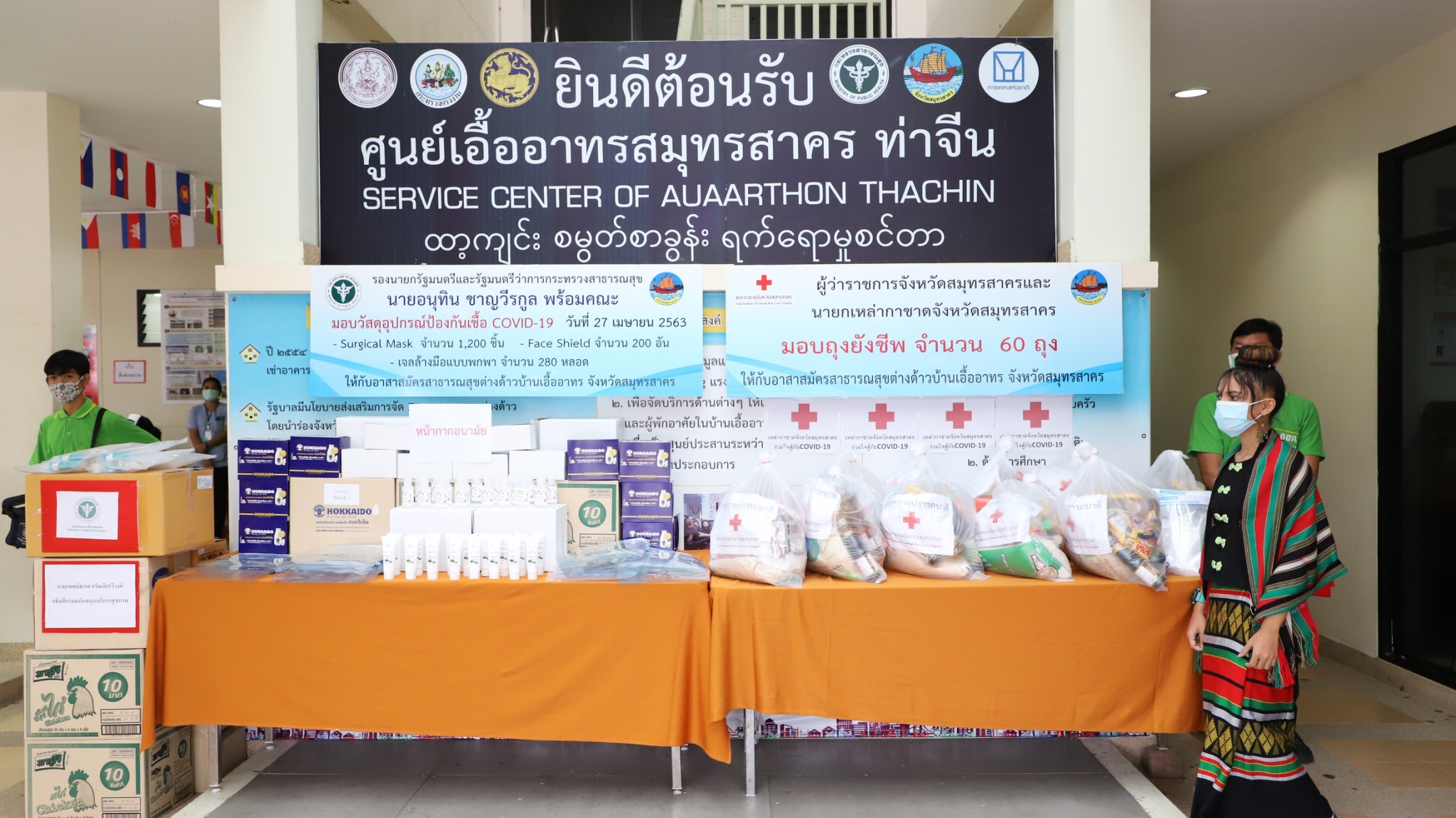 เมื่อเวลา 14.30 น.ของวันที่ 27 เมษายน 2563นายอนุทิน ชาญวีรกูล รองนายกรัฐมนตรีและรมว.สาธารณสุข พร้อมคณะเดินทางมาตรวจเยี่ยมการดำเนินงานป้องกันโรคติดเชื้อไวรัสโคโรนา2019 และแถลงข่าวการตรวจคัดกรองโควิด-19 เชิงรุกในกลุ่มแรงงานต่างด้าวจังหวัดสมุทรสาคร ที่โรงพยาบาลนครท่าฉลอม ต.ท่าฉลอม อ.เมือง จ.สมุทรสาคร โดยมีนายวีระศักดิ์ วิจิตร์แสงศรี ผู้ว่าราชการจังหวัดสมุทรสาครพร้อมนายแพทย์สาธารณสุขจังหวัดสมุทรสาคร ผู้อำนวยการโรงพยาบาลในพื้นที่จังหวัดสมุทรสาคร ผู้แทนส่วนราชการที่เกี่ยวข้อง และอสม.ในพื้นที่จังหวัดสมุทรสาครร่วมต้อนรับ โดยทางด้านนายอนุทิน ชาญวีรกูล รองนายกรัฐมนตรีและรมว.สาธารณสุข ได้ชมวีดีทัศน์ สมุทรสาครร่วมใจสวมหน้ากากสู้ภัยCovud-19 พร้อมกล่าวให้ขวัญกำลังใจผู้ปฏิบัติงานพร้อมมอบวัสดุอุปกรณ์การแพทย์ก่อนเดินทางไปบ้านเอื้ออาทร การเคหะท่าจีน ม.7 ต.ท่าจีน อ.เมืองสมุทรสาคร เพื่อเยี่ยมชมศูนย์สาธารณสุขชุมชนต่างด้าวและหอพักต้นแบบต่างด้าว
