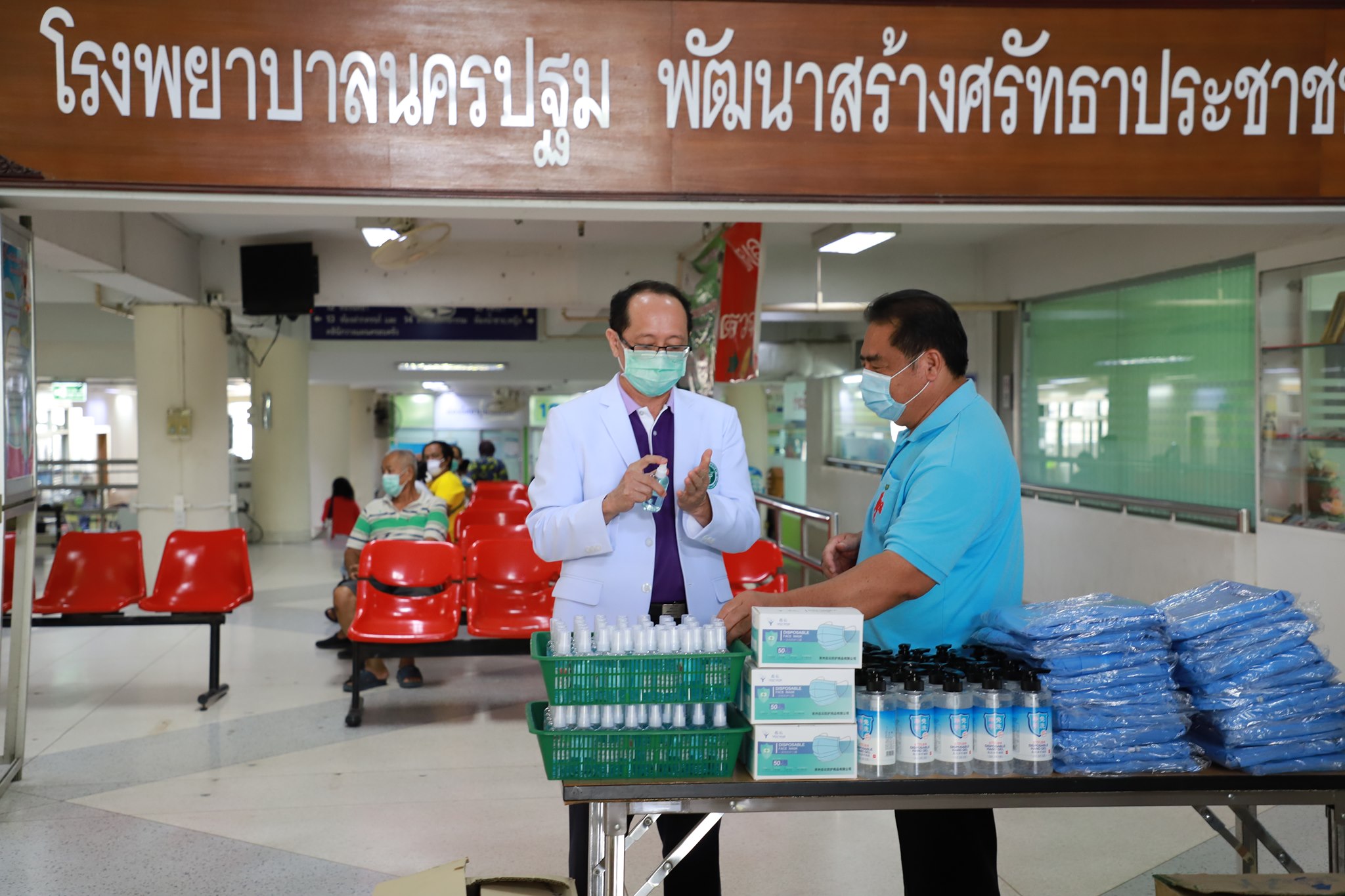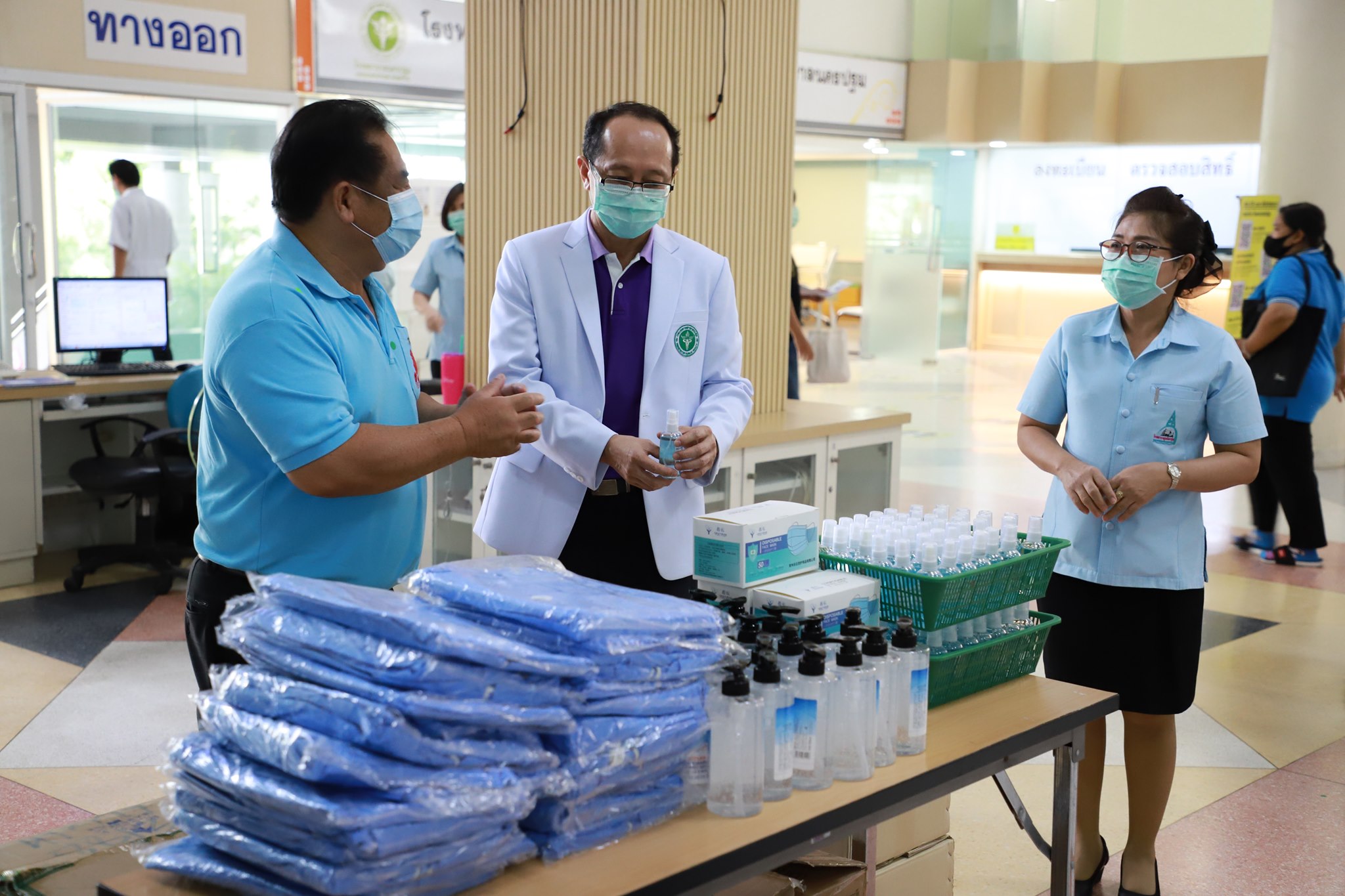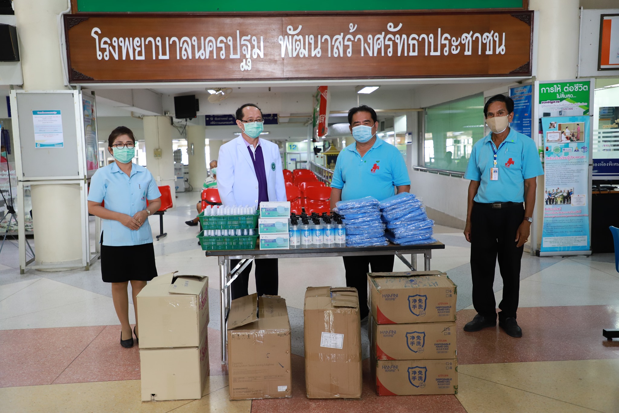 กองบุญเมืองไร่ขิงและเพื่อน โดยนายจำรัส ตั้งตระกูลธรรม นายกเทศมนตรีเมืองไร่ขิง อ.สามพราน จ.นครปฐม มอบชุดป้องกันเชื้อโรค จำนวน 70 ชุด หน้ากากอนามัย MASK ป้องกันเชื้อโรค จำนวน 50 กล่อง และเจลแอลกอฮอล์ล้างมือจำนวน 100 ขวด ให้โรงพยาบาลนครปฐม รับมอบโดย นายแพทย์วัลลภ อดุลยเกษม รองผู้อำนวยการฝ่ายบริการ โรงพยาบาลนครปฐม