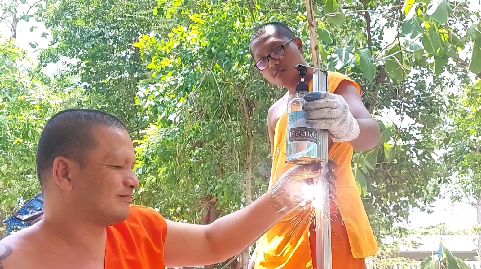 สระบุรี พระจิตอาสา ทำเครื่องกดเจล/แอลกอฮอล์แบบเท้าเหยียบถวายวัดและมอบให้โรงพยาบาล