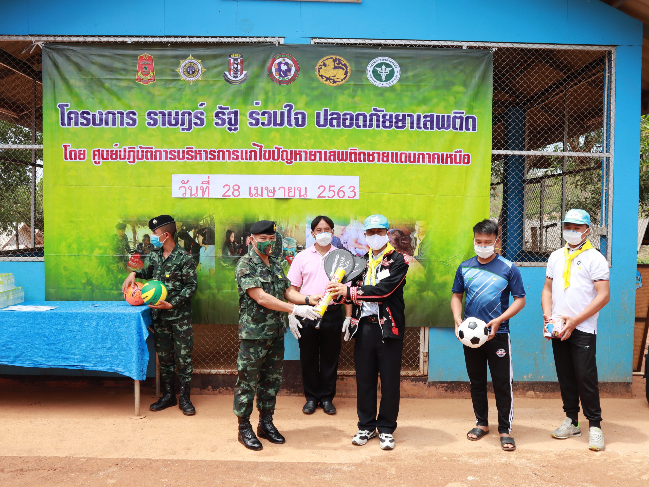 “ทหารไม่ทิ้งประชาชน ส่งกำลังใจสู่ชุมชนในพื้นที่ห่างไกล” ศูนย์ปฏิบัติการบริหารการแก้ไขปัญหายาเสพติดชายแดนภาคเหนือ จัดโครงการราษฎร์รัฐร่วมใจปลอดภัยยาเสพติด ส่งกำลังใจสู้โควิด – 19 โดยมอบถุงยังชีพ ไข่ไก่ ข้าวกล่อง จำนวน ๑๐๐ กล่อง น้ำดื่ม หน้ากากอนามัยแบบผ้า พร้อมอุปกรณ์กีฬา ให้แก่ผู้ที่ได้รับผลกระทบจากโรค ไวรัส โควิด –19ในพื้นที่ห่างไกล