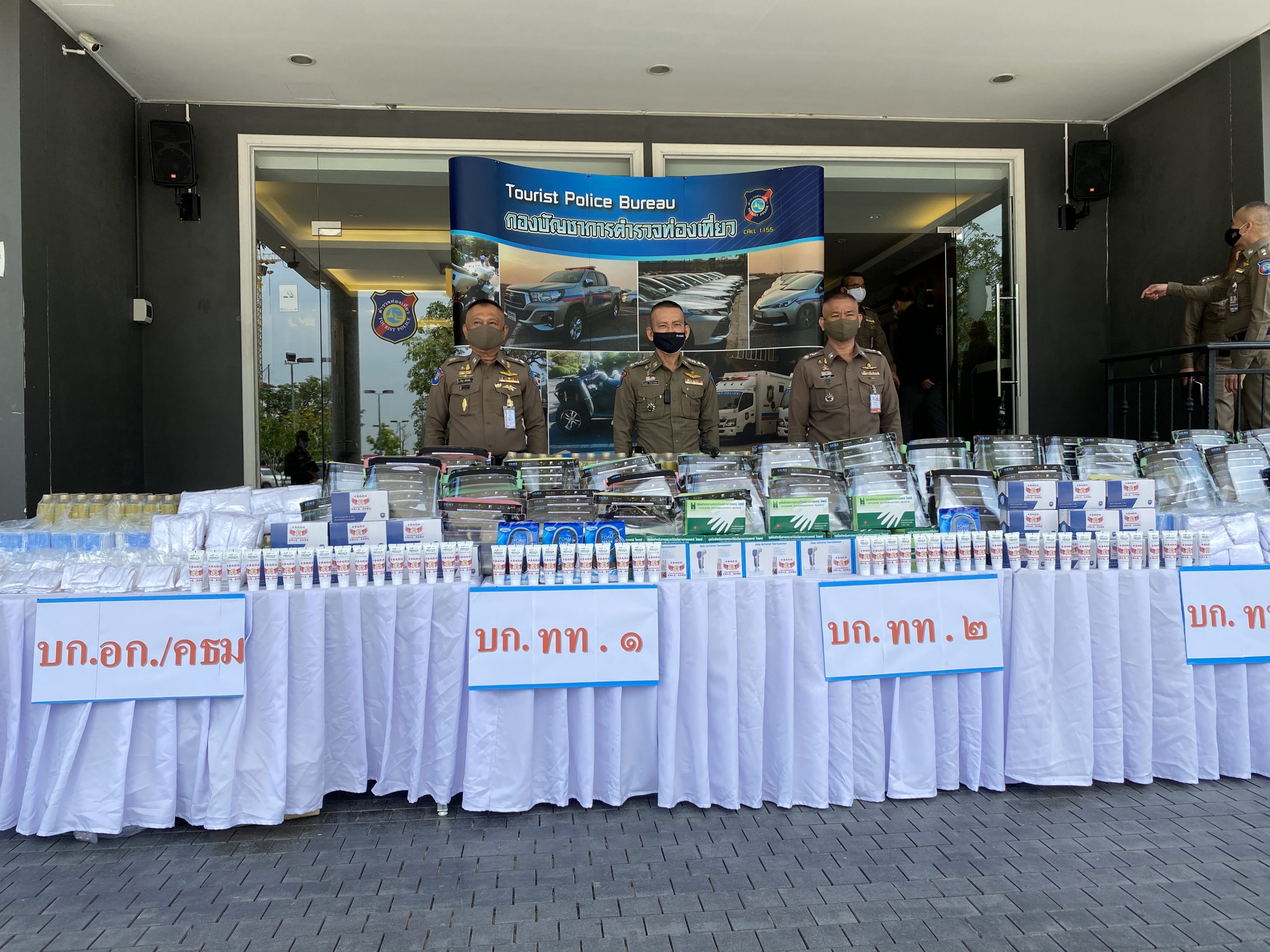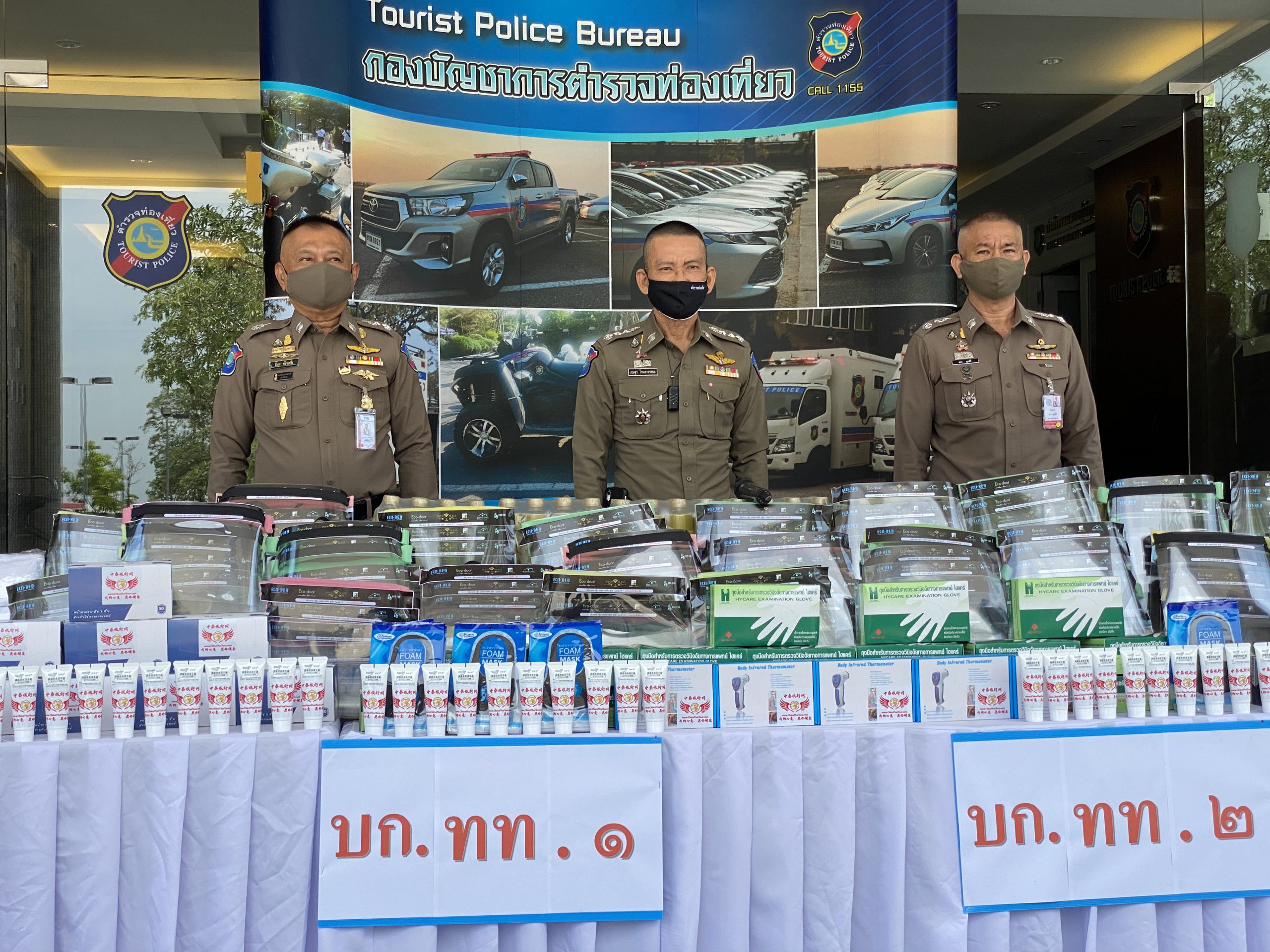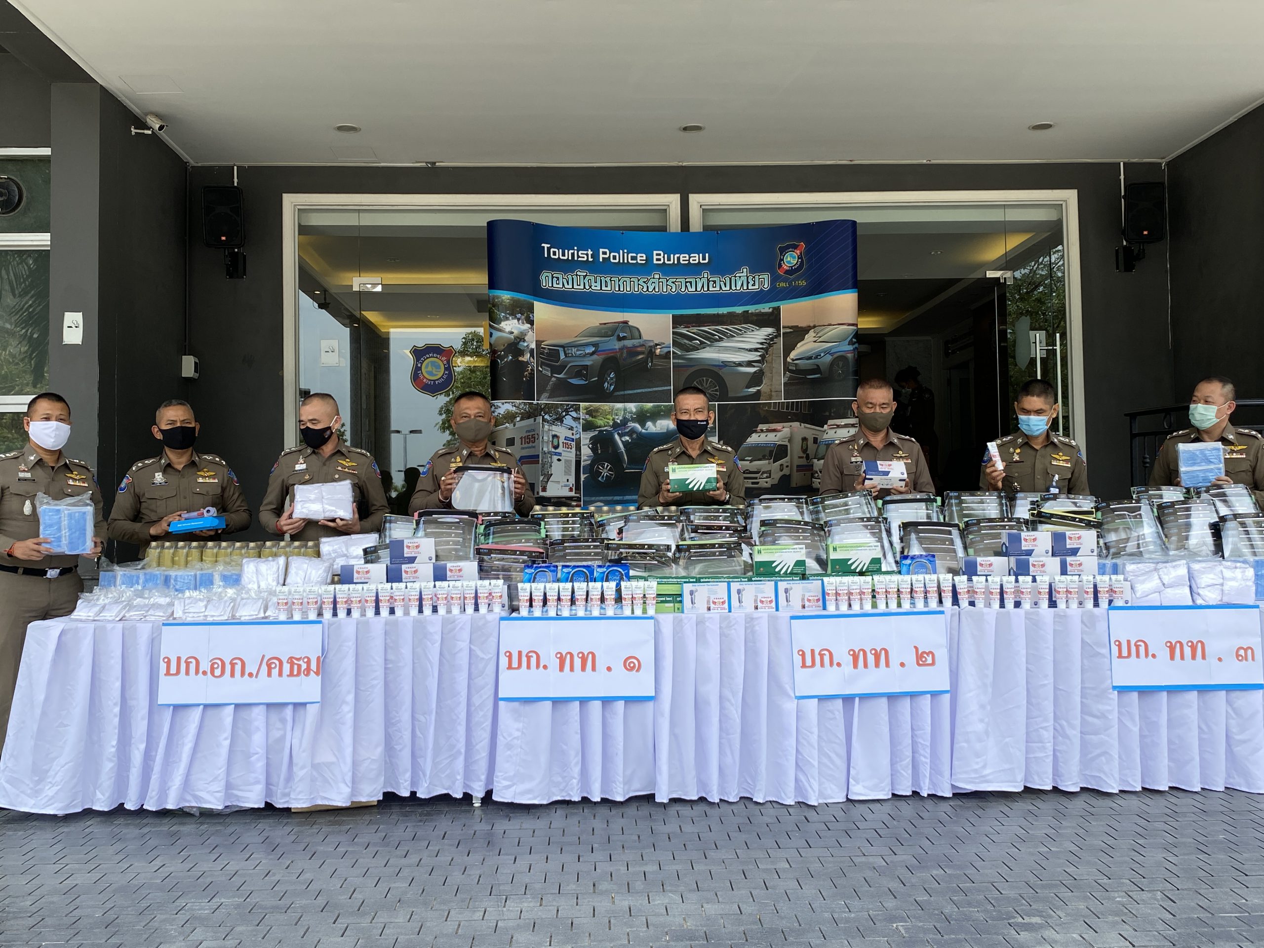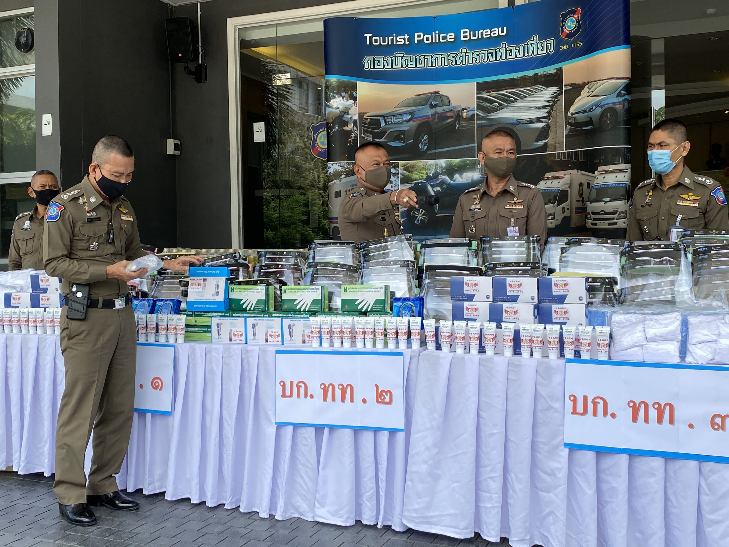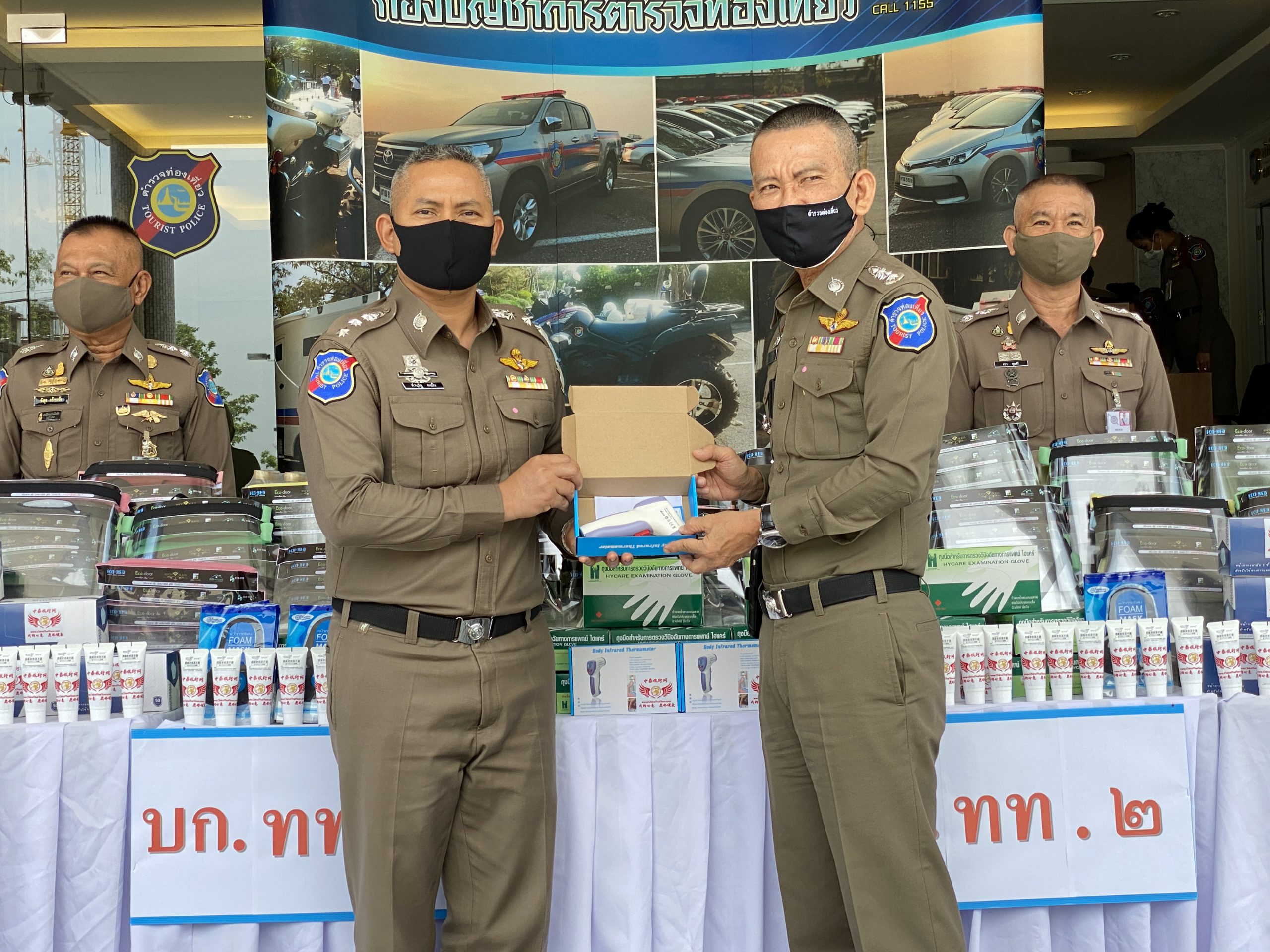 ได้แก่ หน้ากากอนามัยแบบผ้า 1,625 ชิ้น หน้ากากอนามัยแบบการทางการแพทย์ 4,000 ชิ้น ถุงมือยางทางการแพทย์ 2,500 คู่ แอลกอฮอเจล 48 หลอด หน้ากาก Face Shieid 300 อัน เครื่องวัดอุณหภูมิแบบมือถือ(ทอมอมิเตอร์)จำนวน 5 เครื่องพร้อมน้ำดื่ม 2,400 ขวด โดยมีพล.ต.ต.มานัด ศรีวงษา ผบก.อก.ทท. และผู้แทน ผบก. ทท.1-3 กองกำกับการควบคุมธุรกิจนำเที่ยวและมัคคุเทศก์ กองบัญชาการตำรวจท่องเที่ยวผู้รับมอบ อุปกรณ์ป้องกันโรคติดเชื้อไวรัสโควิด-19 เพื่อใช้งานปฎิบัติหน้าที่ต่อไป