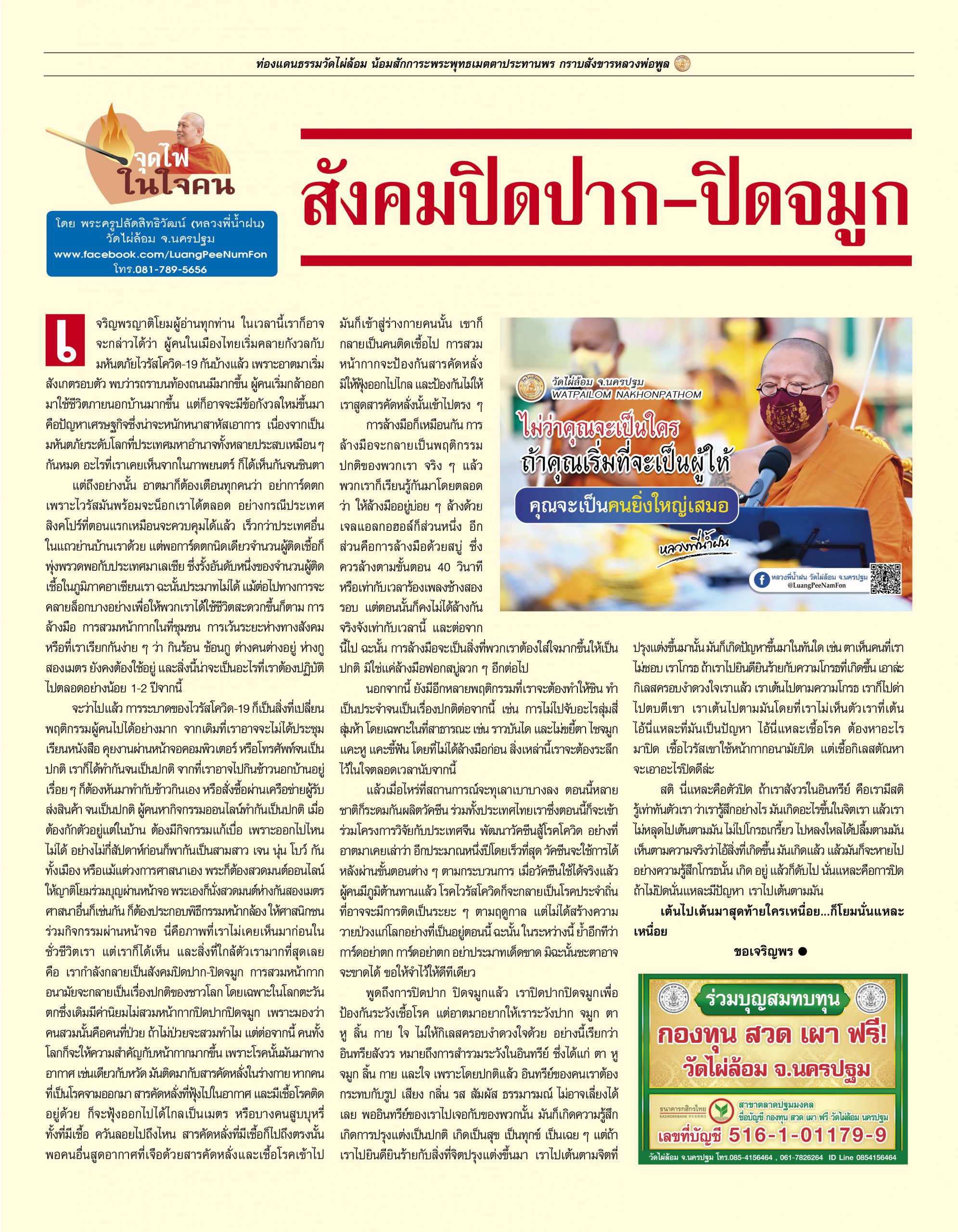 แล้วเมื่อไหร่ที่สถานการณ์จะทุเลาเบาบางลง ตอนนี้หลายชาติก็ระดมกันผลิตวัคซีน ร่วมทั้งประเทศไทยเราซึ่งตอนนี้ก็จะเข้าร่วมโครงการวิจัยกับประเทศจีน พัฒนาวัคซีนสู้โรคโควิด อย่างที่อาตมาเคยเล่าว่า อีกประมาณหนึ่งปีโดยเร็วที่สุด วัคซีนจะใช้การได้ หลังผ่านขั้นตอนต่าง ๆ ตามกระบวนการ เมื่อวัคซีนใช้ได้จริงแล้ว ผู้คนมีภูมิต้านทานแล้ว โรคไวรัสโควิดก็จะกลายเป็นโรคประจำถิ่นที่อาจจะมีการติดเป็นระยะ ๆ ตามฤดูกาล แต่ไม่ได้สร้างความวายป่วงแก่โลกอย่างที่เป็นอยู่ตอนนี้ ฉะนั้น ในระหว่างนี้ ย้ำอีกทีว่าการ์ดอย่าตก การ์ดอย่าตก อย่าประมาทเด็ดขาด มิฉะนั้นชะตาอาจจะขาดได้ ขอให้จำไว้ให้ดีทีเดียว